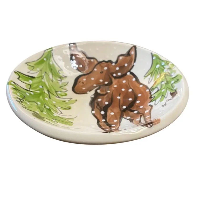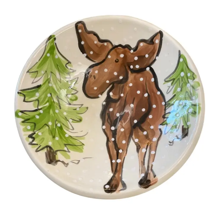 Signed Hand-painted Moose Bowl 1 1/2” X 6” The bowl is in good condition and could be used as a trinket dish. The snow dots are raised and have texture.