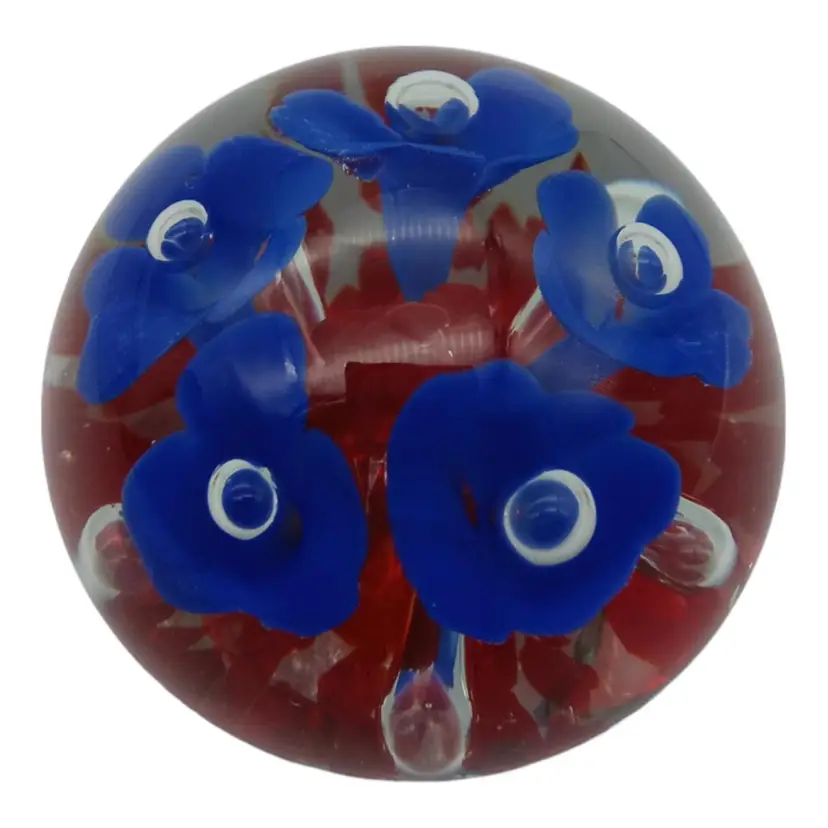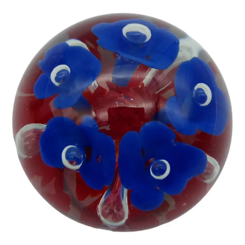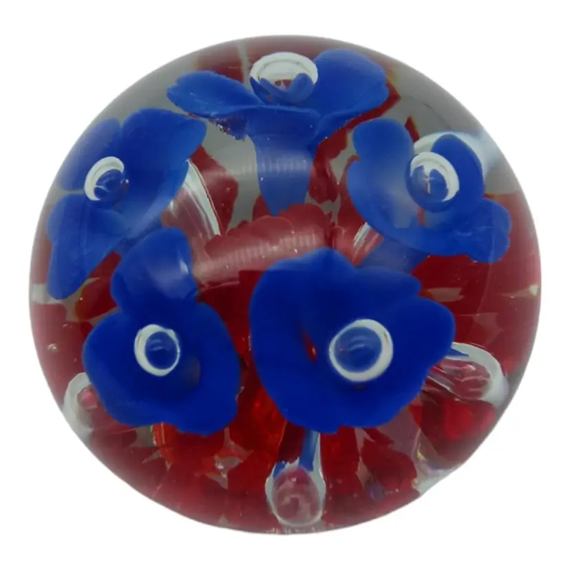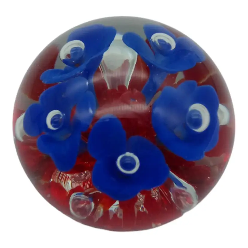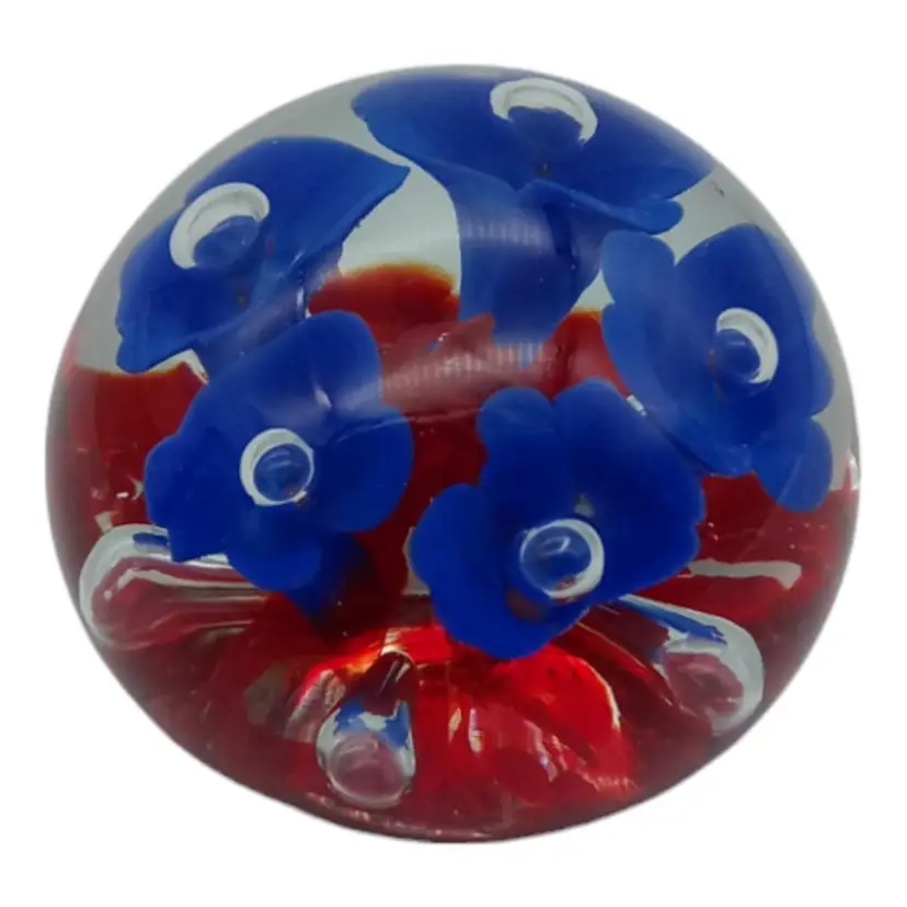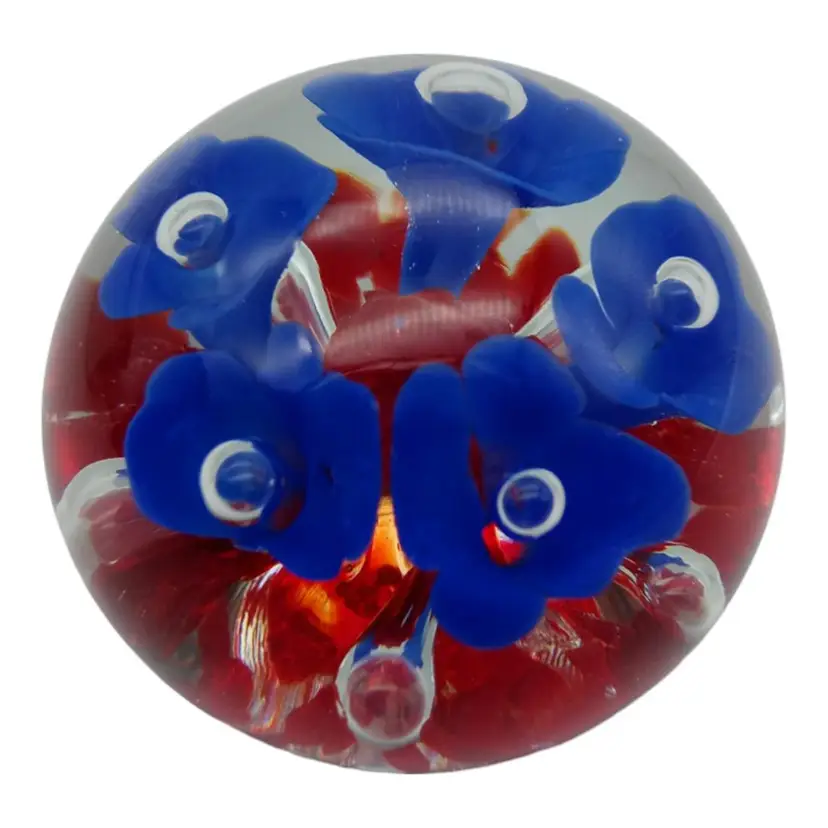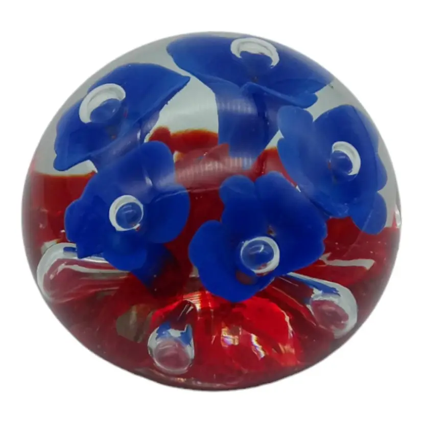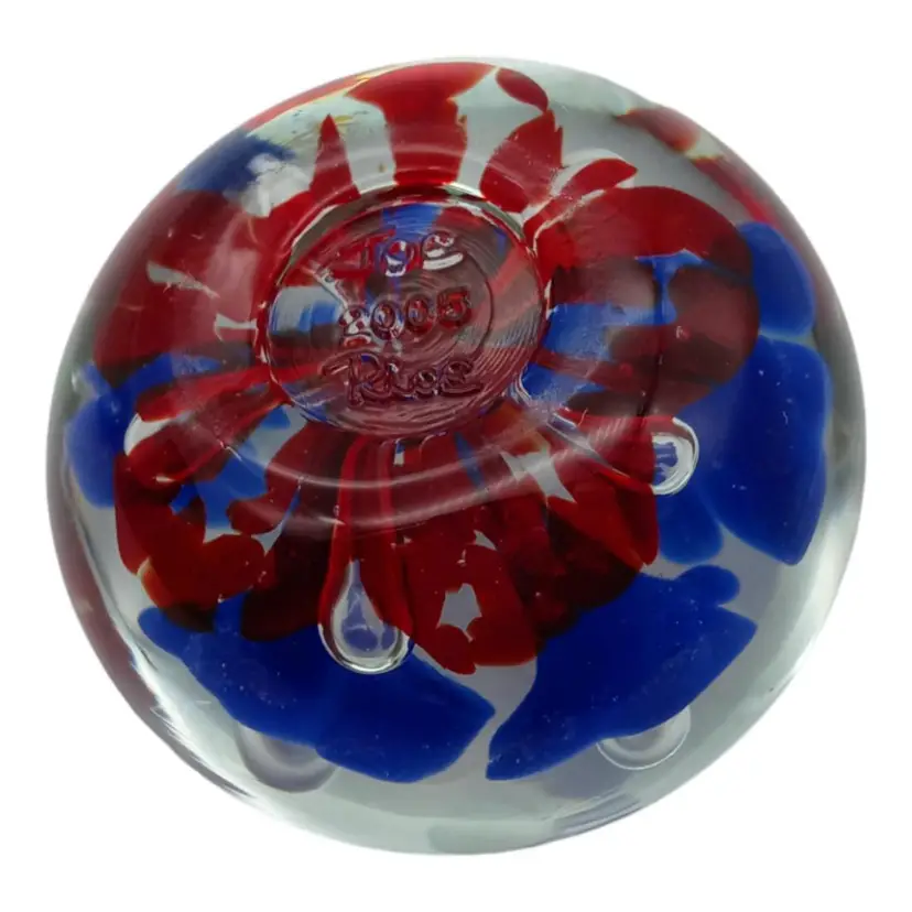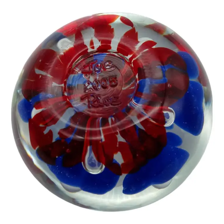 Capture the beauty of this Joe Rice handblown glass paperweight! Crafted with care in 2005, it's a stunning piece showcasing vibrant blue and red florals. Impeccably preserved with no chips, cracks, or damage, it stands at a graceful 2.5" tall and spans 2" wide. Elevate your desk or collection with this exquisite, timeless art piece!