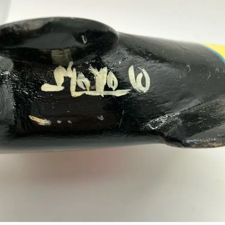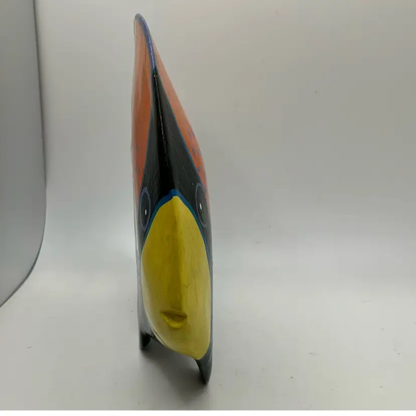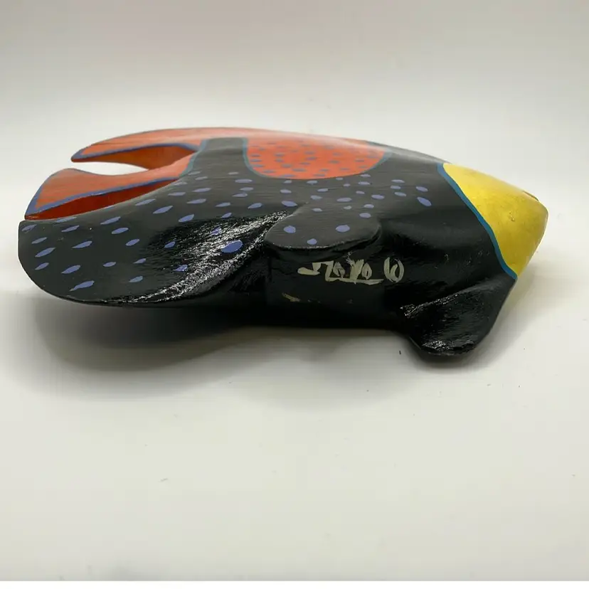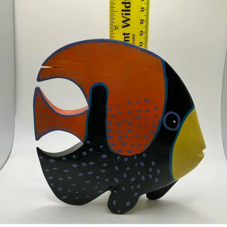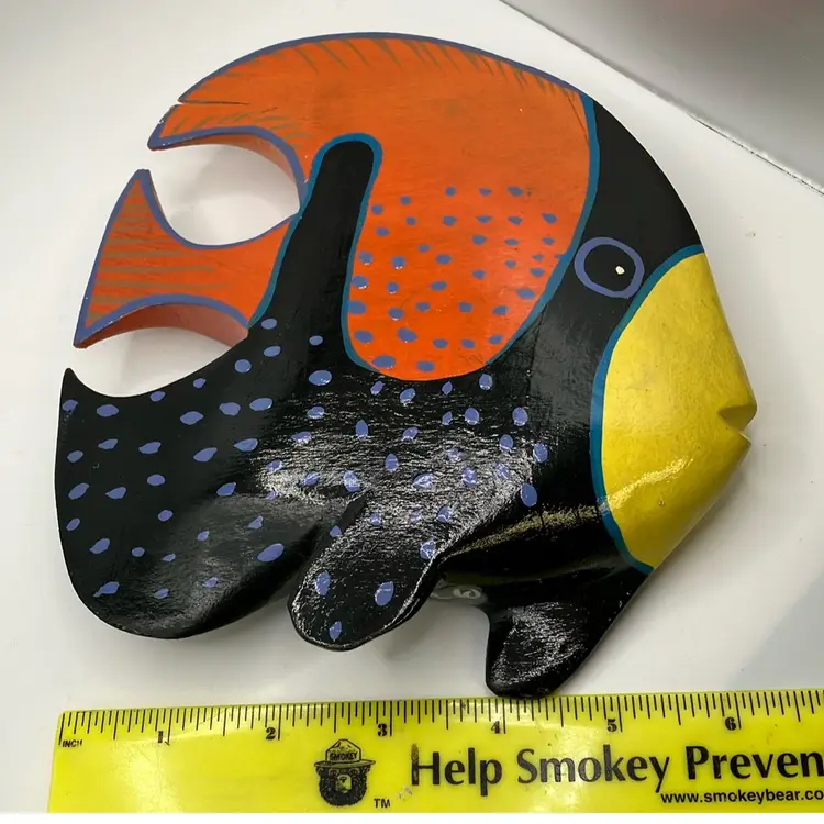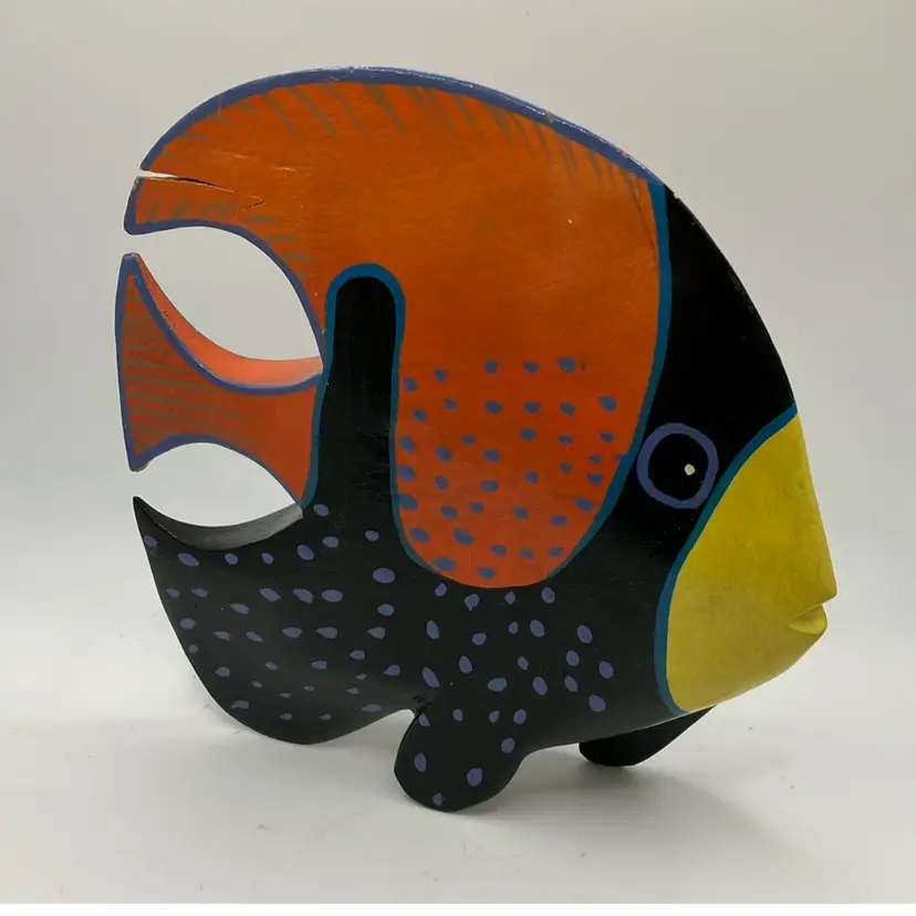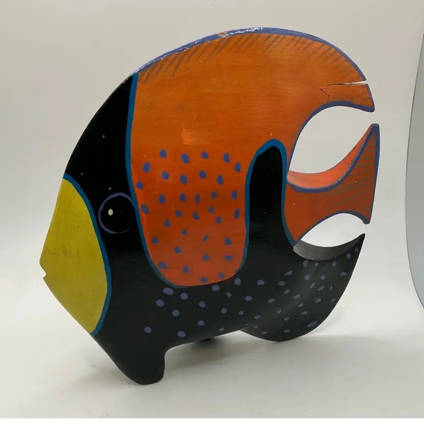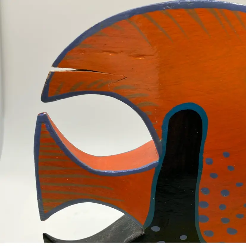 Wood is splitting on one fin in back - and a couple tiny spots of paint loss- still a cute, colorful fish! Price reflects imperfection.