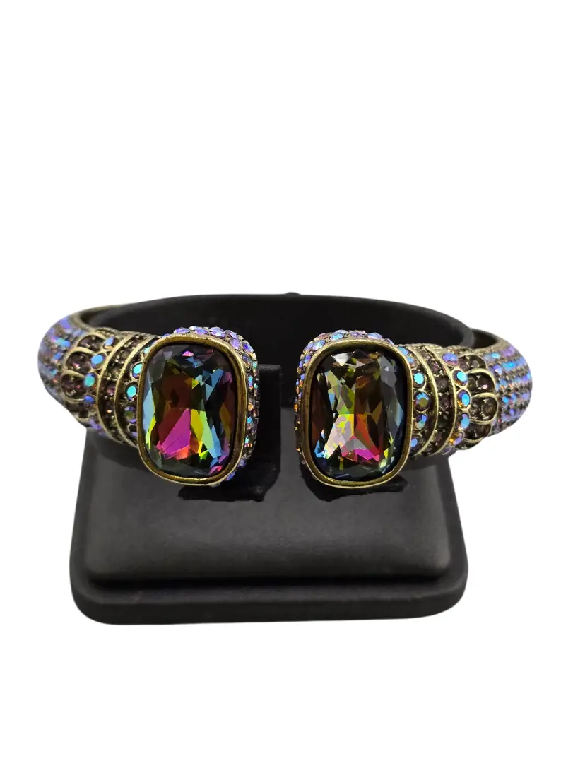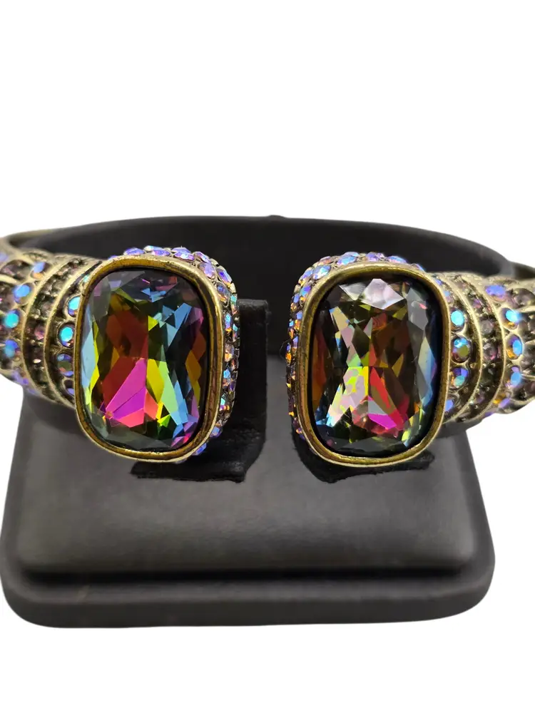 Size: 2.5" Inner diameter Condition: Very good vintage Signed: Heidi Daus CN Details: It features two large watermelon glass stones with vibrant rainbow iridescence. Stunning stones!