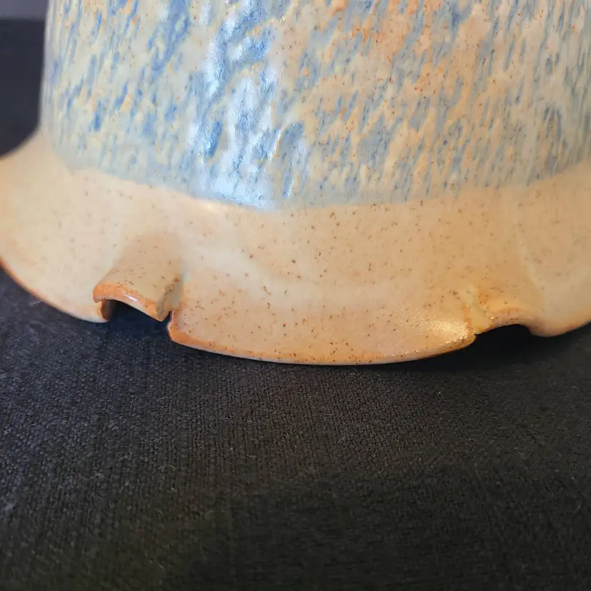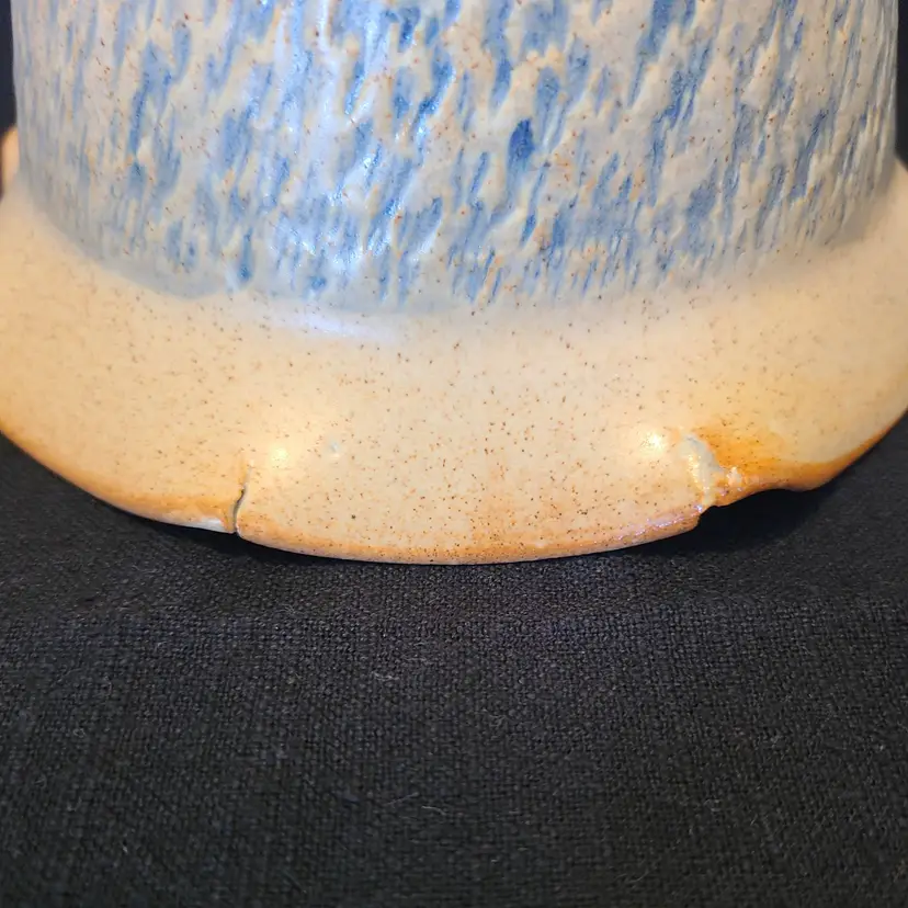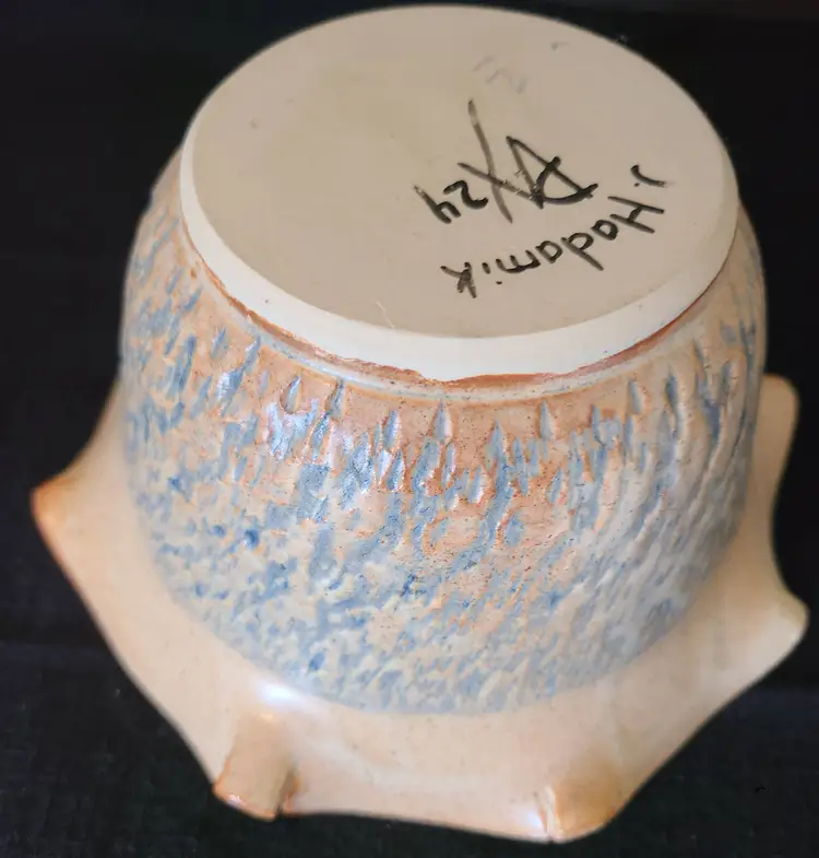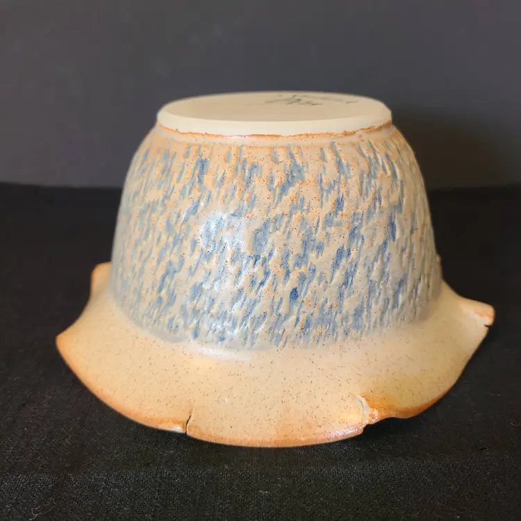 Beautiful and functional. Measures approx 6.5-6.75" in diameter and 3.5" tall. I assume the 24 on the bottom means 2024. Does not appear to be vintage either. No cracks, chips or crazing. Correction, there are cracks but they are part of the piece. Please look through pics and you'll understand what I mean. The inner glaze is a creamy tan with brown and rust colored speckles. The textured outer bowl glaze is light blue.