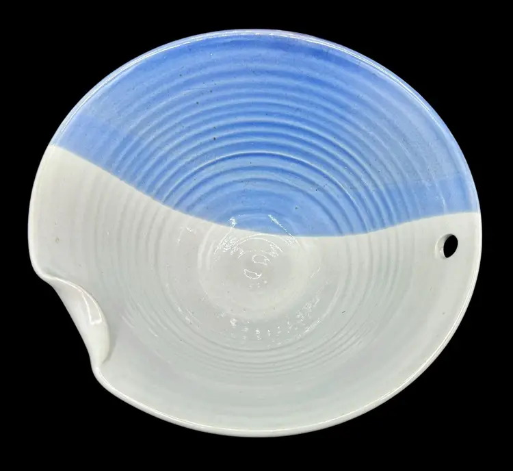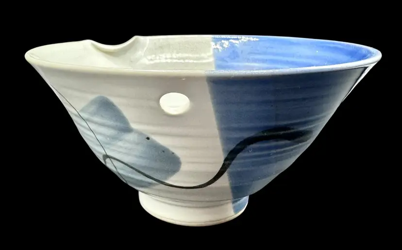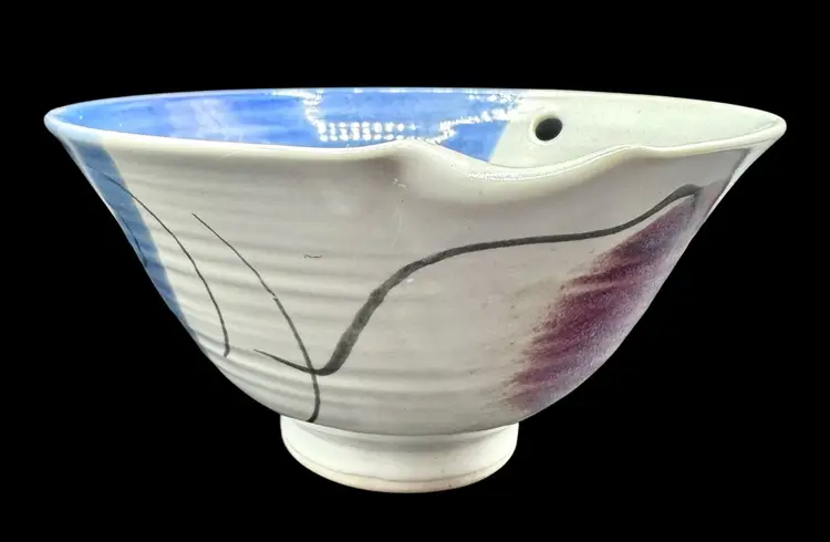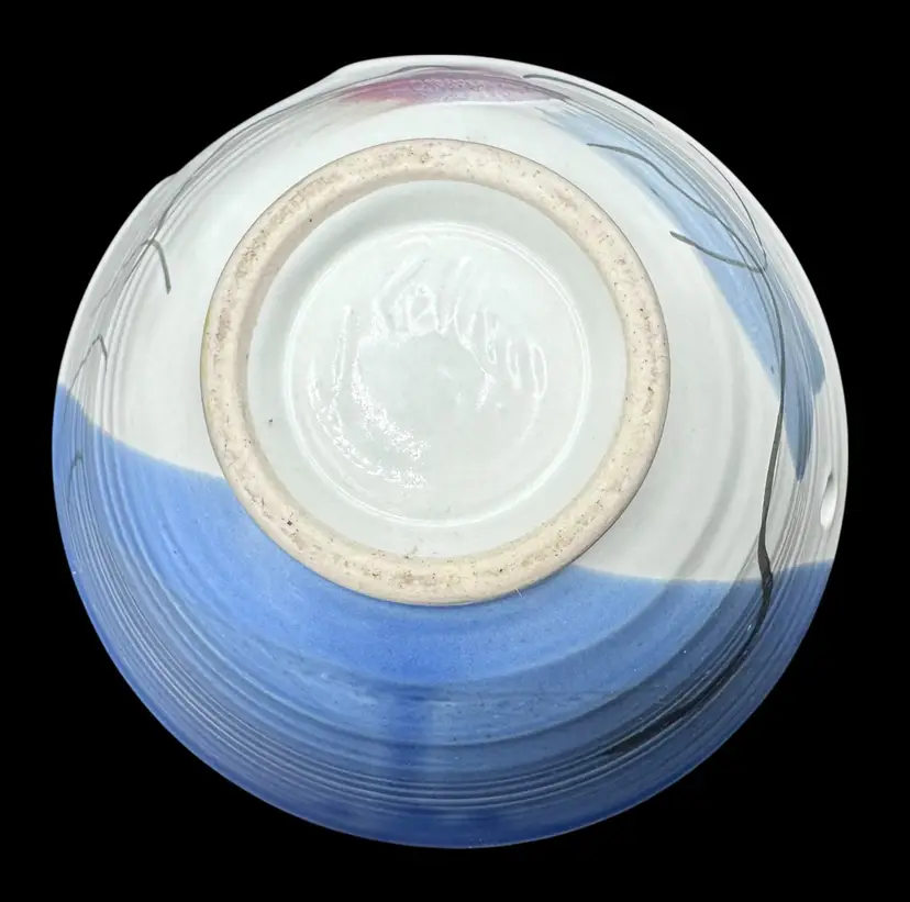 Large ramen bowl with built in chopstick rest. It has an abstract design in blue, white, red and black.