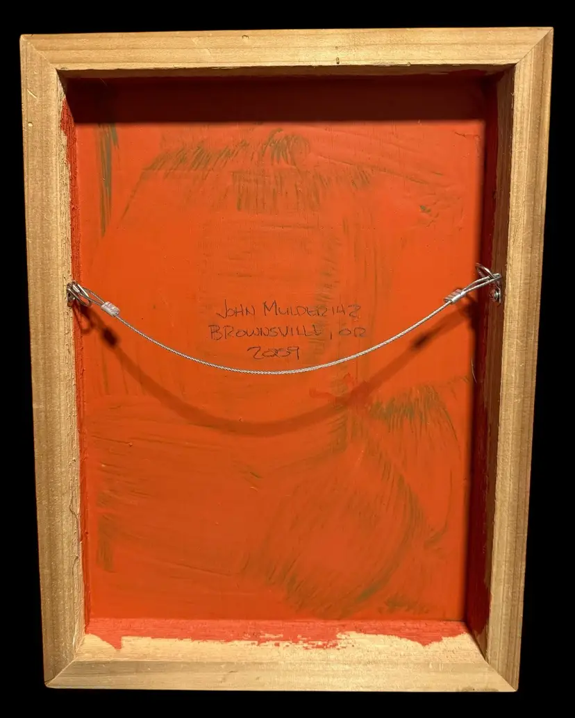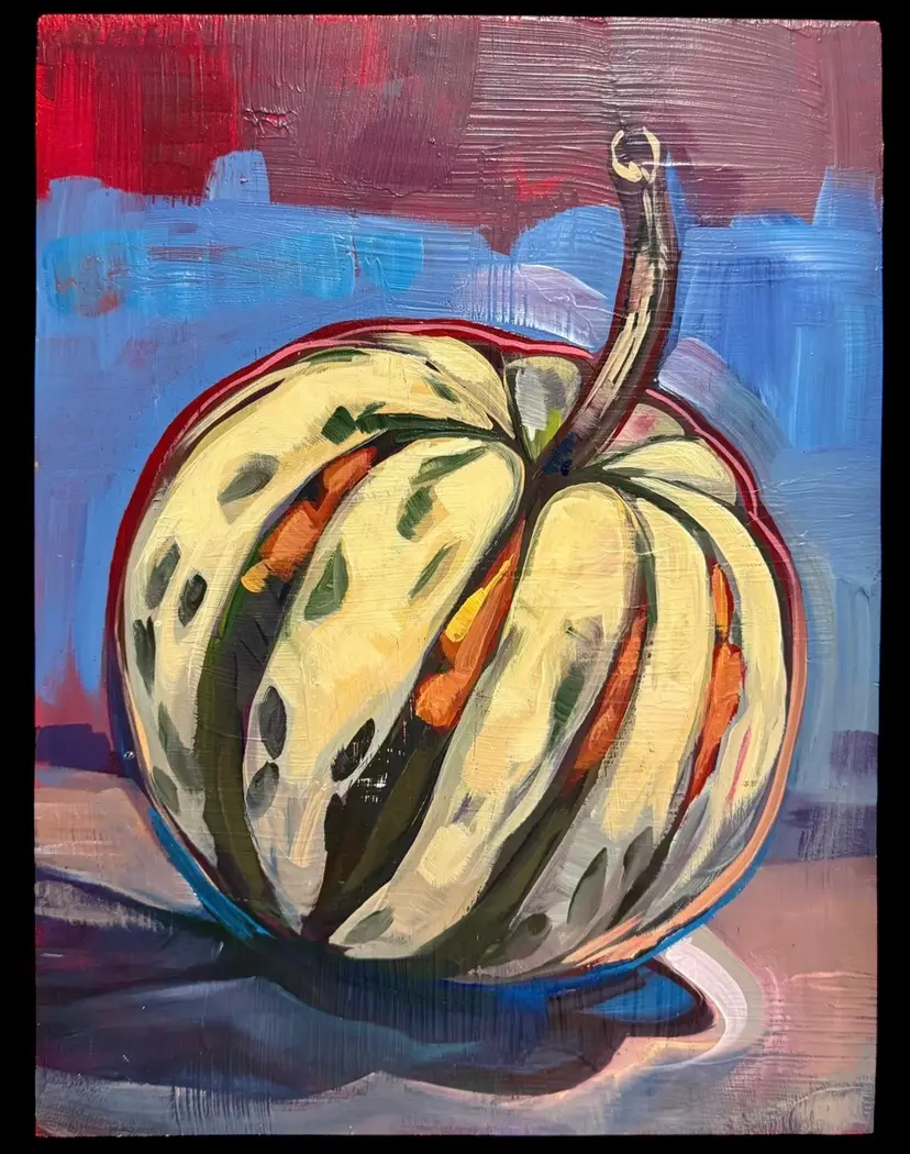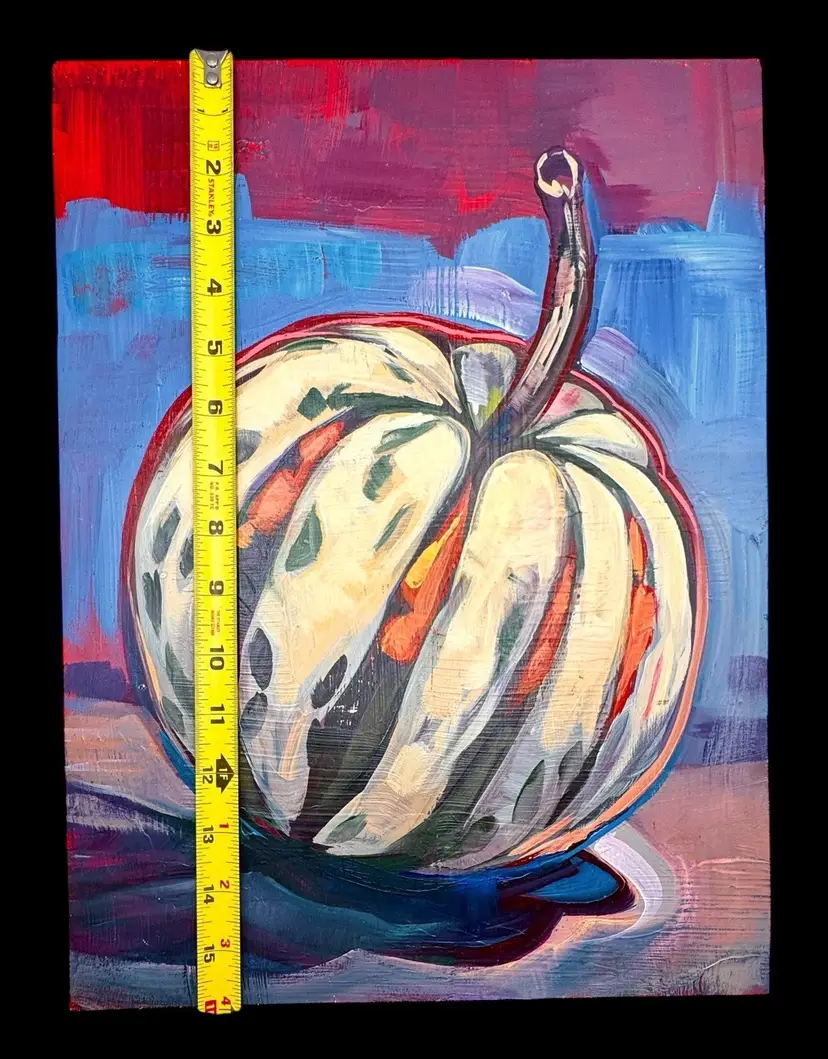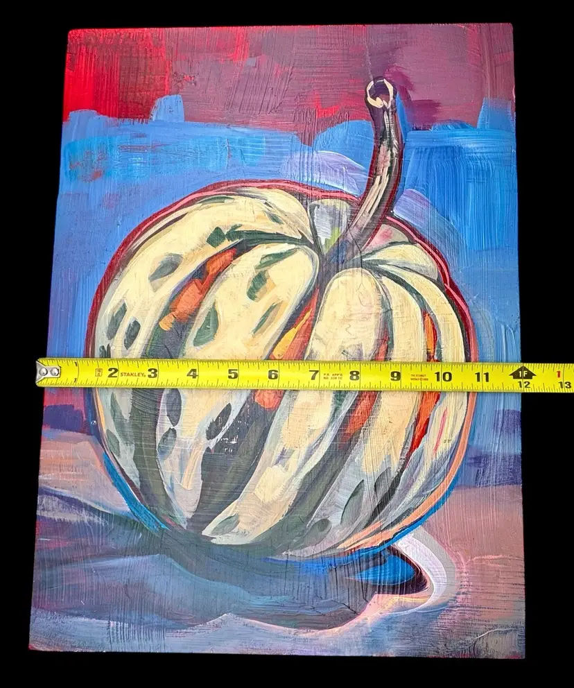Beautiful painting depicting a pumpkin or gourd. It is painted on wood board. It is signed John Mulder 2009; he is the current head maker at Eekum Bookum Tiki Mugs.