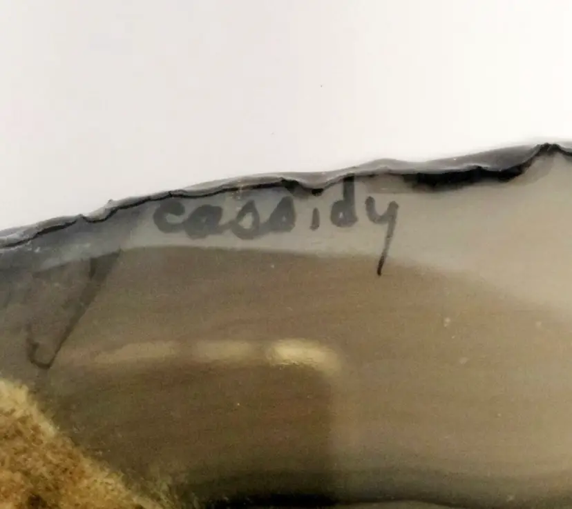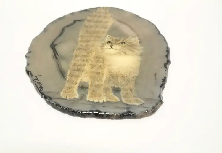 Signed kitten/cat agate painting. Brazilian agate stone slab. Original artwork. Artist signed. Stand not included. Condition seen in photos.