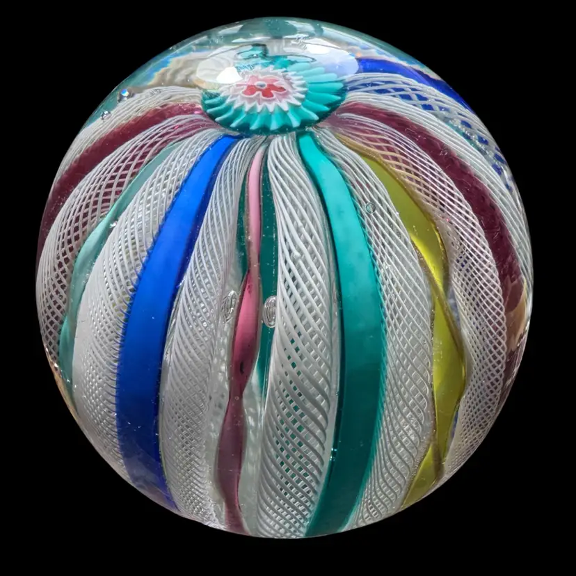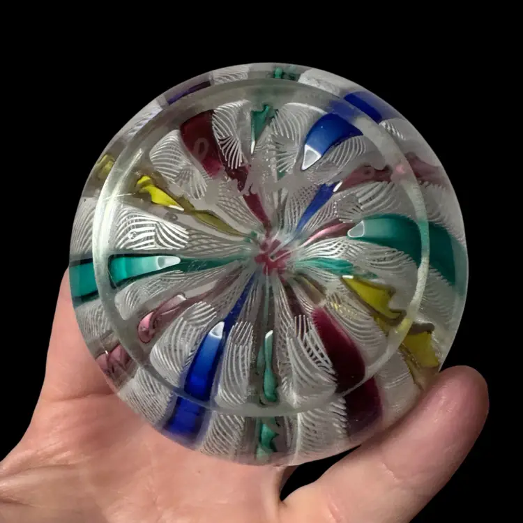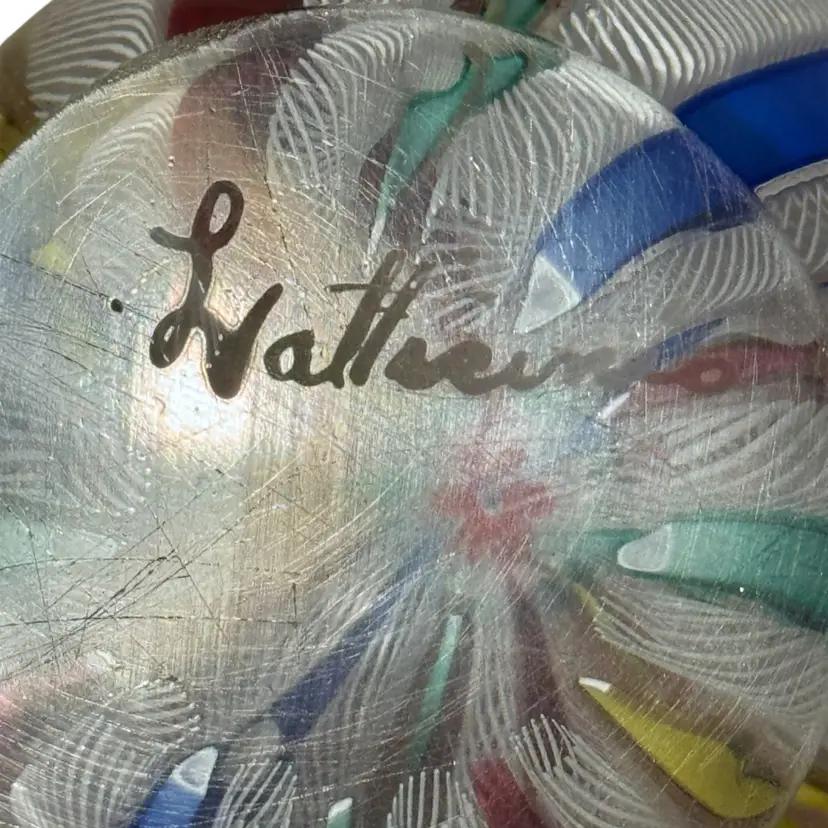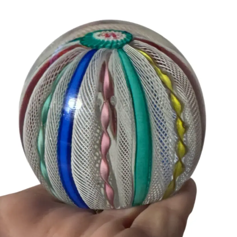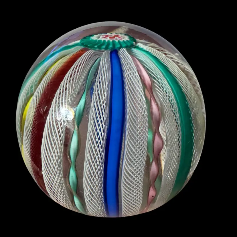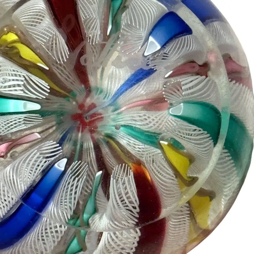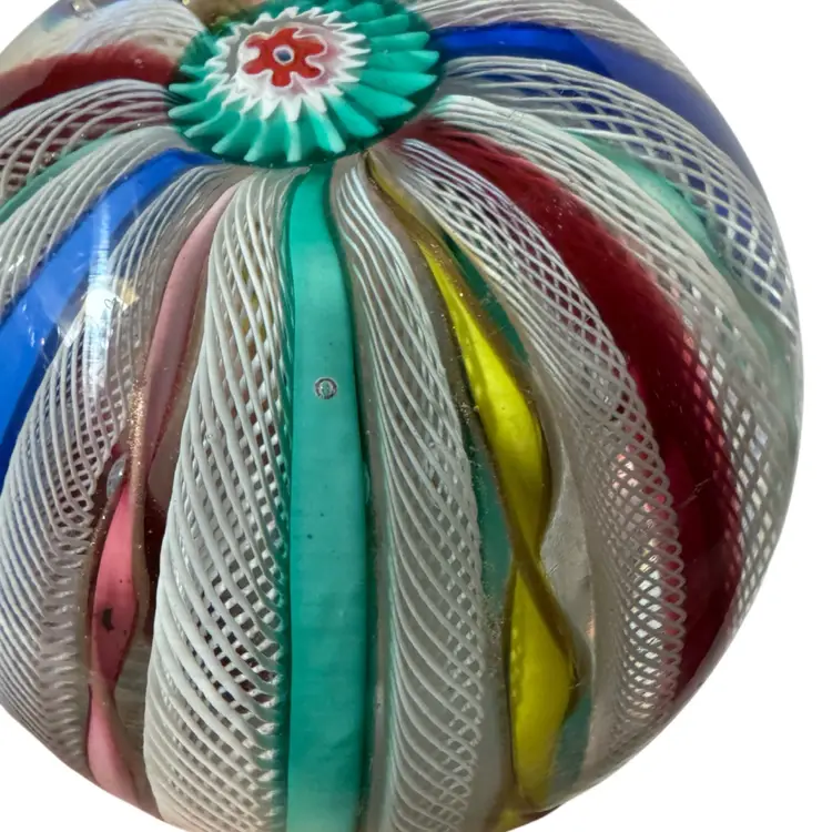 I love the detail in this paperweight. The Zanfirico lattice spiral patterns are intricate and beautiful. The ribbons are vibrant and some are spiraled. There is a large millefiori cone at the top in green white and pink. One thing that makes this paperweight special is the etching at the bottom that looks like "Lvatticinio", light scratching on the bottom, one small bruise as shown in the pictures