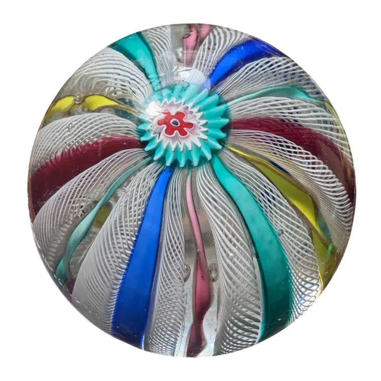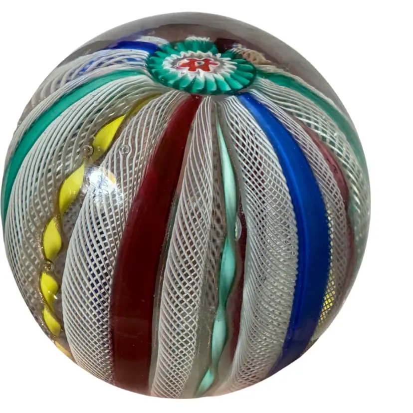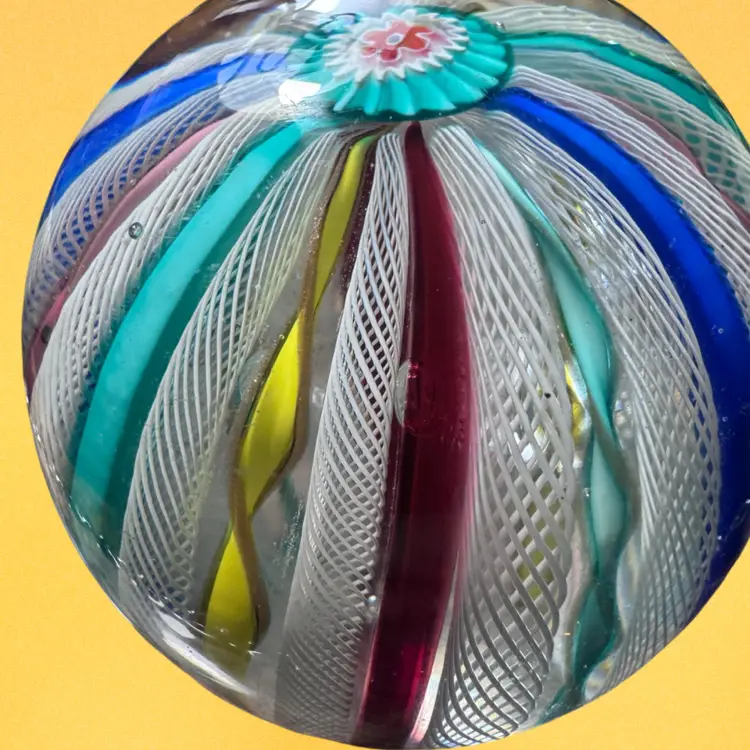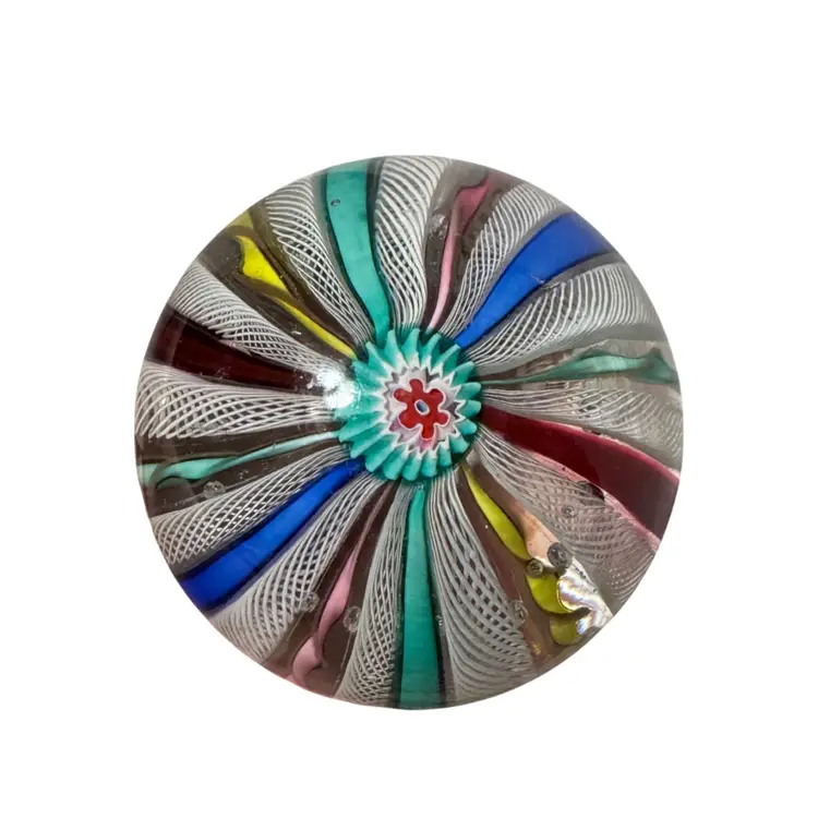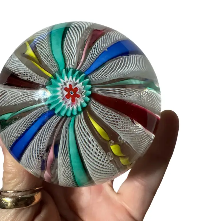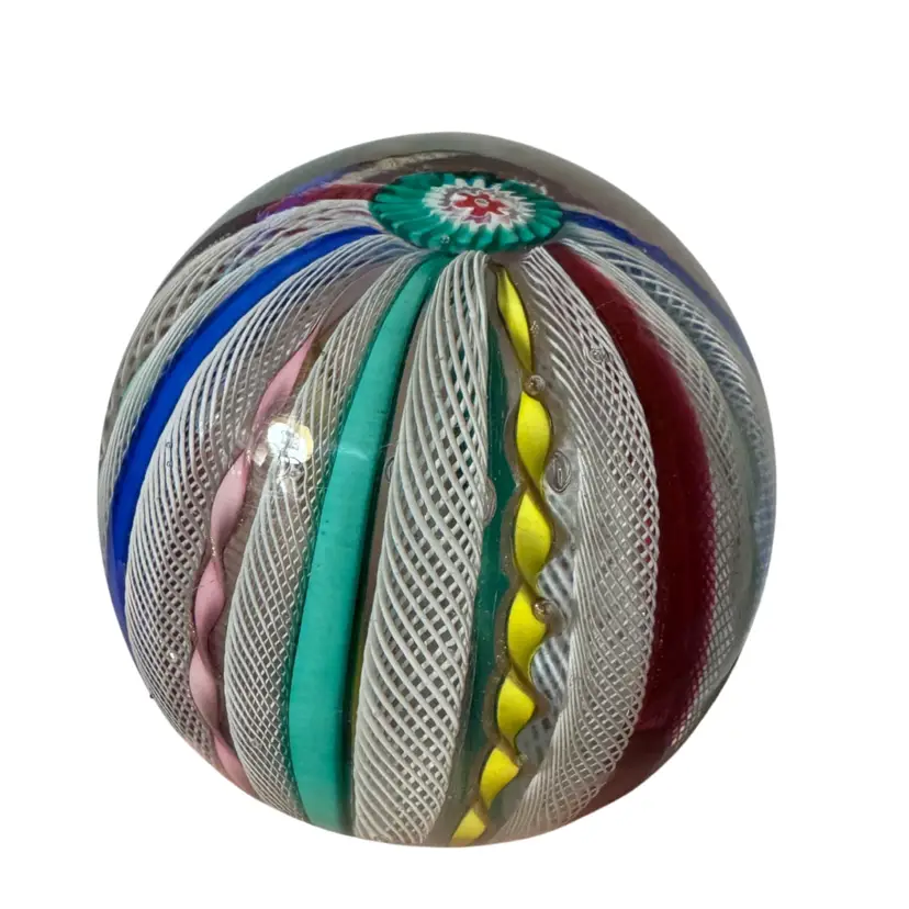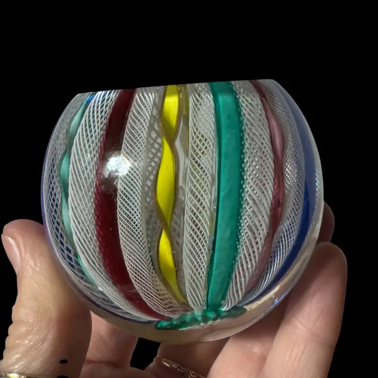 I love the detail in this paperweight. The Zanfirico lattice spiral patterns are intricate and beautiful. The ribbons are vibrant and some are spiraled. There is a large millefiori cone at the top in green white and pink. One thing that makes this paperweight special is the etching at the bottom that looks like "Lvatticinio", light scratching on the bottom, one small bruise as shown in the pictures