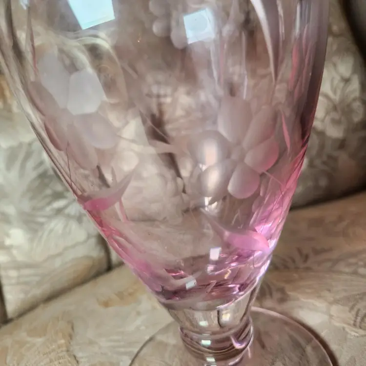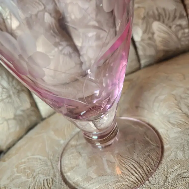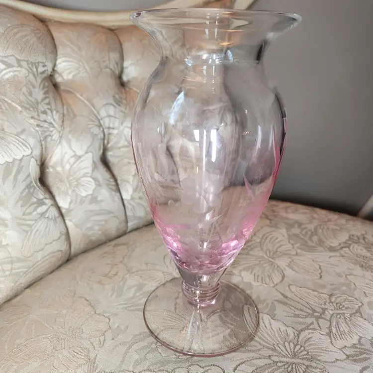 Lenox vase Etched with flowers. Clear with pink. Signed at the bottom. 9" tall 4.5" across. No chips or cracks.