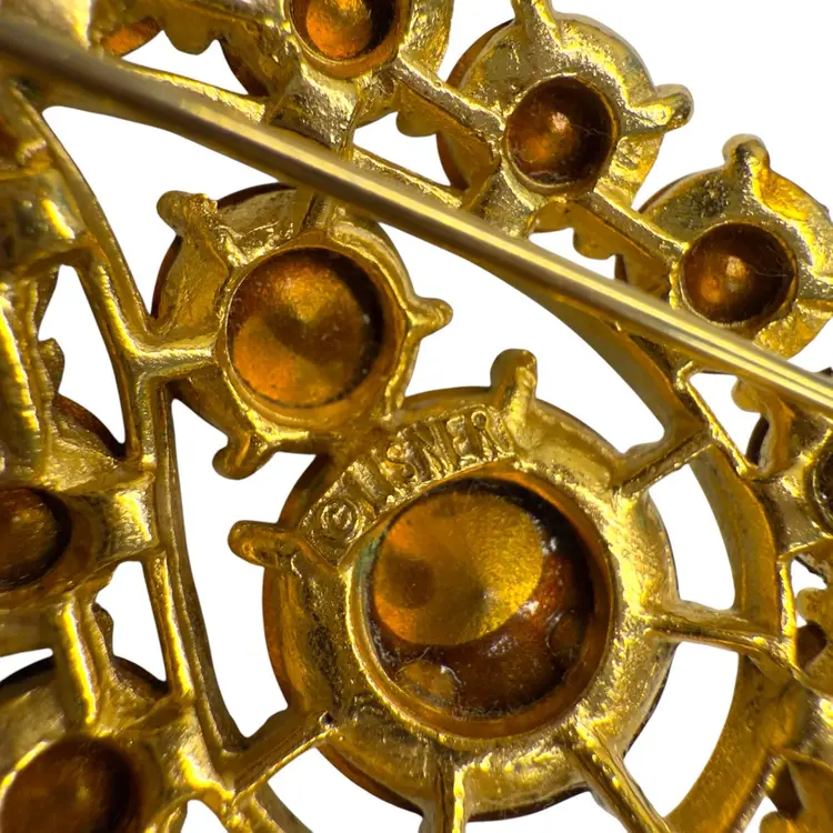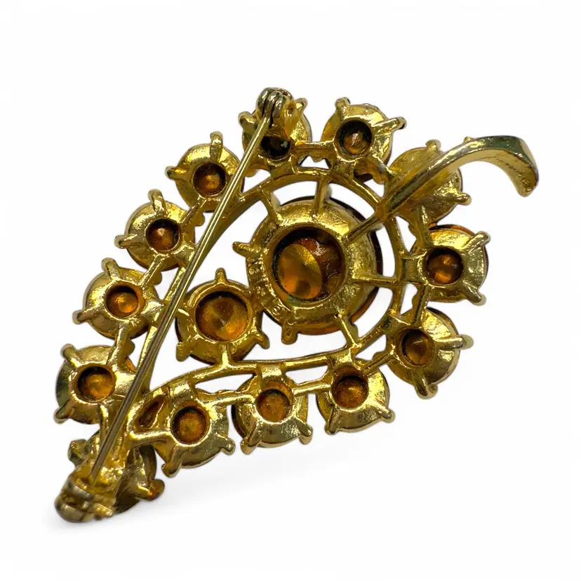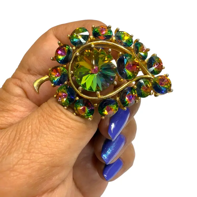 Gorgeous multicolored green rivoli rhinestones leaf brooch set in gold-tone metal. Signed Lisner. In good vintage condition with age-appropriate wear. Measurements: 2-1/4 inches x 1-1/2 inches.