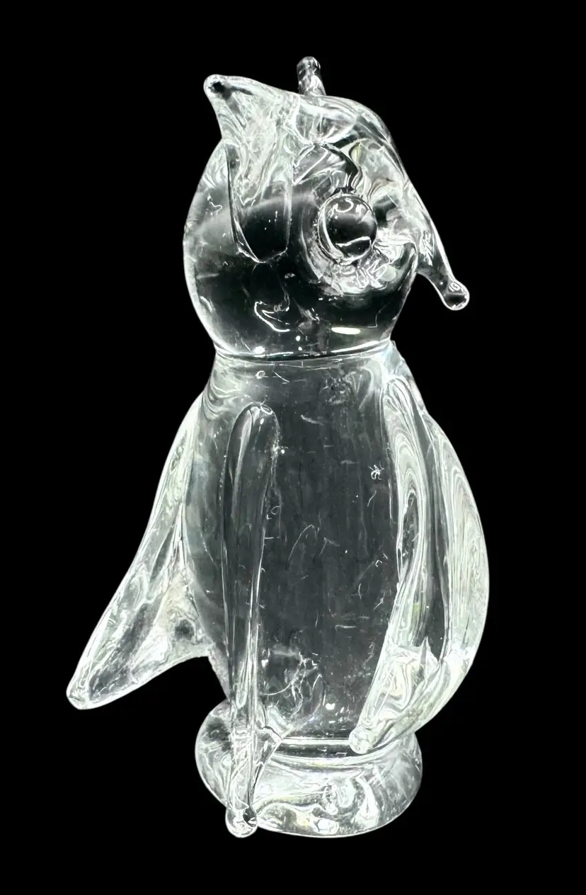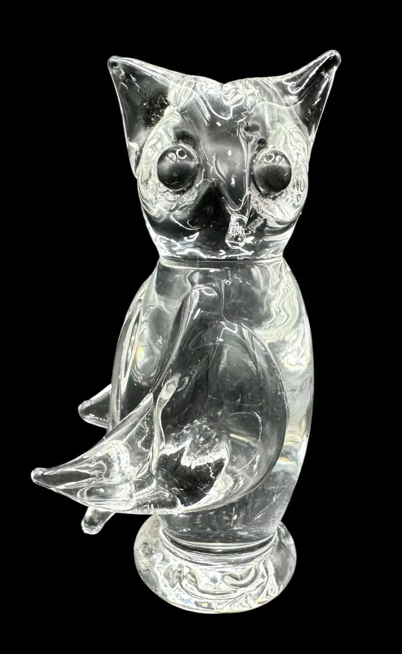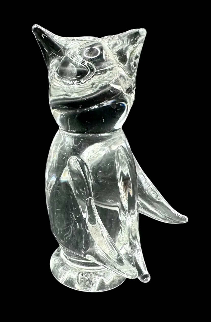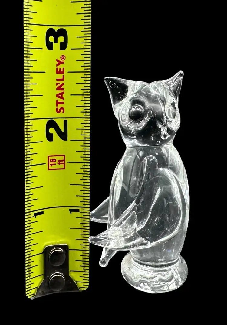 Glass owl figurine stamped with an ‘S’ on the bottom.