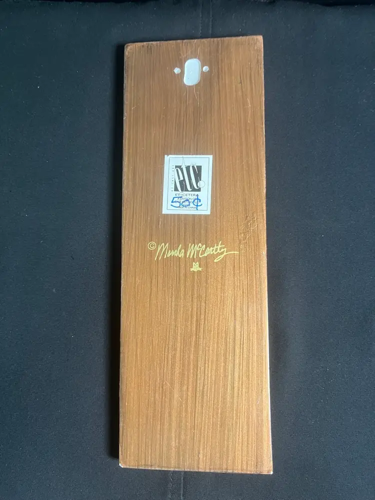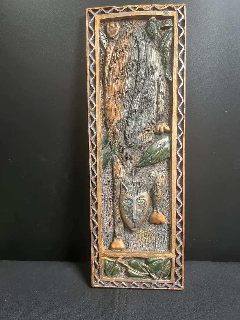 This is a neat piece. In certain light it seems to shimmer. This cat has one green eye and one blue eye. Signed by artist. Has a "hanger hole" on back. Is in good vintage condition. Measures approx 3" x 9", 9.5 Oz.