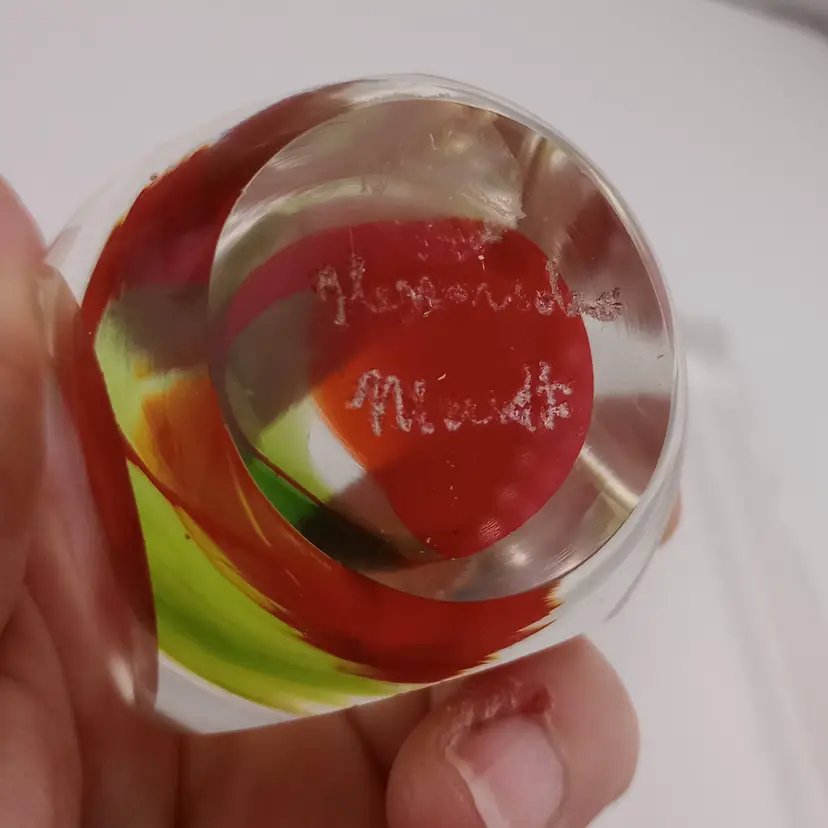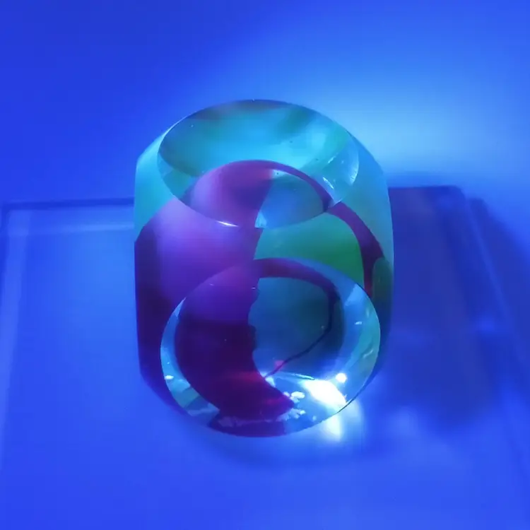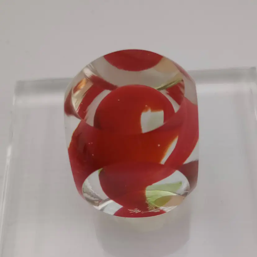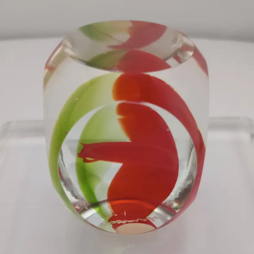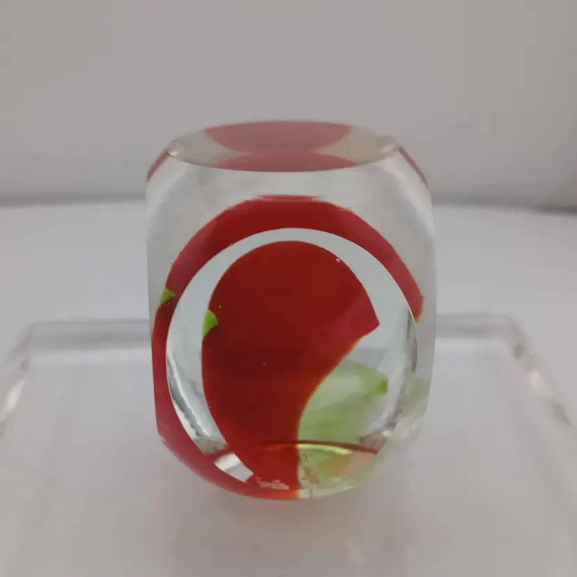 This is a beautiful and unusual signed paperweight. It glows! It's in excllent condition with no noted flaws. 2.25" tall, 1.75" across