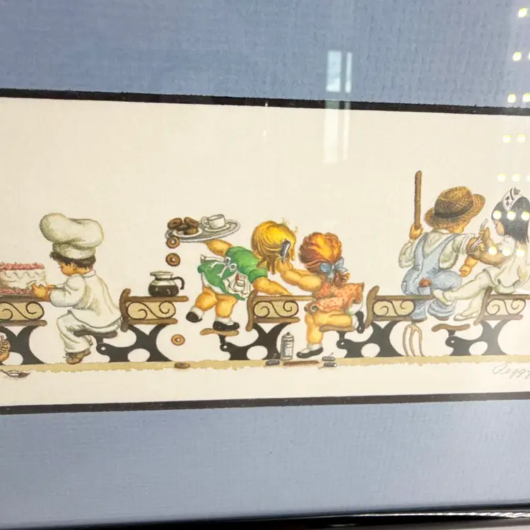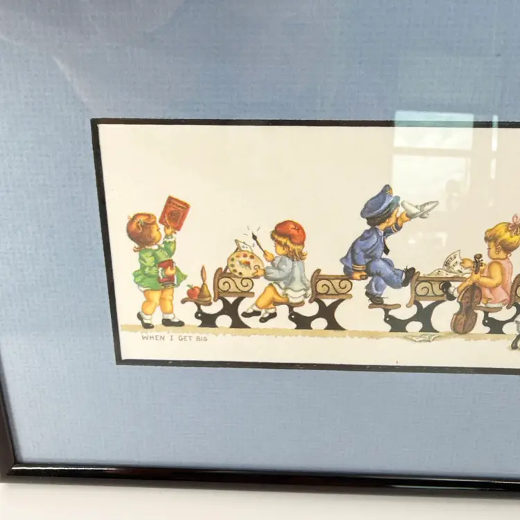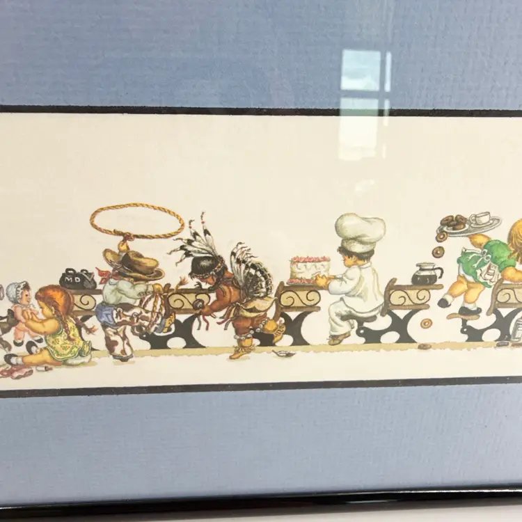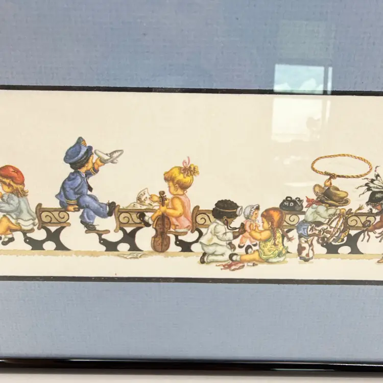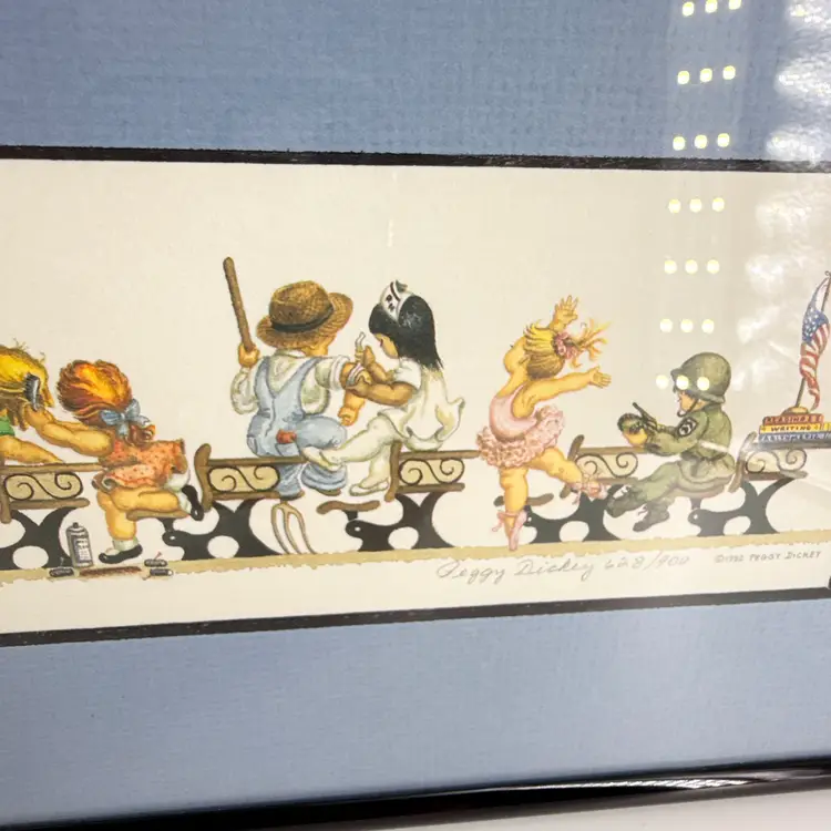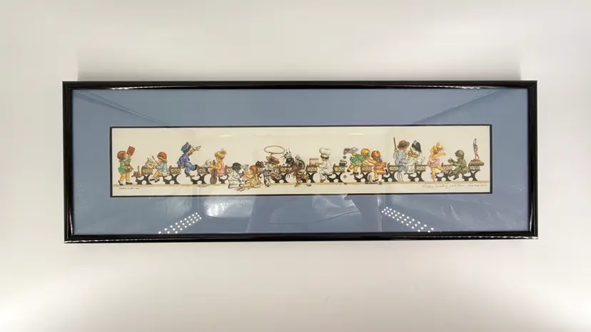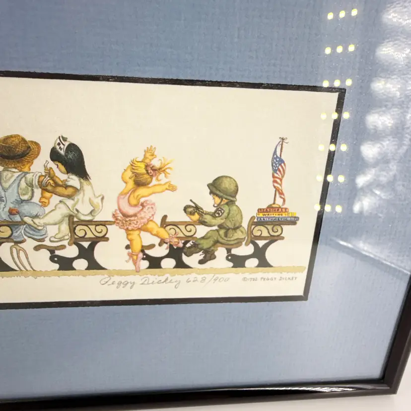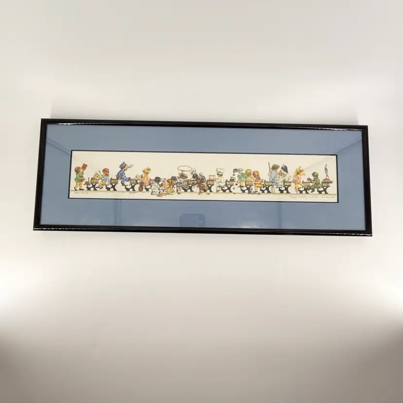 The print is framed and matted. The frame measures 21"x7". All are in excellent condition. There are no rips, tears, stains or repairs. (See photos).