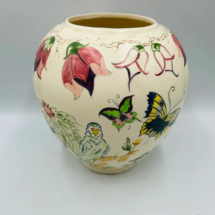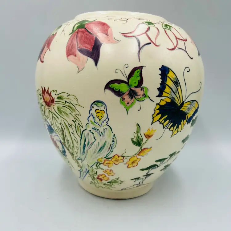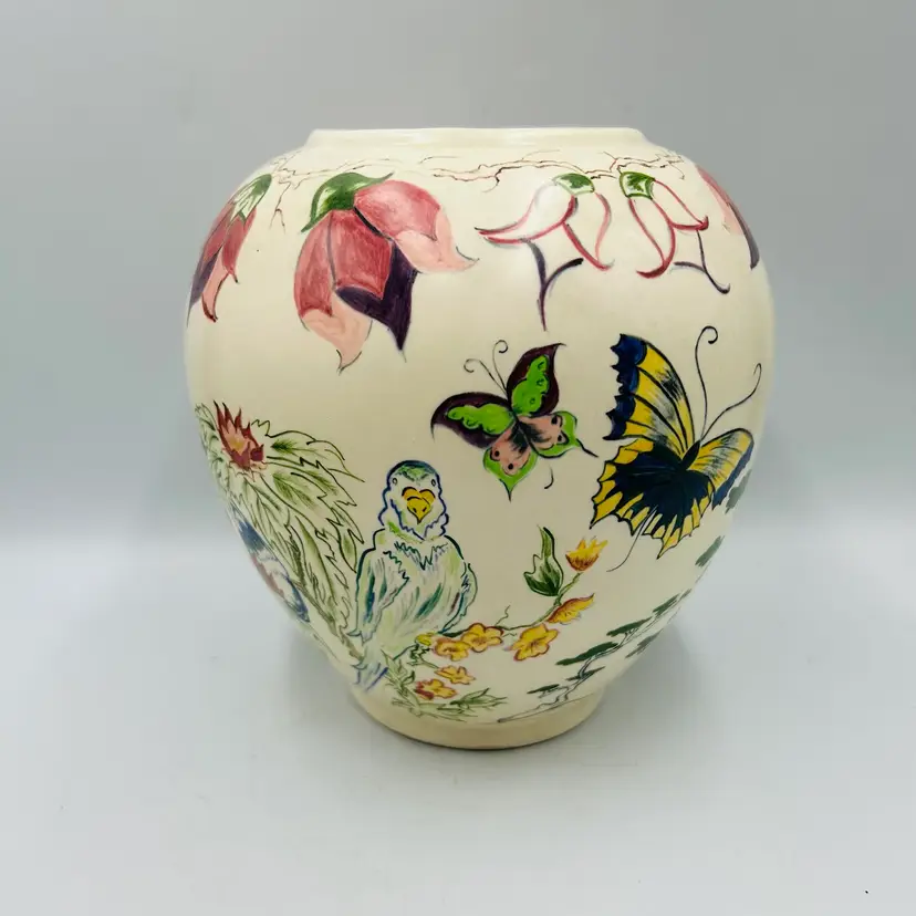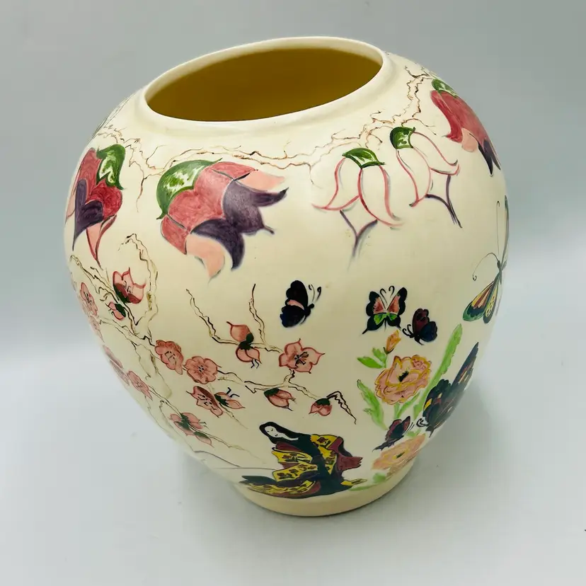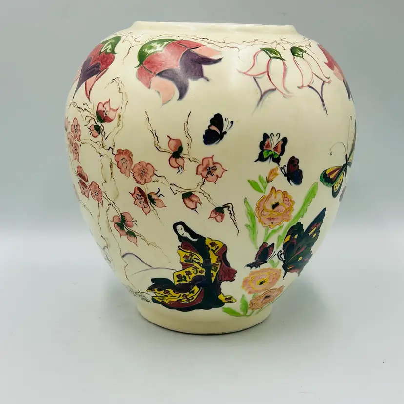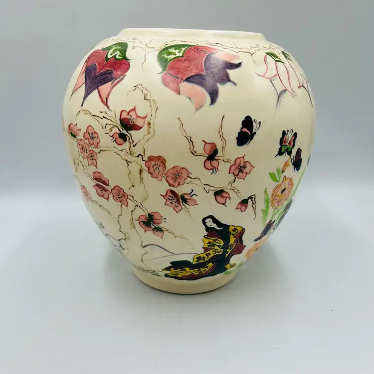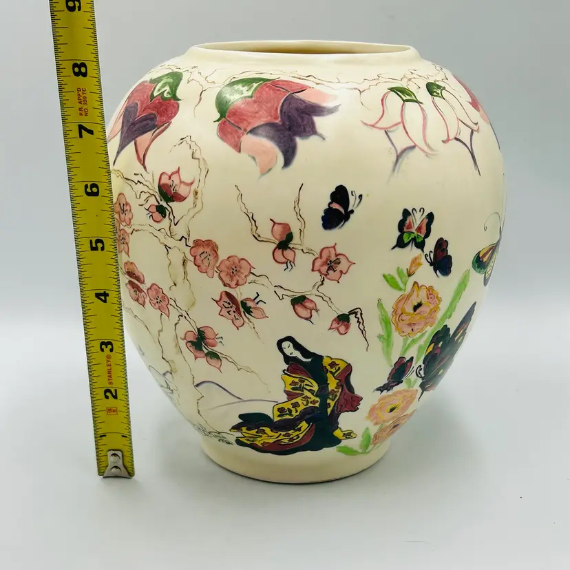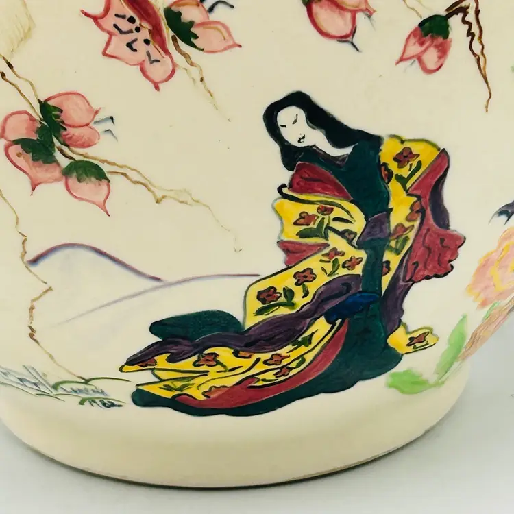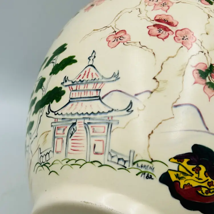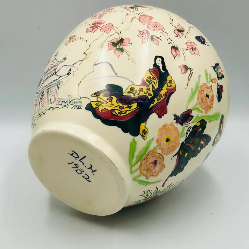 Features hand painted cherry blossoms, trees, pagoda, woman in Asian dress, butterflies and 3 birds.