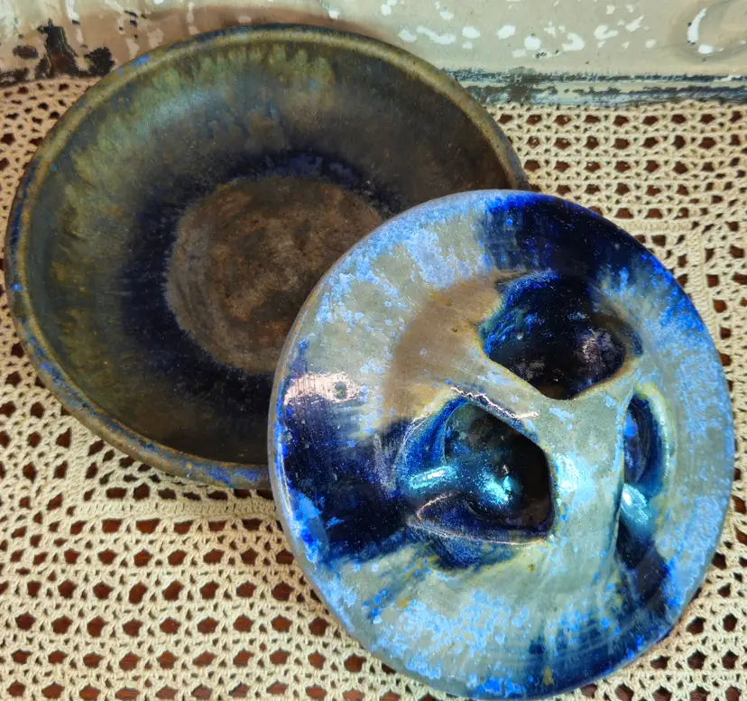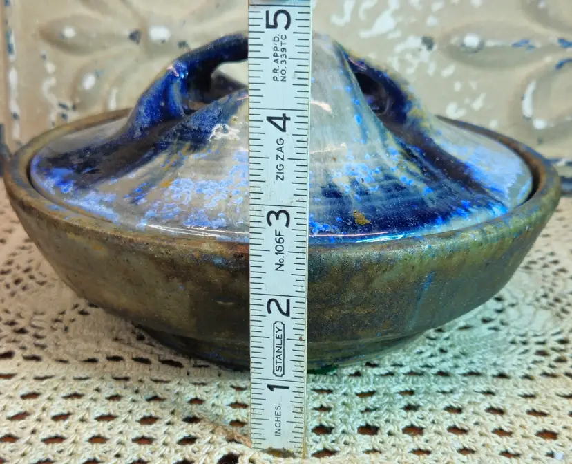This unique lidded bowl is in excellent, used condition, with no appreciable chips, scratches or cracks. Measurements are depicted in the pictures of the item or listed in the description of the item. Please review the photos, as they are part of the item description. Photos will always reveal noticeable defects, as will my description. Any white “blemishes” that are not pointed out in this section are from the lighting that I use for my photos. If you need clarification, please reach out to me.