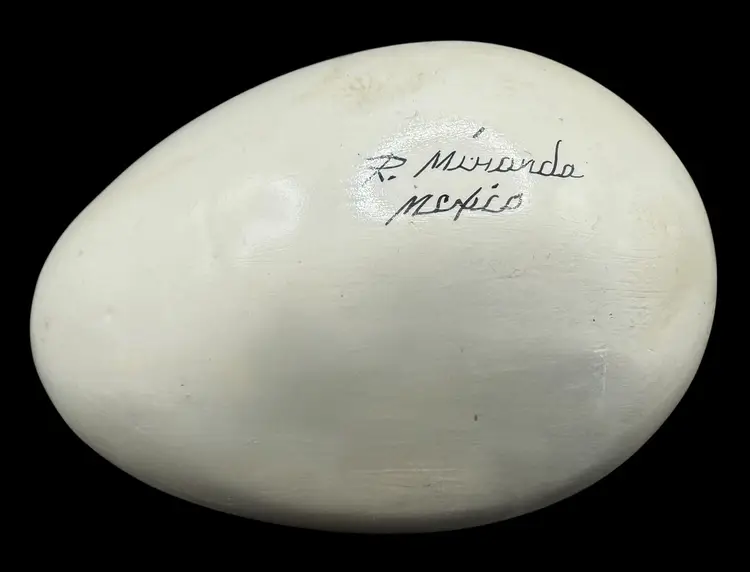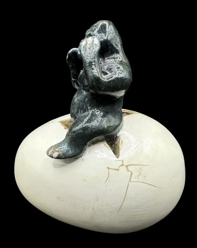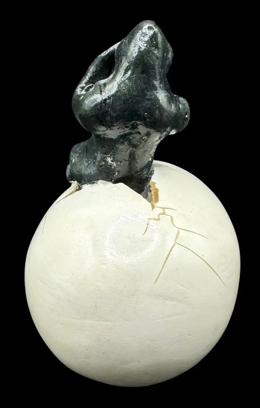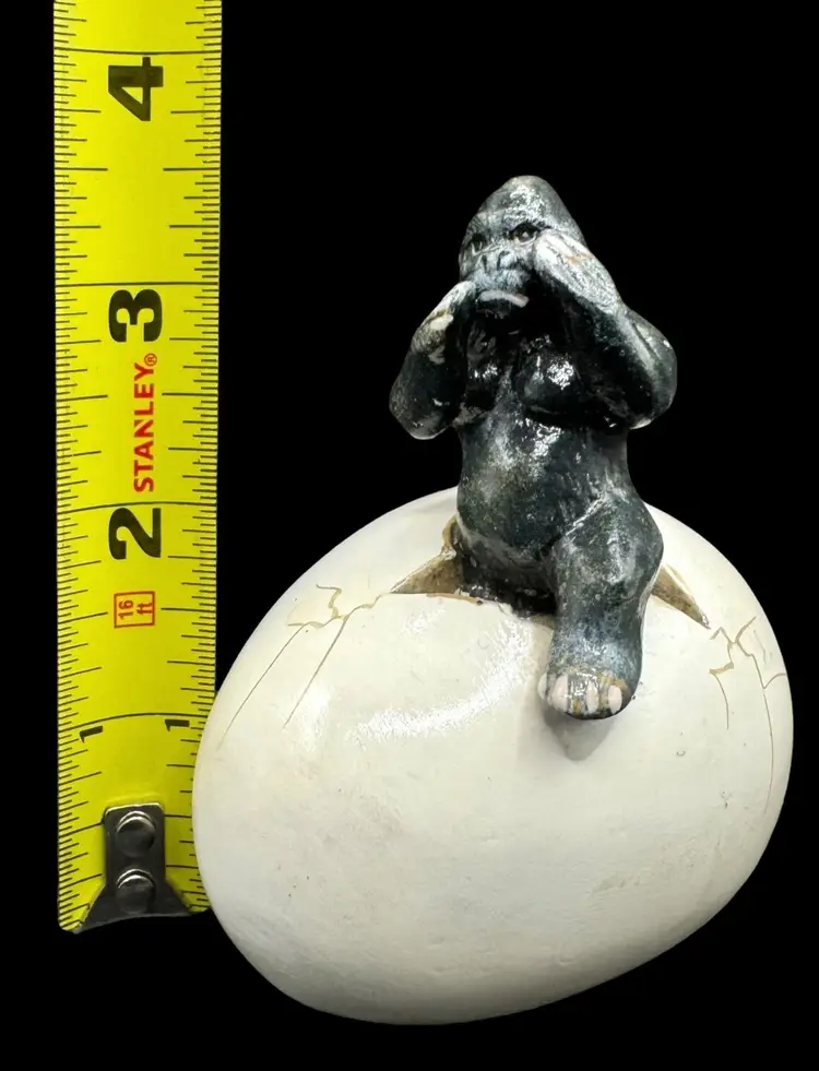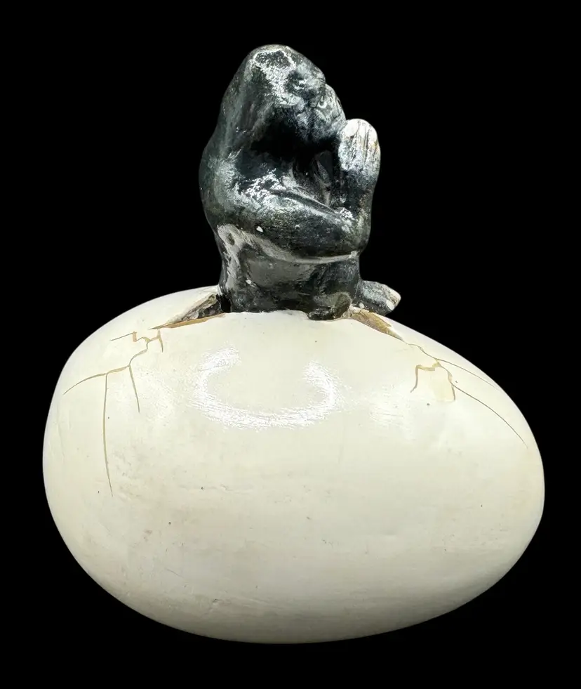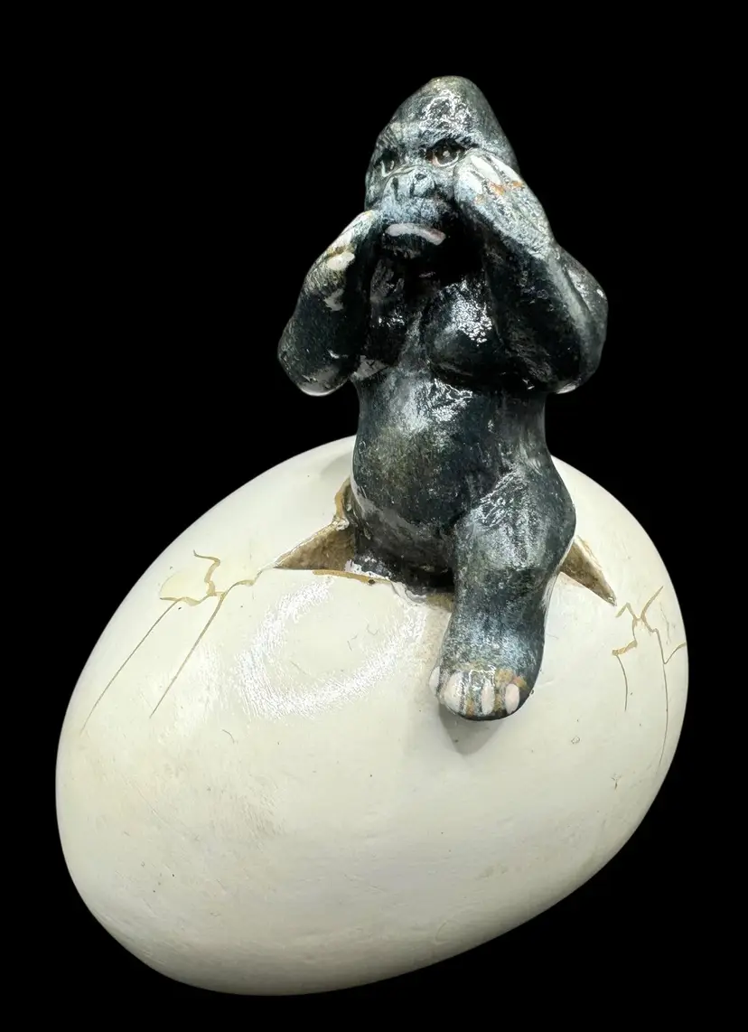 Odd pottery figurine depicting a gorilla hatching from an egg. It is signed by R Miranda, made in Mexico.