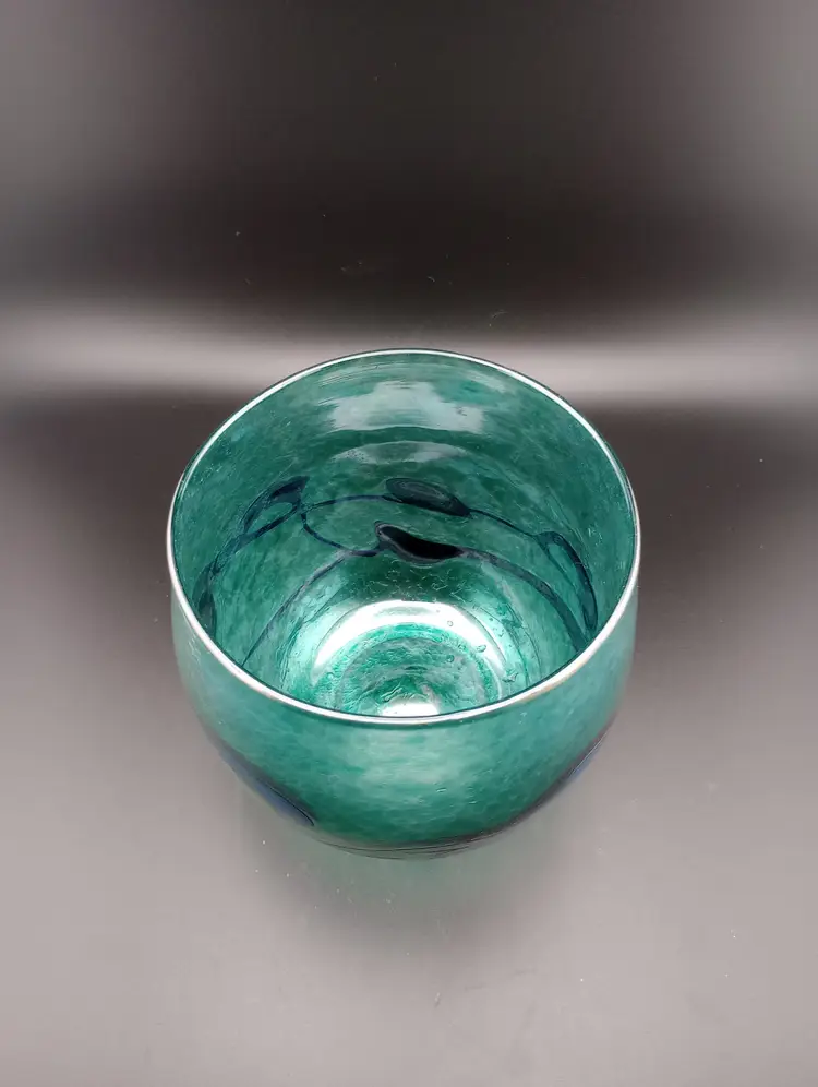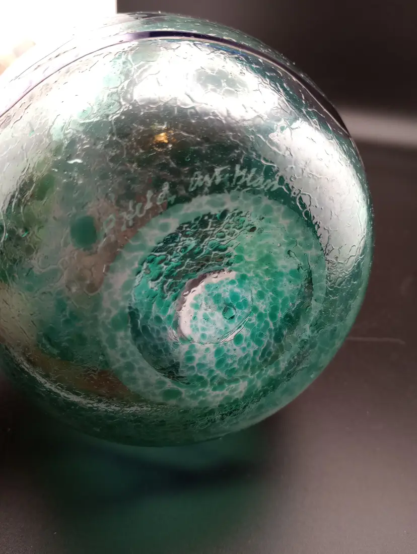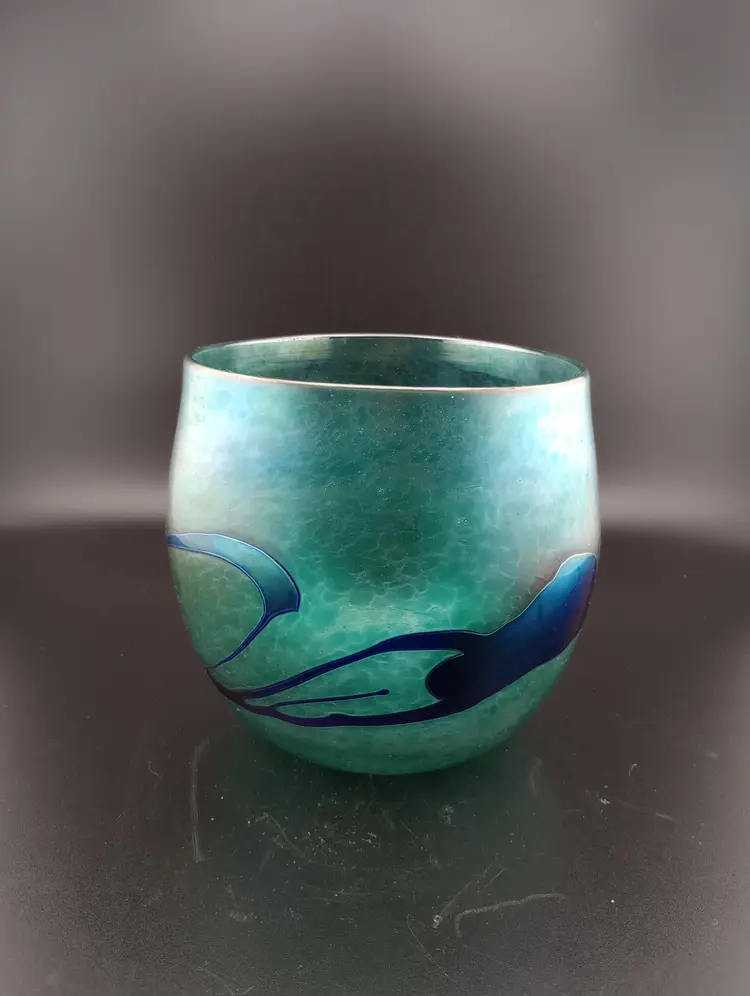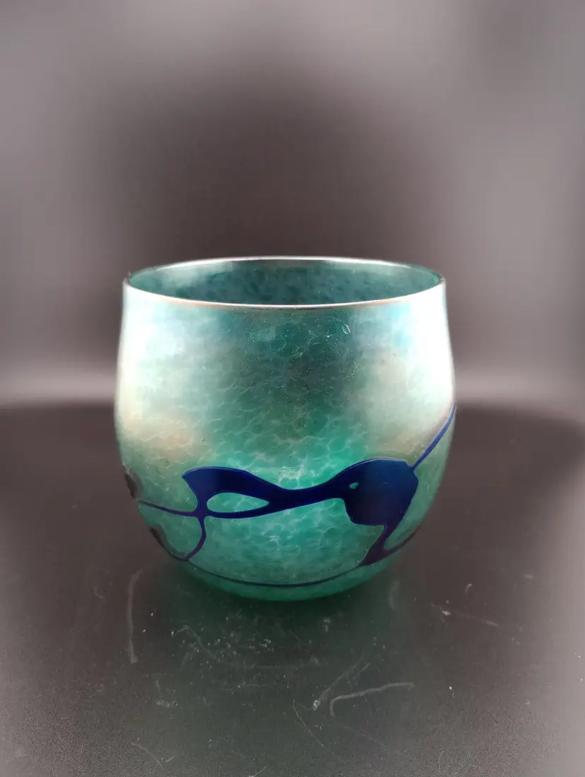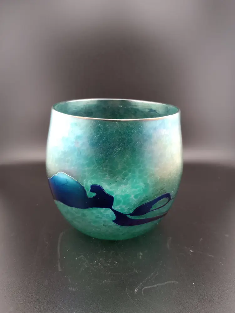 This is a gorgeous signed art glass bowl by Robert Held. The iridescence and blue color palette are just exquisite. It is in excellent condition with no chips or cracks. It is approximately 5" tall and 5" wide.