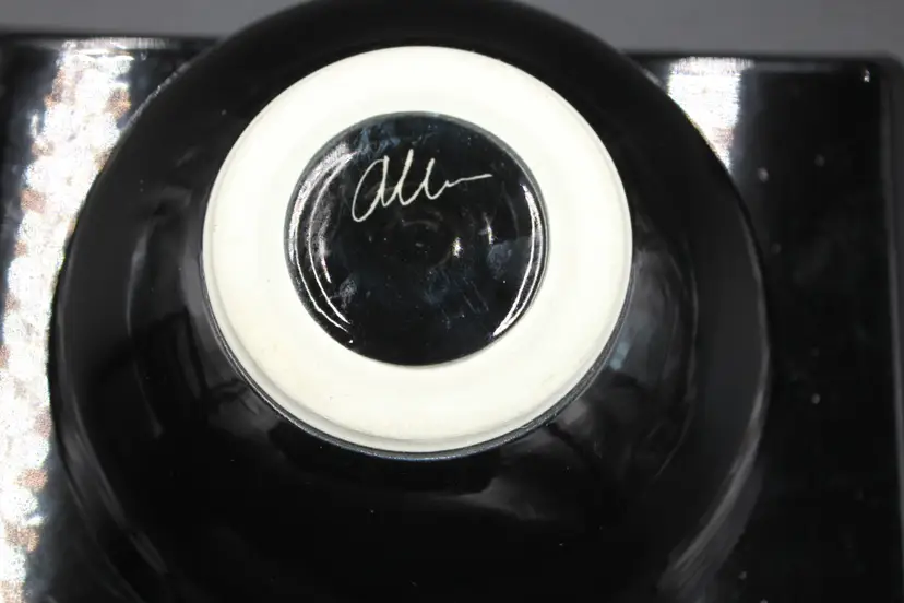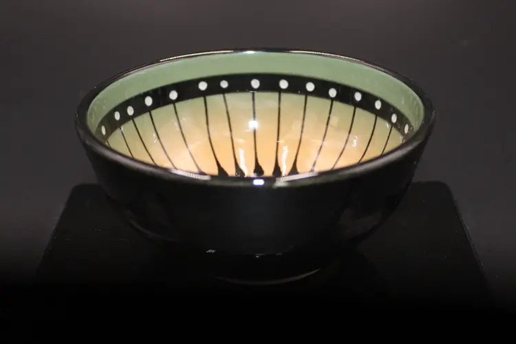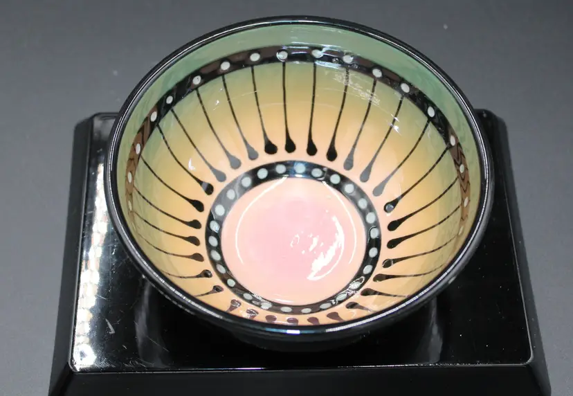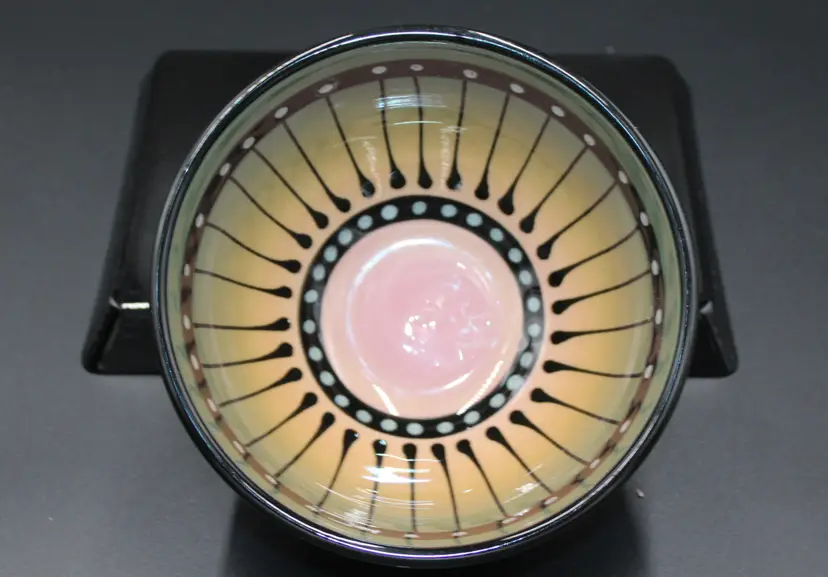 Roger Allen was a West Texas artist who based the Starkeeper design on the Medicine Man/Healer/Spiritual Leaders of the Southwest Native Americans. This piece is striking to look at. The interior has a very intricate design that looks like an eyeball to me. The center color is a light dusty pink color with hints of green and yellow. The outside is a deep dark glossy black and the artist signature is on the bottom. The bowl is 6 inches across and about 3 inches tall.