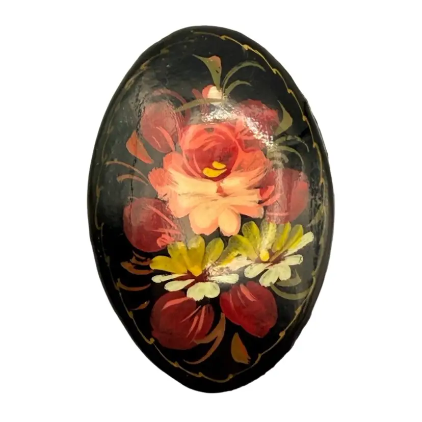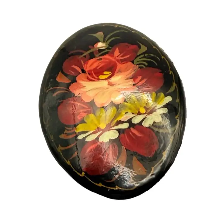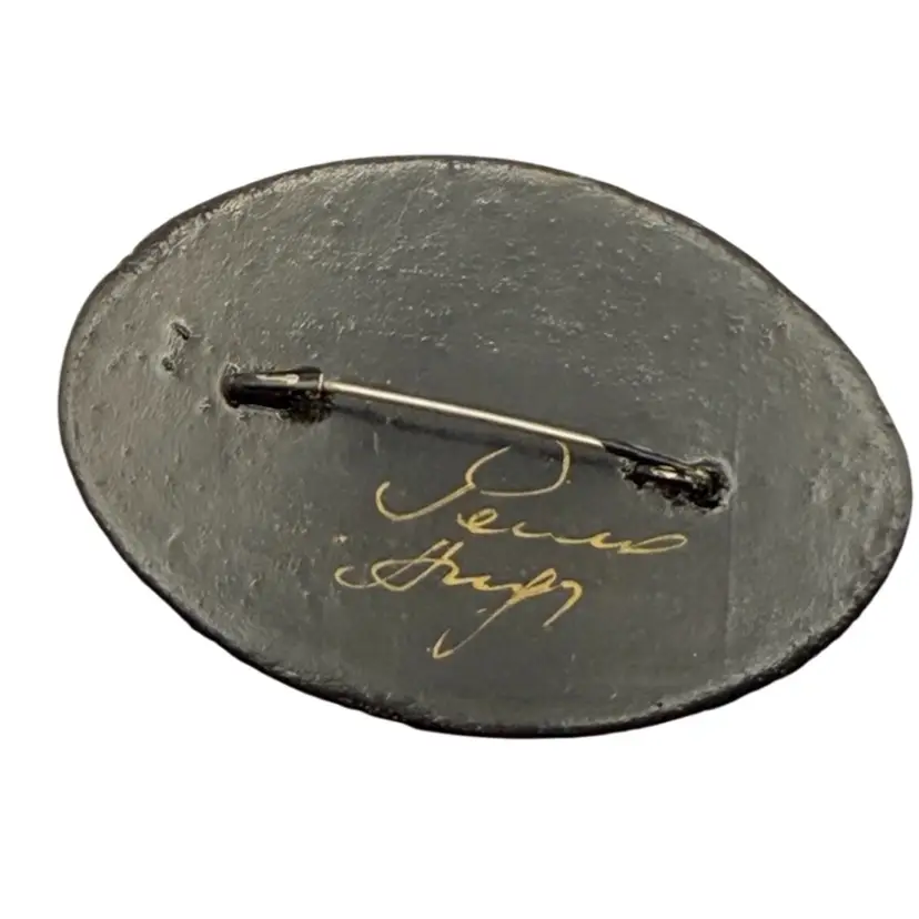 Signed Russian Lacquered Wood Brooch Multicolored 2"