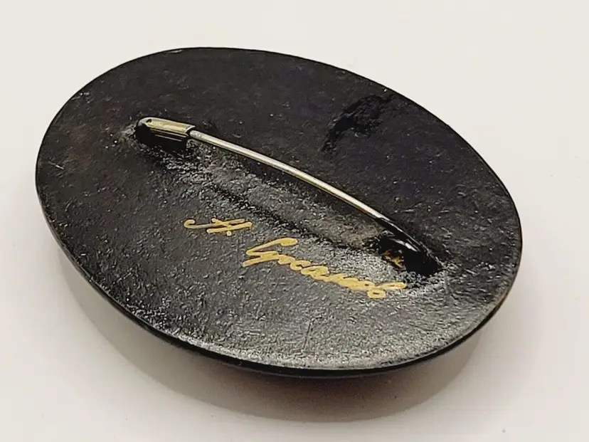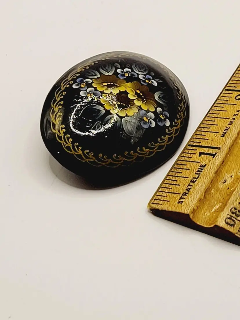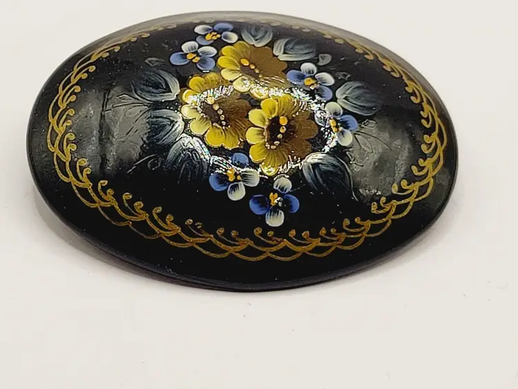 Beautiful hand painted Russian brooch, with amazing detailing in the painting. Signed, but hard to read. Size: approx 2'' Condition: Very good vintage Era: Circa 1960's Signed: Stamped on the back of the brooch.