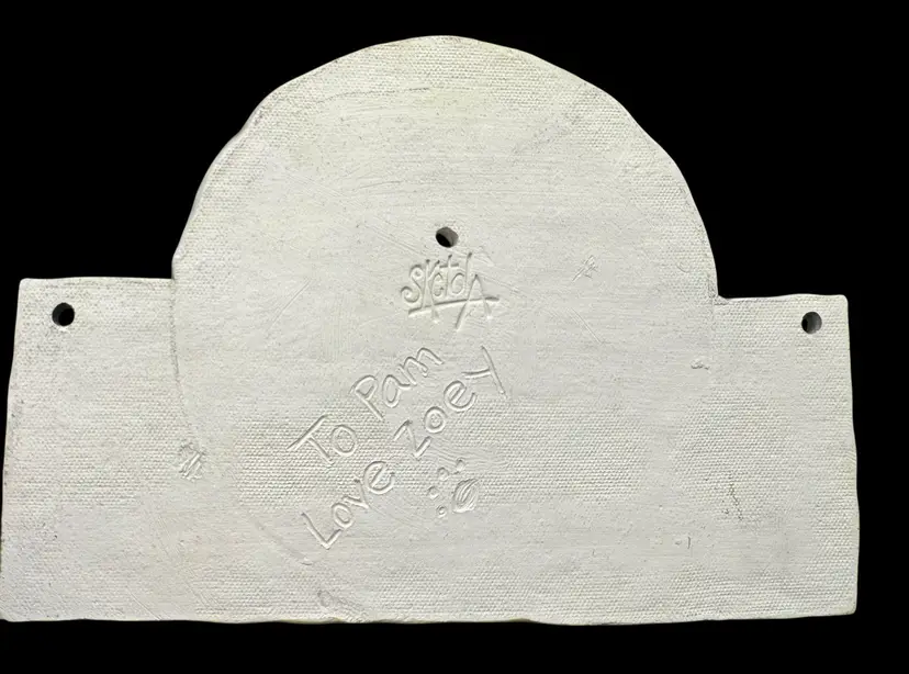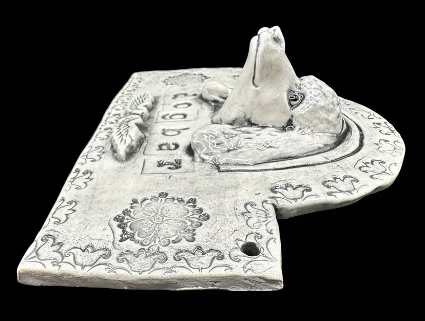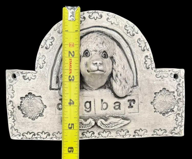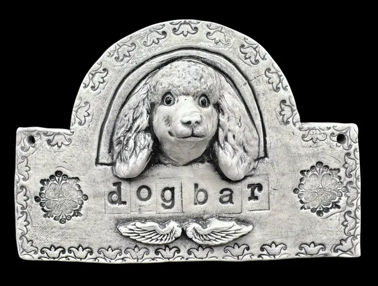 Handmade pottery wall plaque with a 3D poodle dog in the center. It has the words ‘dog bar’ underneath. This piece was originally commissioned for someone who owned poodles and collected poodle related items to decorate their home bar area. It would be perfect for a minibar or even to hand above pet bowls!