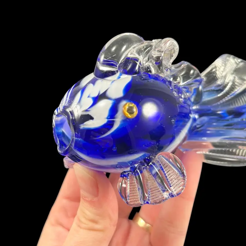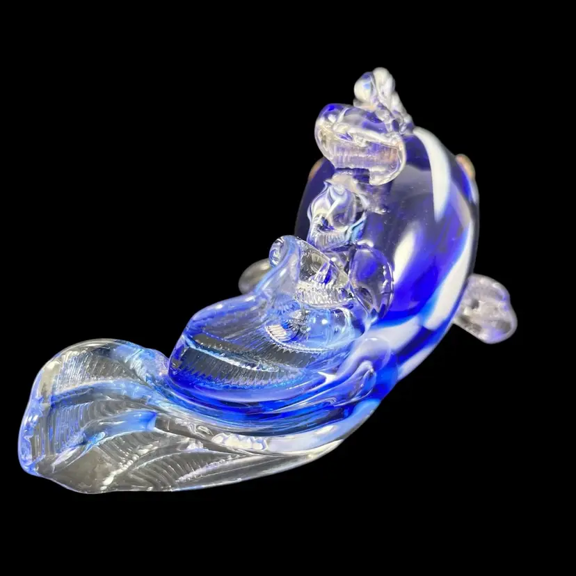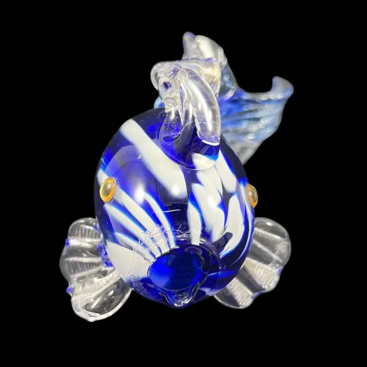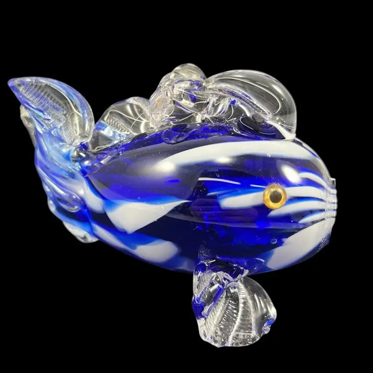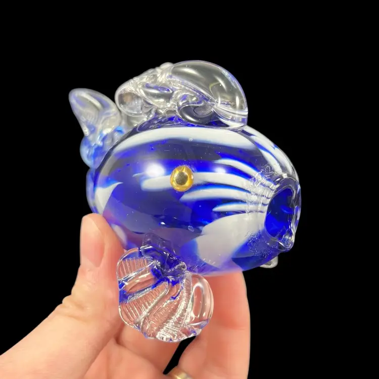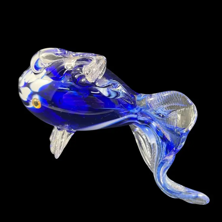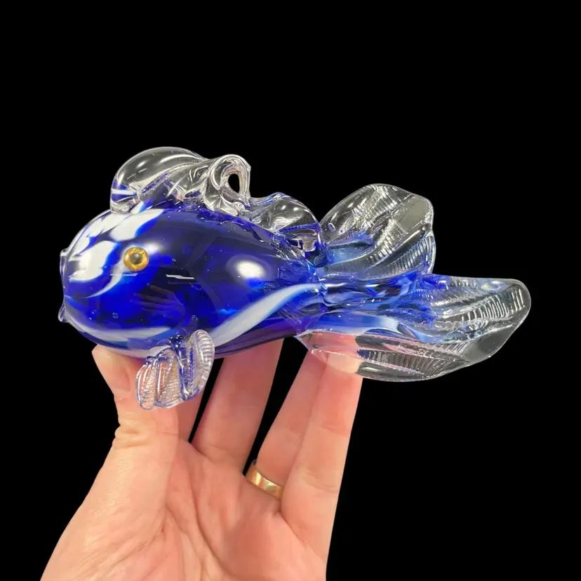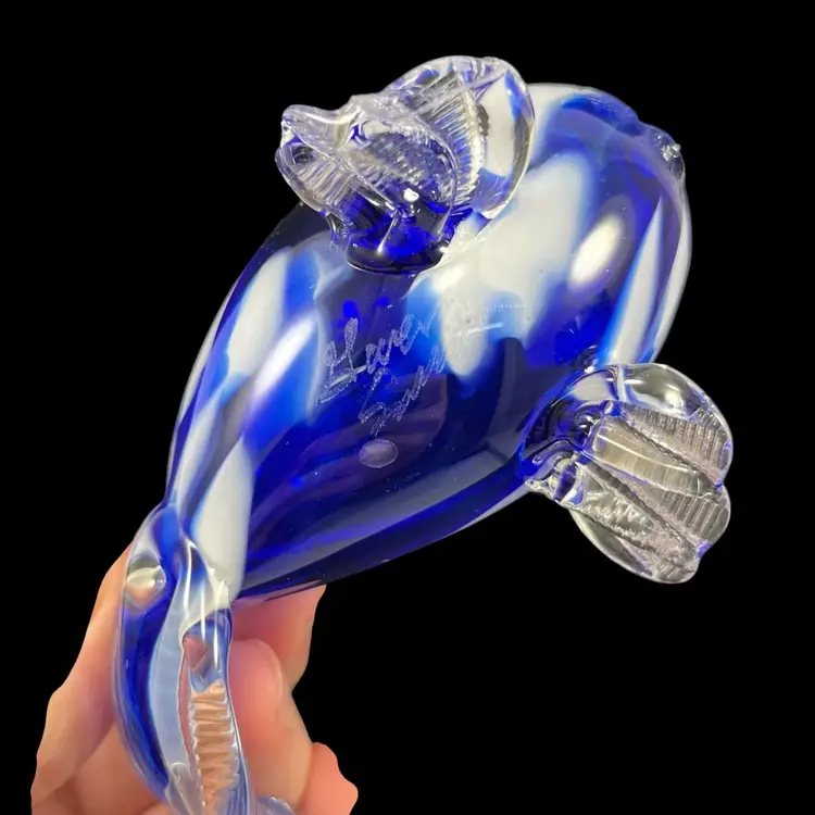 Approximately 4.5” x 3” x 2.5”. No chips or cracks. The eyes appear to be plastic, not glass. It’s hollow on the inside with an open mouth and the top fin folds over if you want to put a string through it to hang. Signed on the bottom.