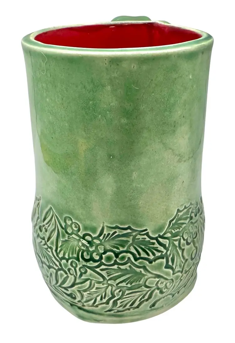 Perfect mug for the holiday season! Fun stamped mistletoe or holly design, with a green outside and red inside. Signed by ‘Jeenie’.