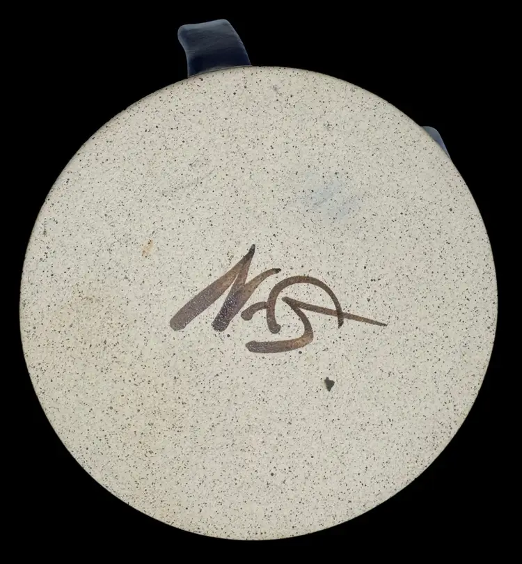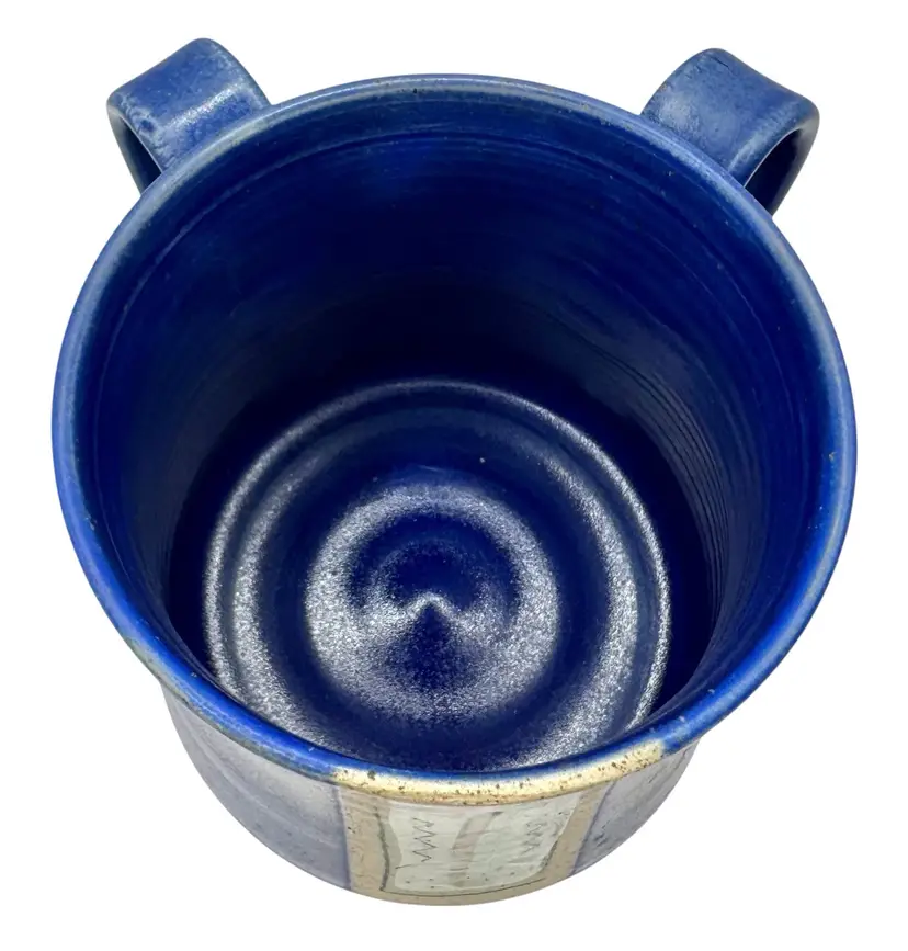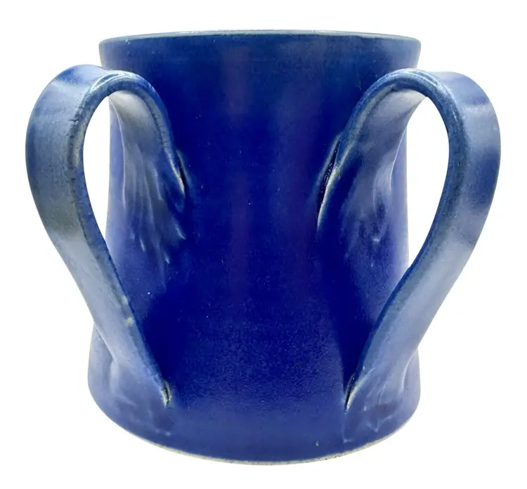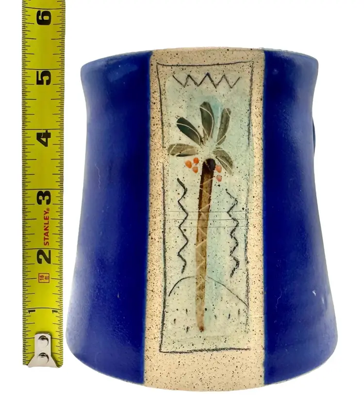 Interesting pottery vessel with two handles on the back. I am unsure the purpose of this piece. It had a beautiful blue glaze and a hand painted palm tree on the front.