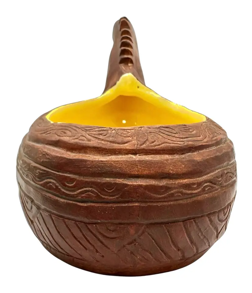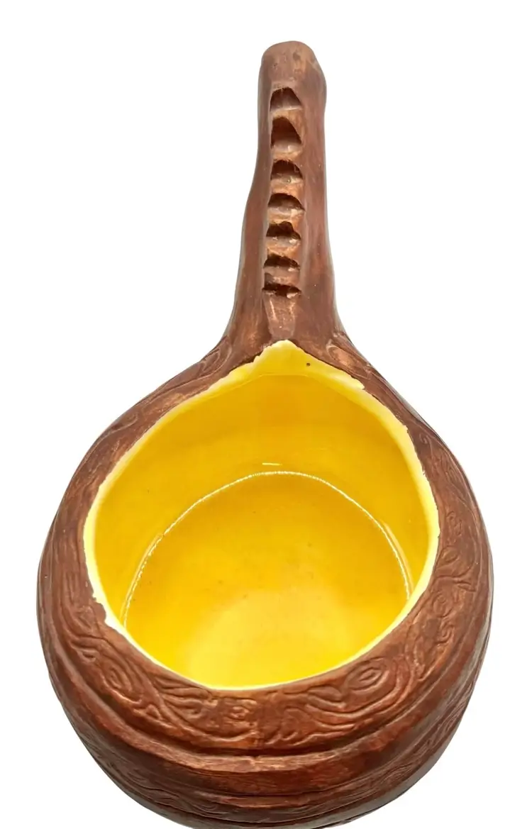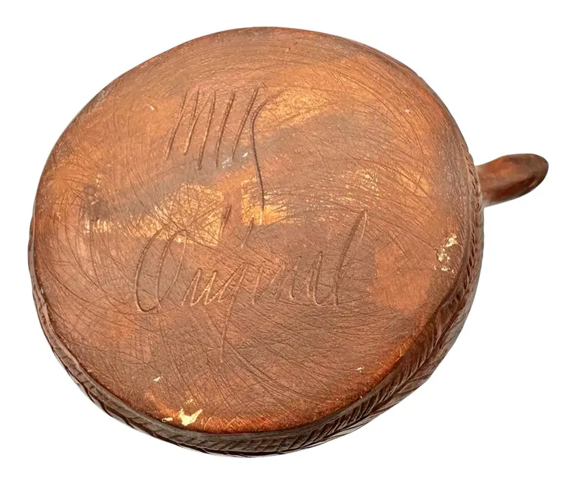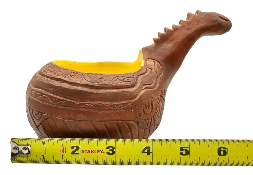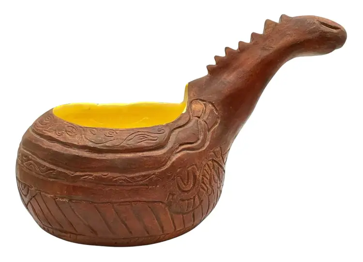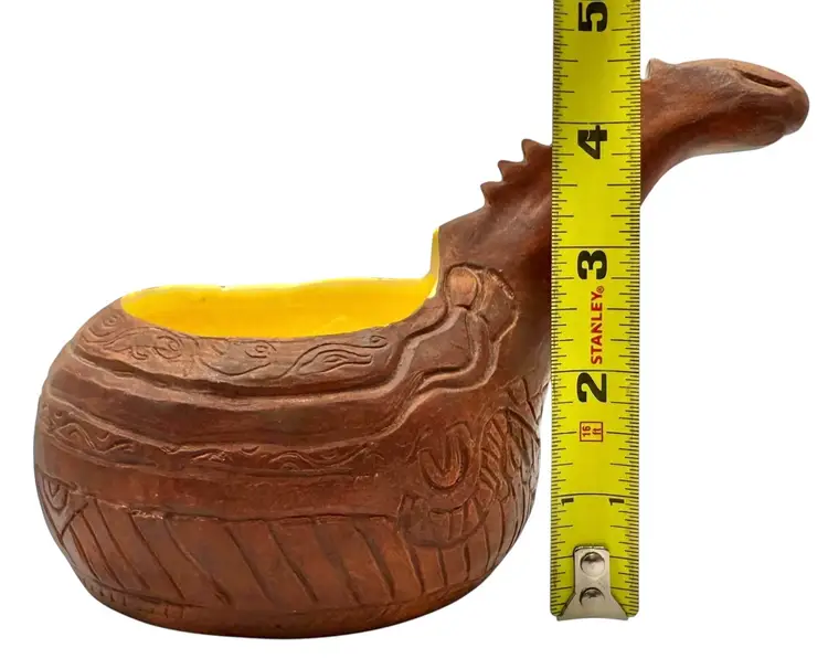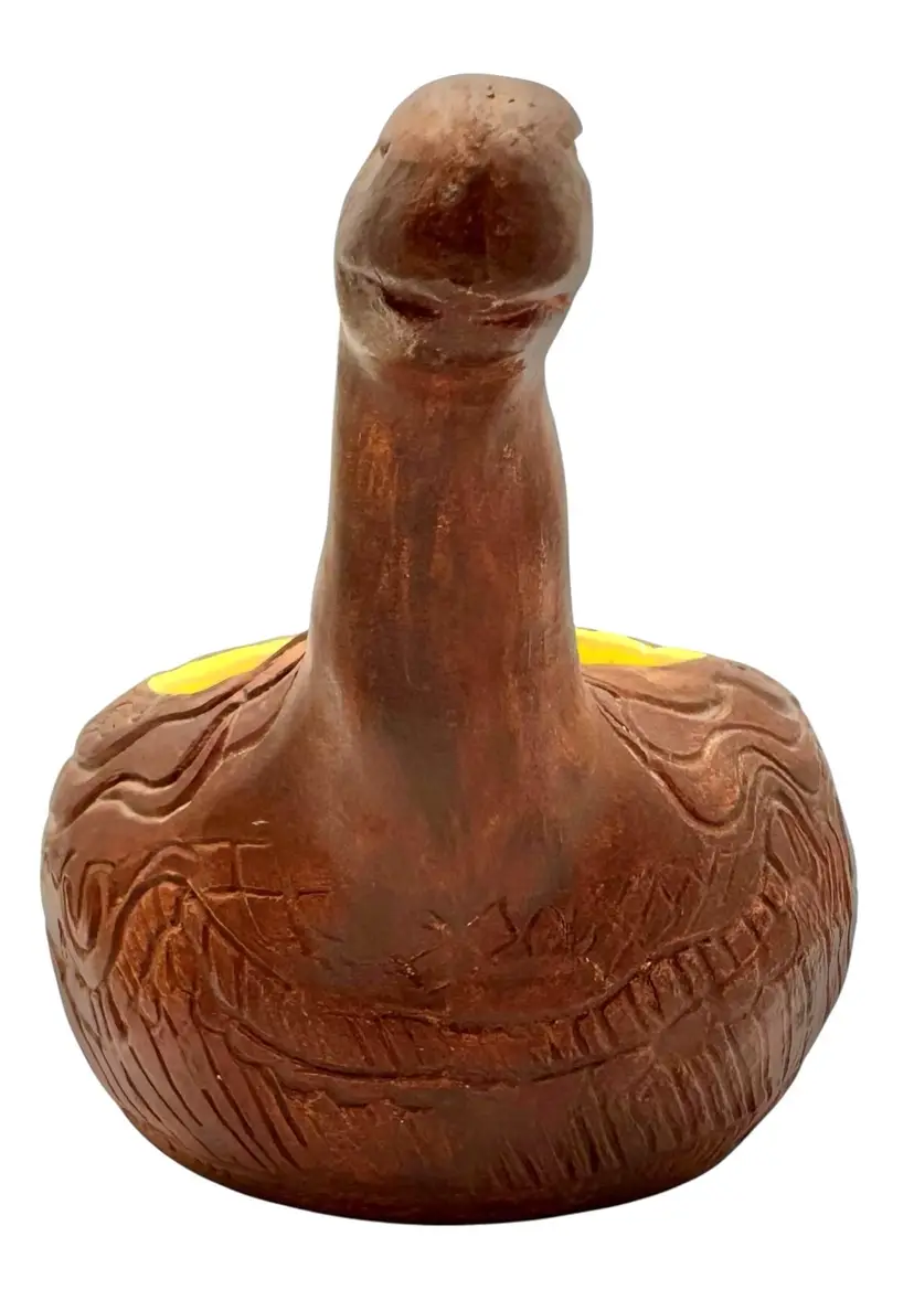 Handmade potter vessel shaped like a long necked dinosaur. It is marked ‘MIK originals’ on the bottom.