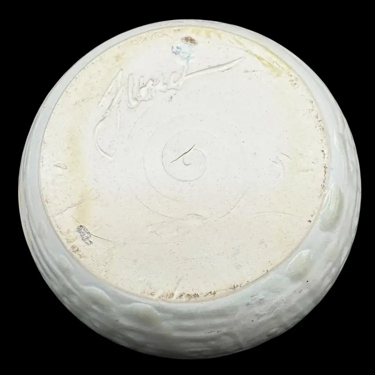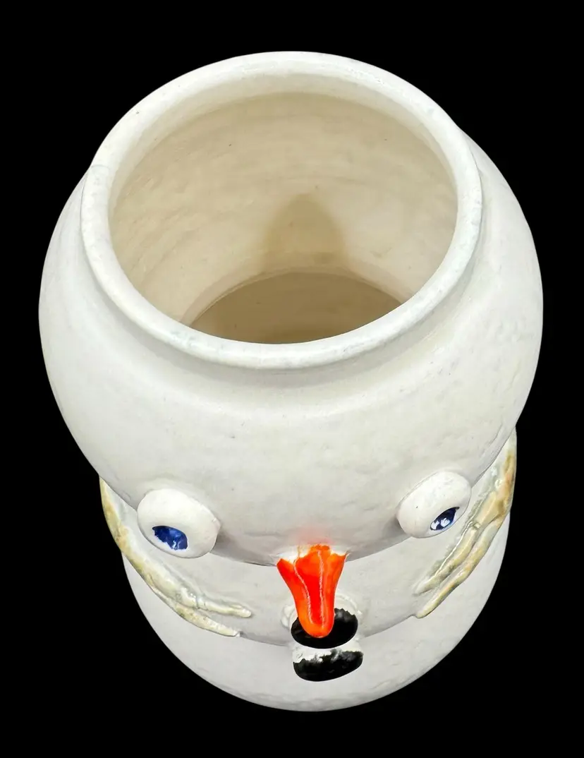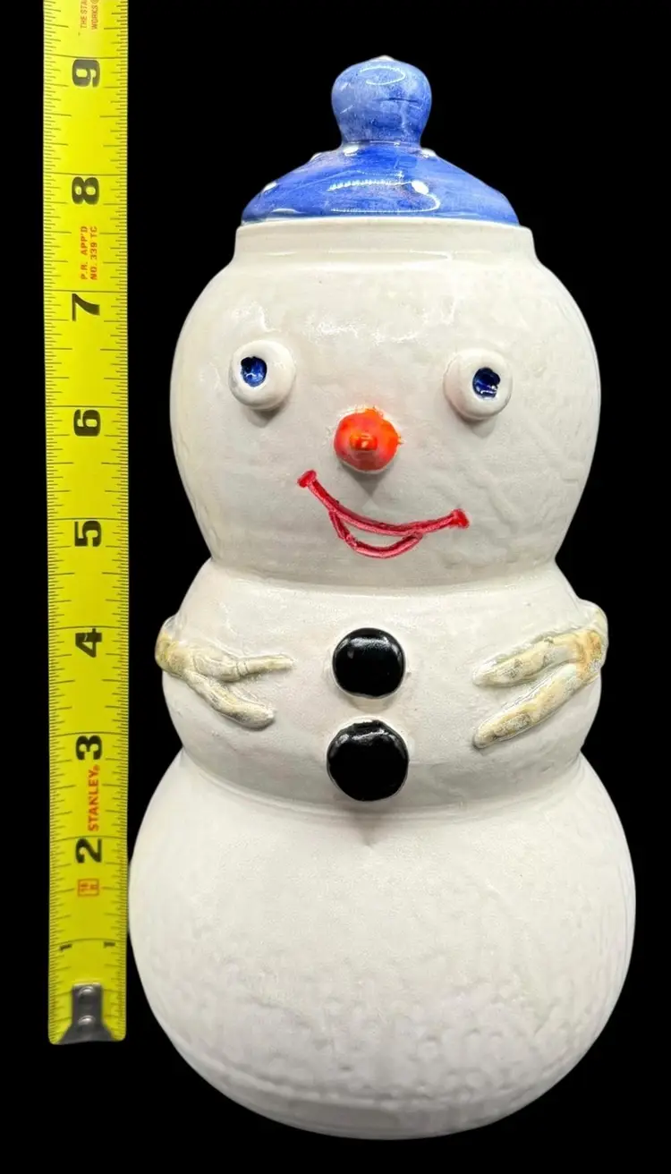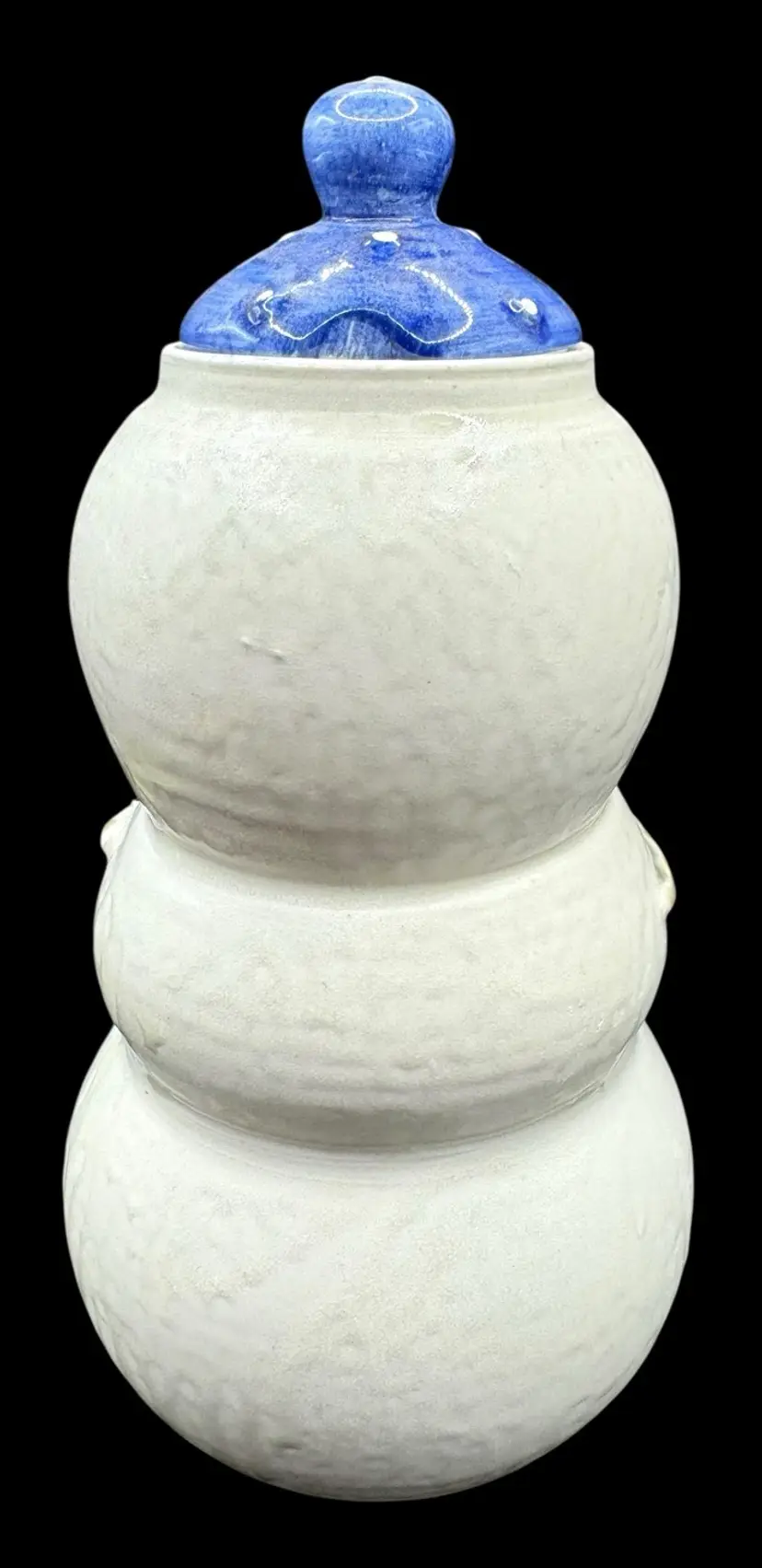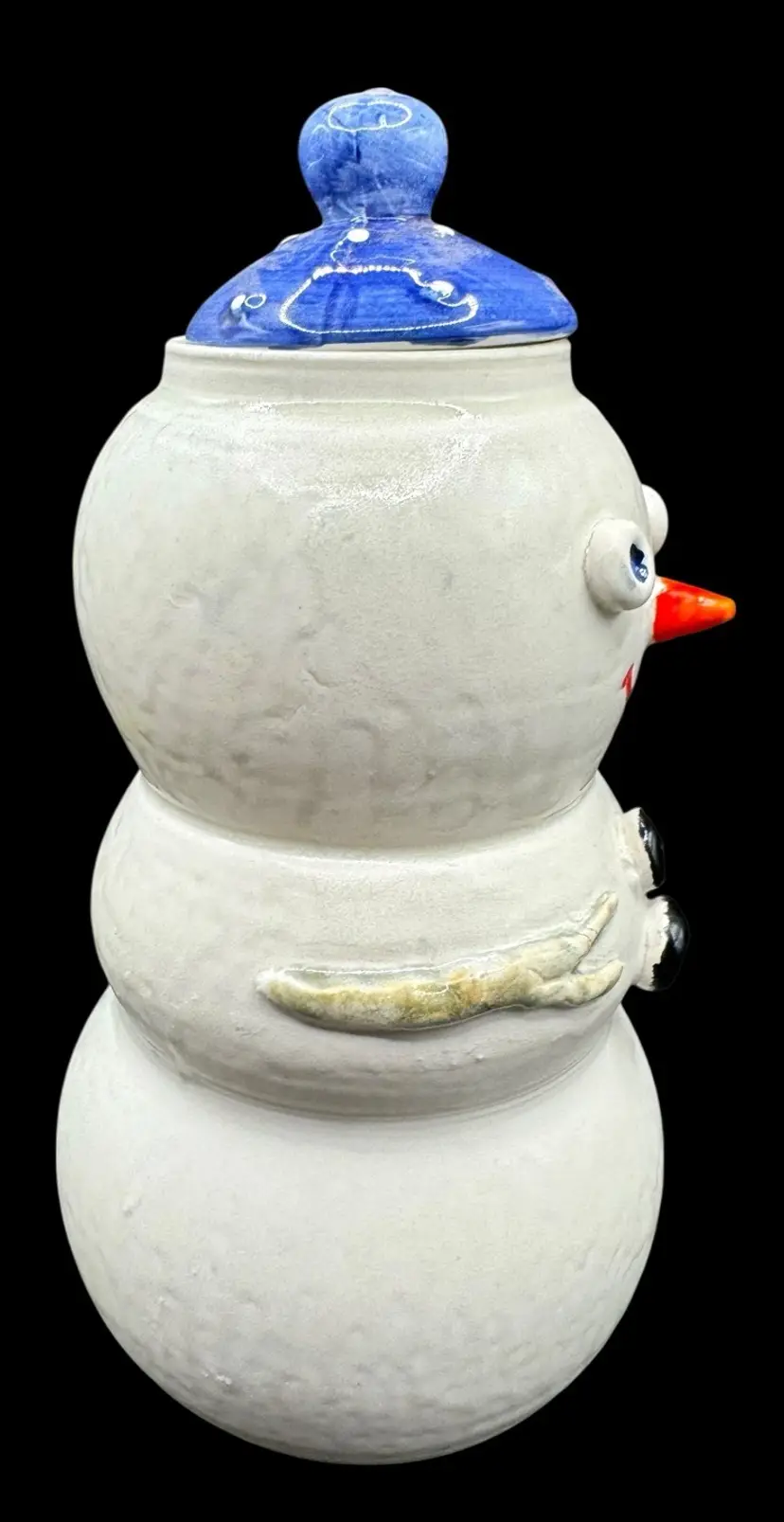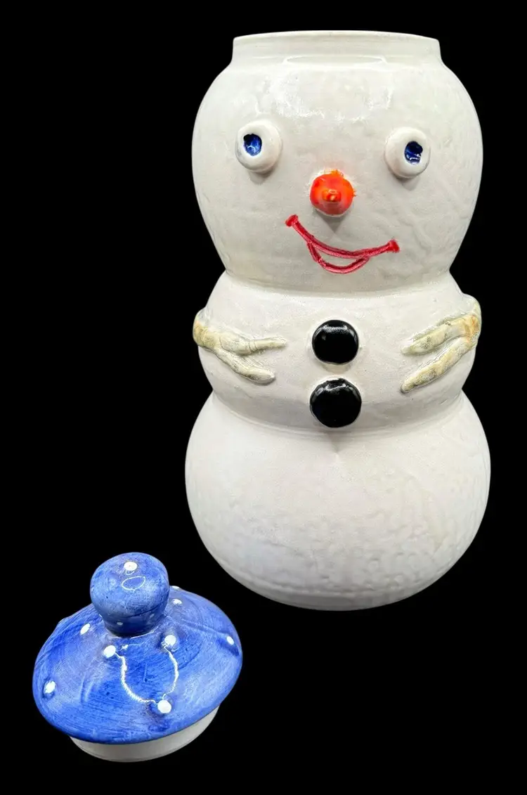 Handmade pottery canister of cookie jar shaped like a snowman.