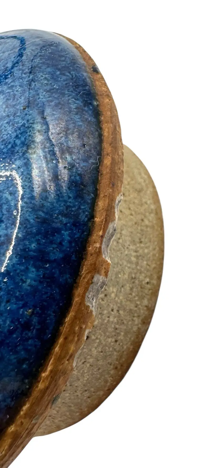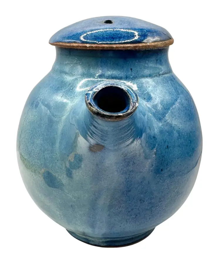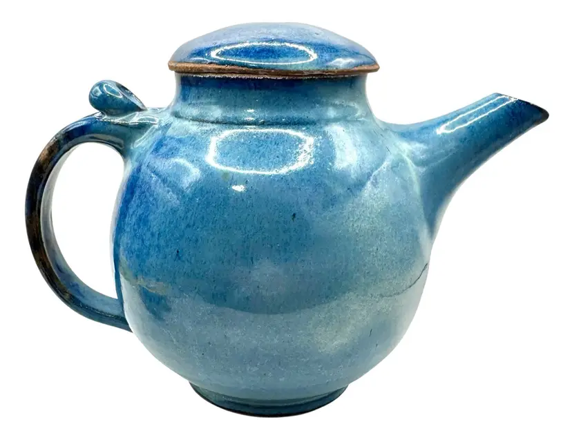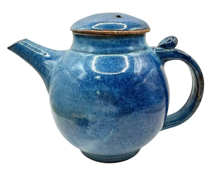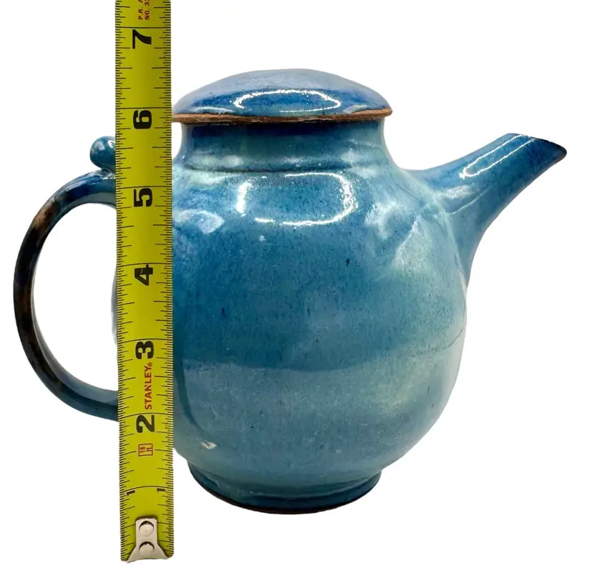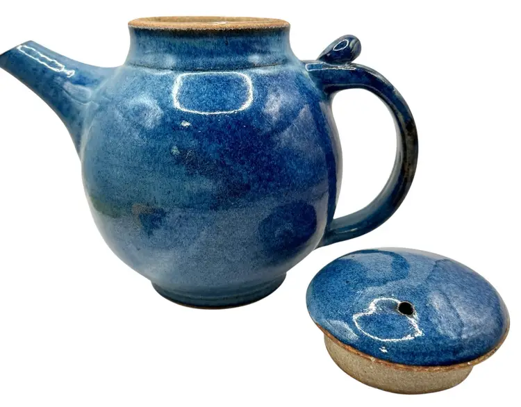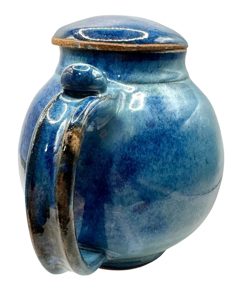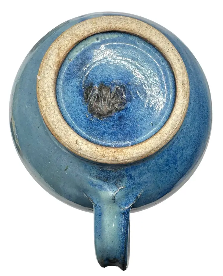 Beautiful blue teapot with a well designed handle. It is signed, however the artist is unknown.