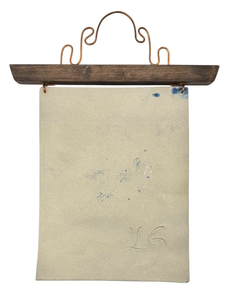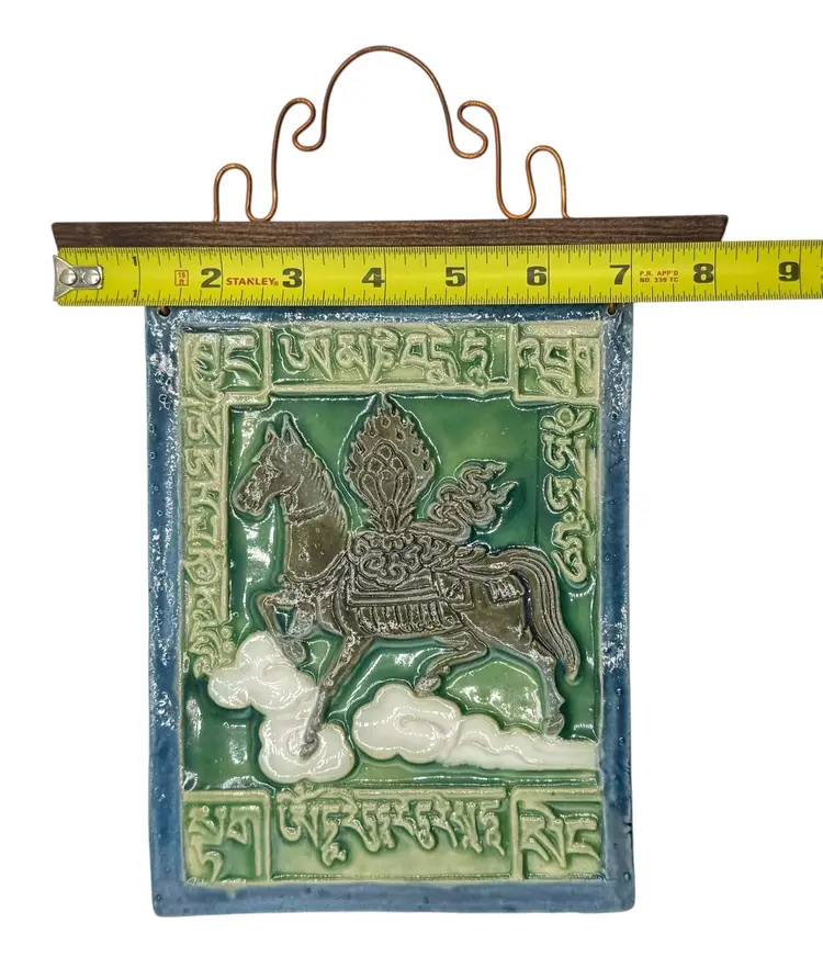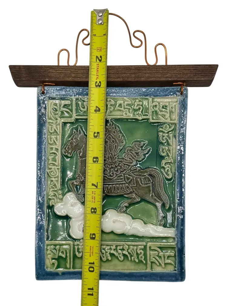 Unique wall tile with wood and copper mount. It features a Lungta or Wind Horse from Tibetan Buddhism. It has beautiful blue and green glaze. It is marked LG on the back.