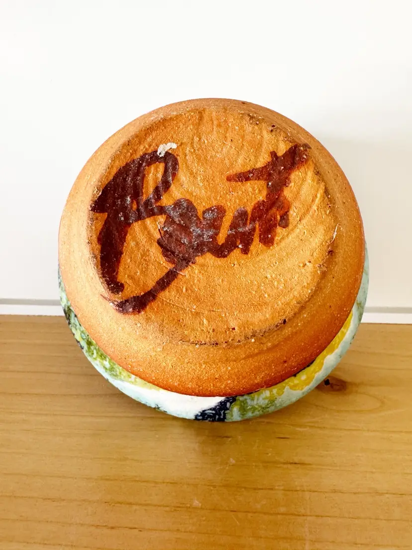 Blue & yellow drip glaze Artist signed Popped bubble in glaze finish.