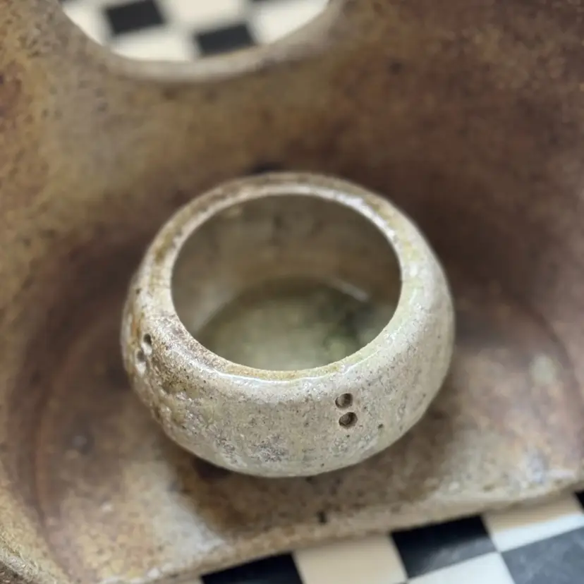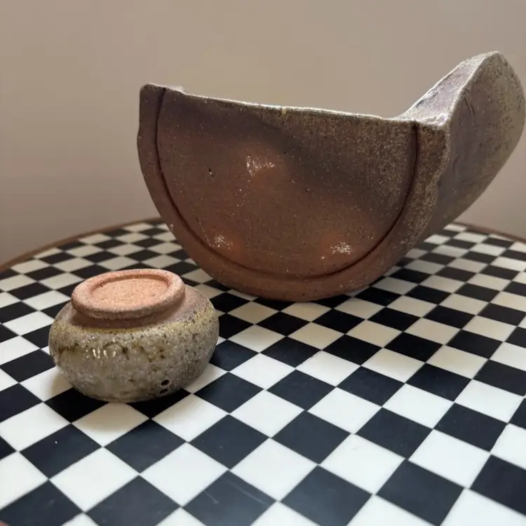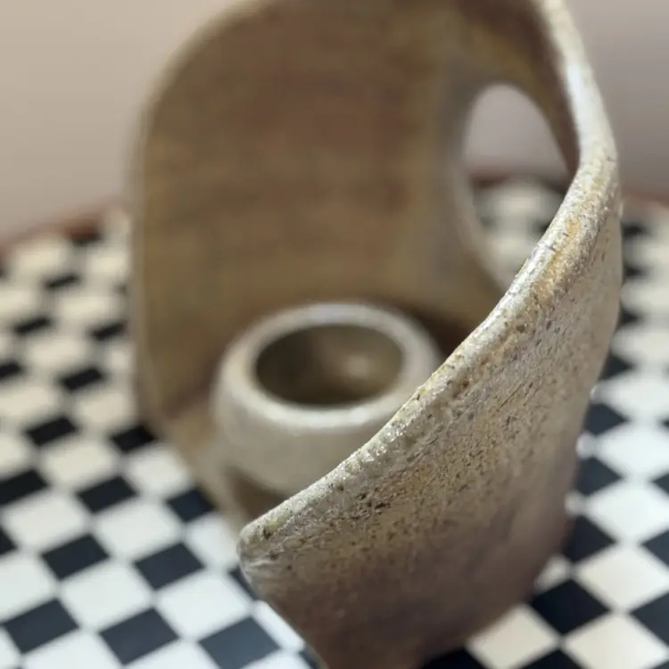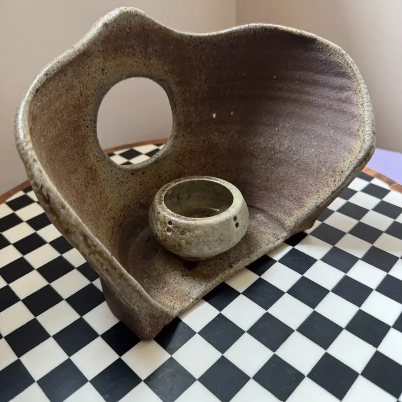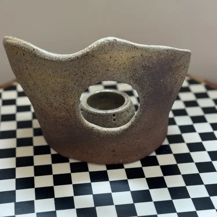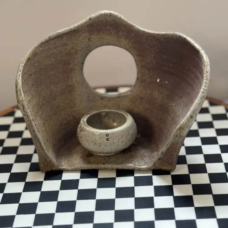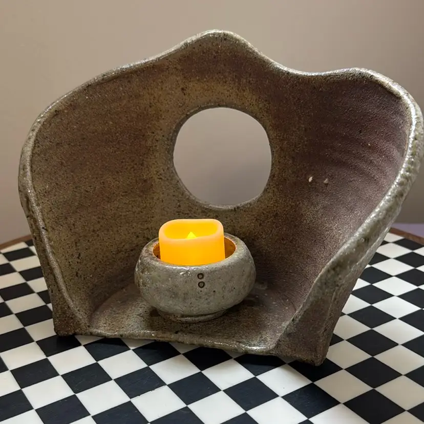 Heavy and rustic, signed (can’t read the name) studio pottery votive candle holder. Really beautiful earth tones. Measures about 9 inches wide and 6 inches tall. Would be awesome indoors or out on a deck! Ships alone due to weight.