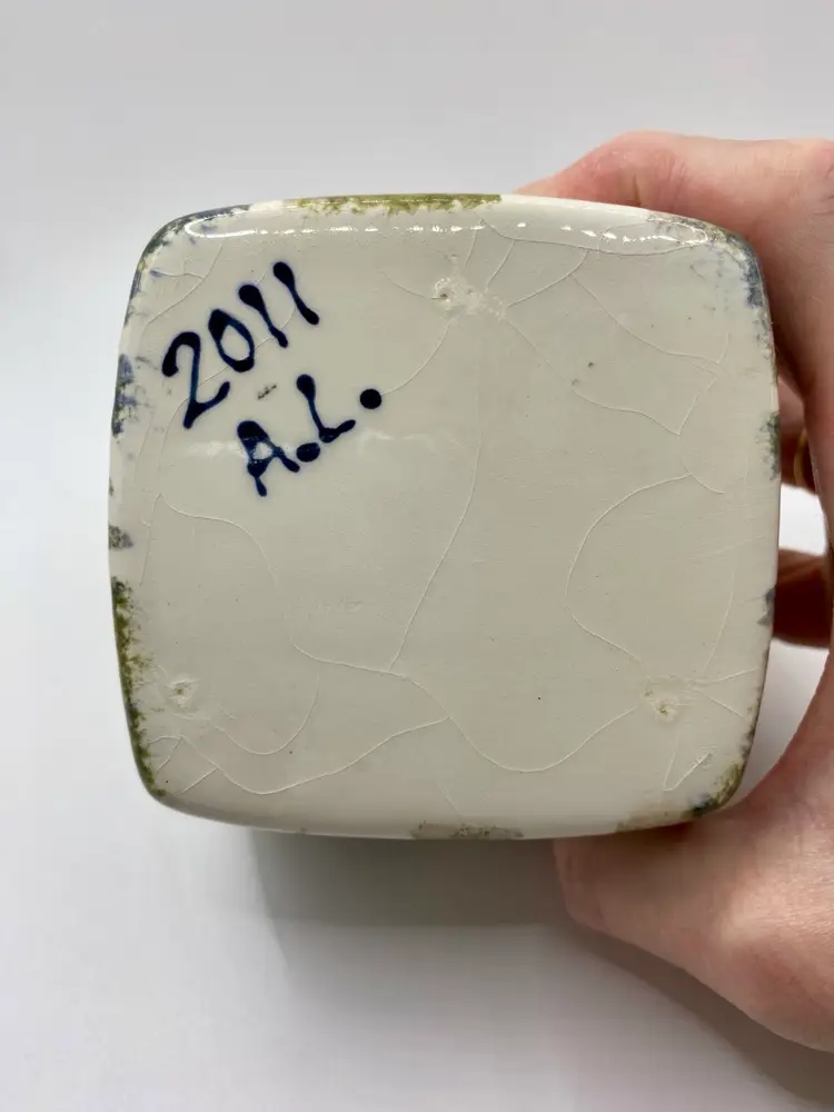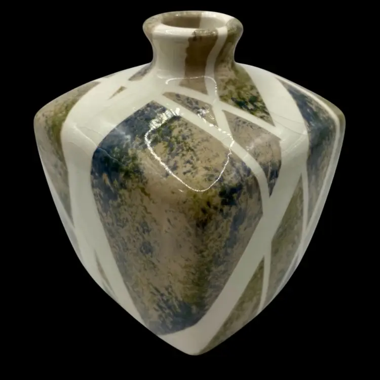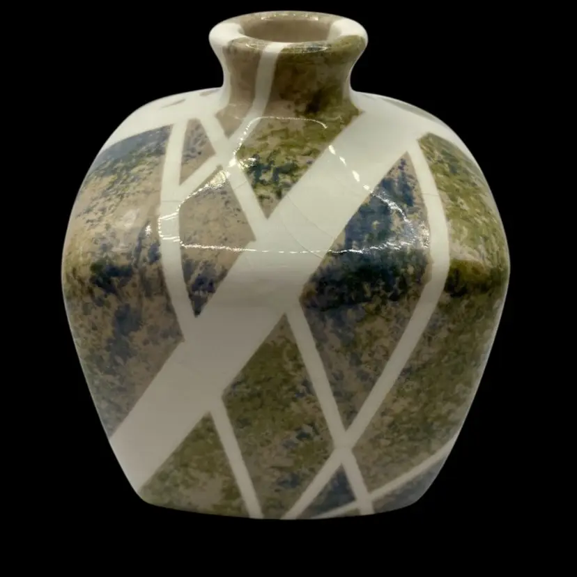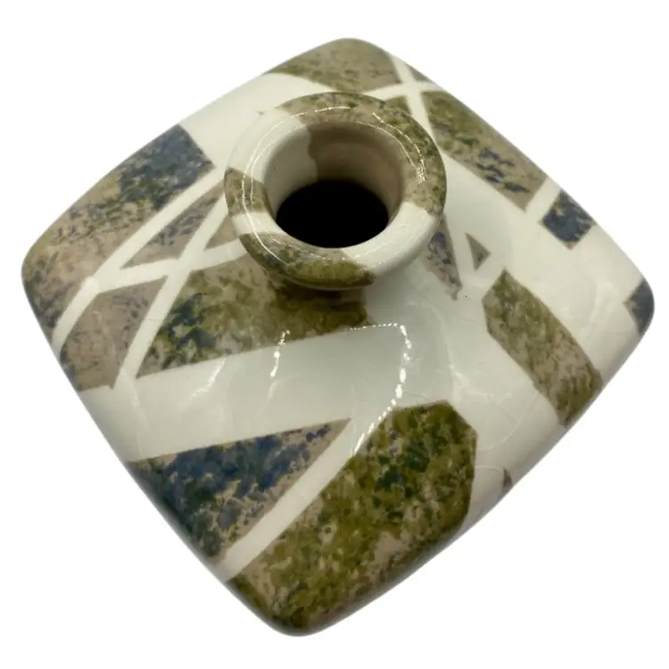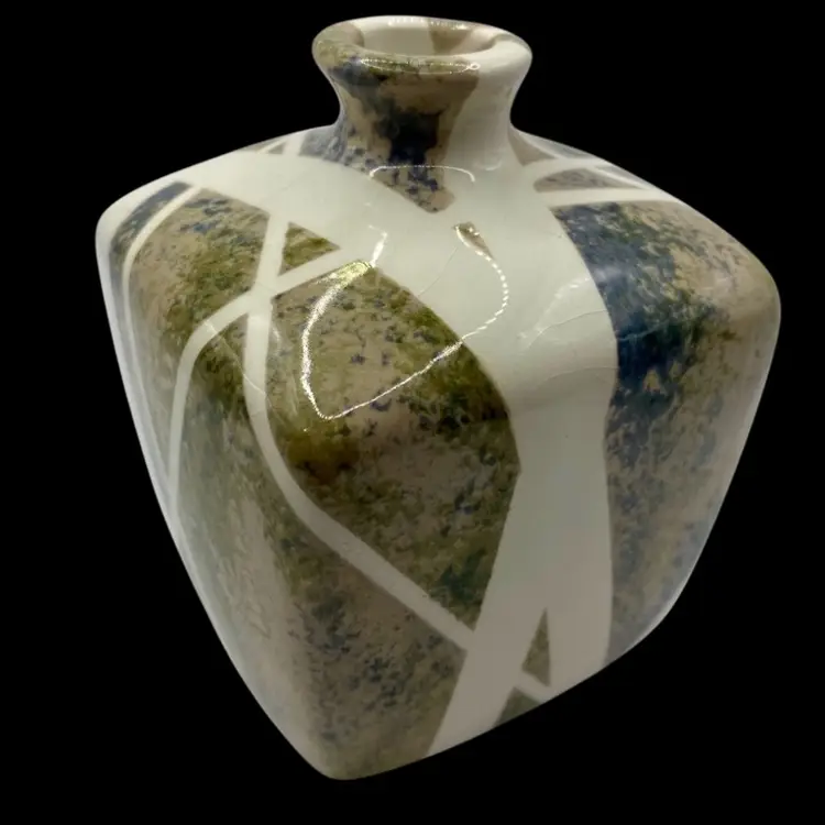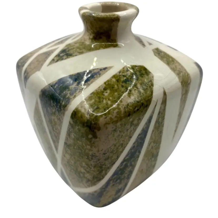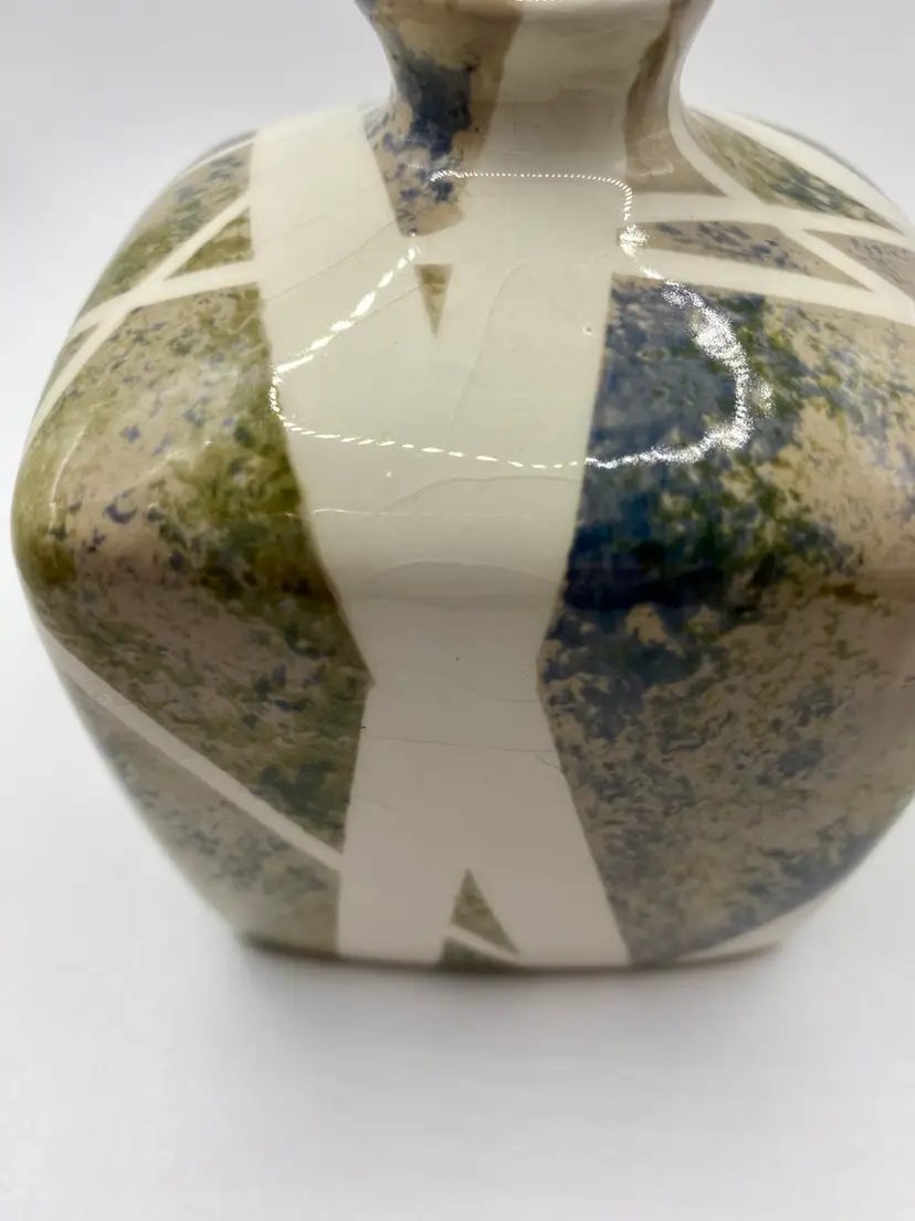 Add a touch of modern design to your home with this unique, handmade ceramic vase. Measuring 4.5 inches in height and 3.25 inches in width, this cube-shaped vase features an abstract pattern with multi-color glazes. The striping is in a cream glaze, laid over a speckled taupe, greens, blues and gray glaze. It is a one-of-a-kind piece, signed by the artist A.L. in 2011.