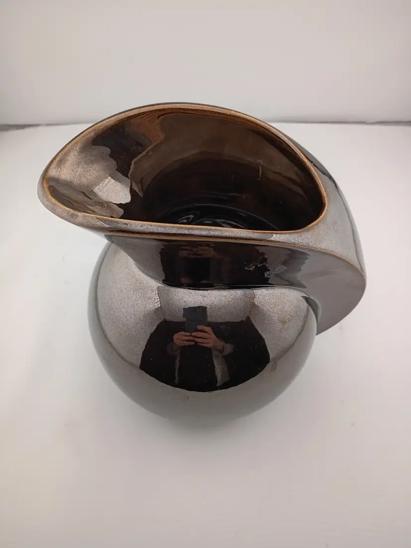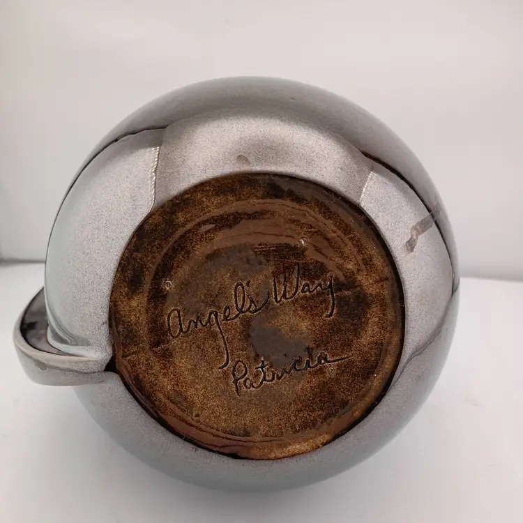 This is a stunning studio pottery vessel with an ultra-modern shape and metallic glaze. It's signed "Angel's Way Patricia" and in excellent condition with no chips or cracks.
