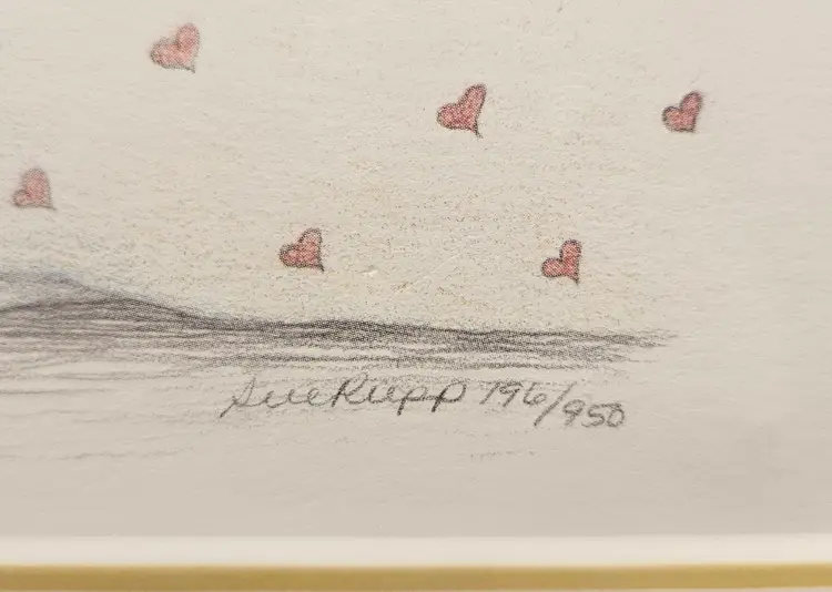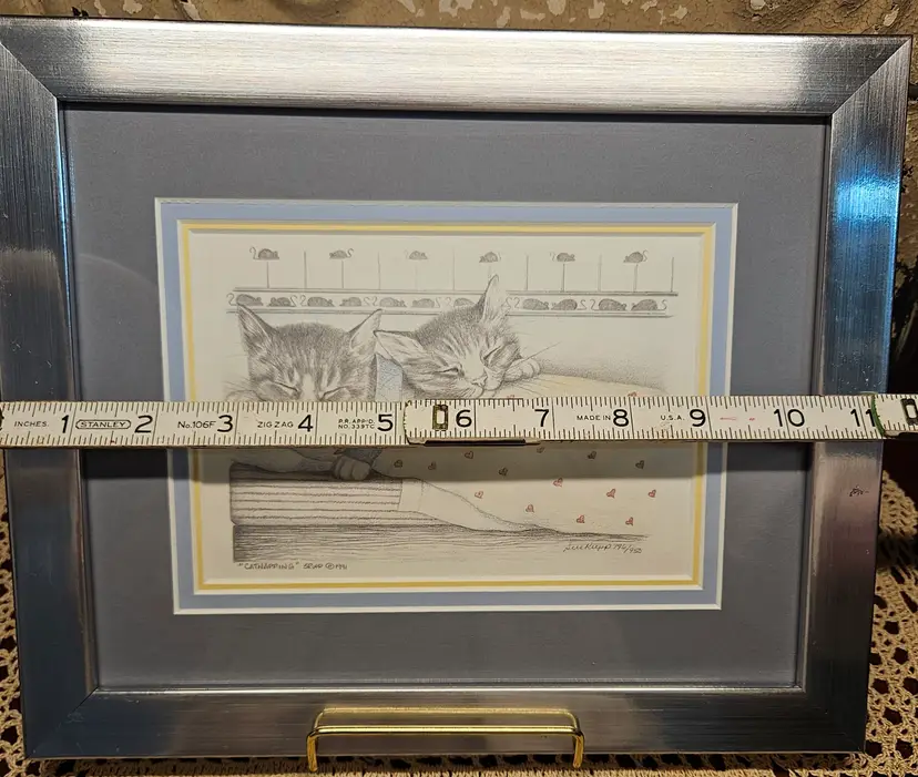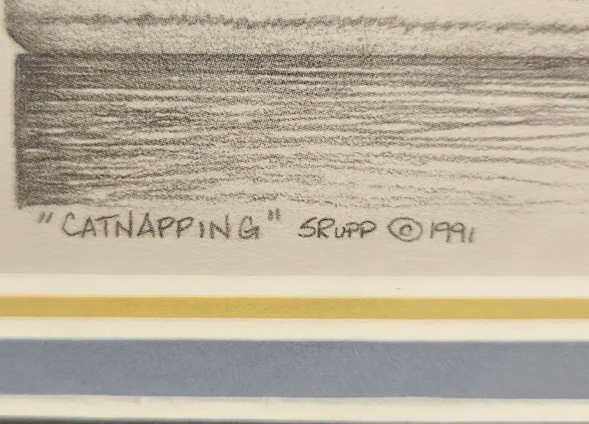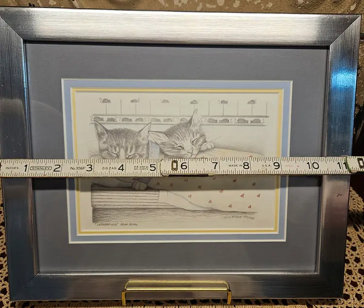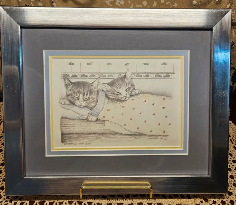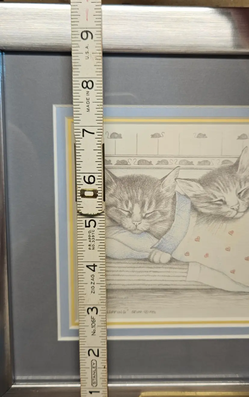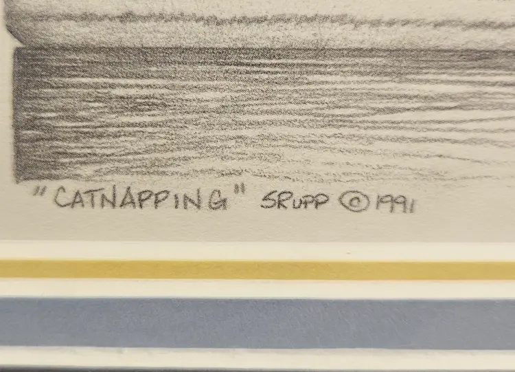 Signed Sue Rupp 1991 "Catnapping" Framed Matted Art Print 196/950 10" x 11" Landscape Orientation Wall mount Frame has some very small dents (see photos).