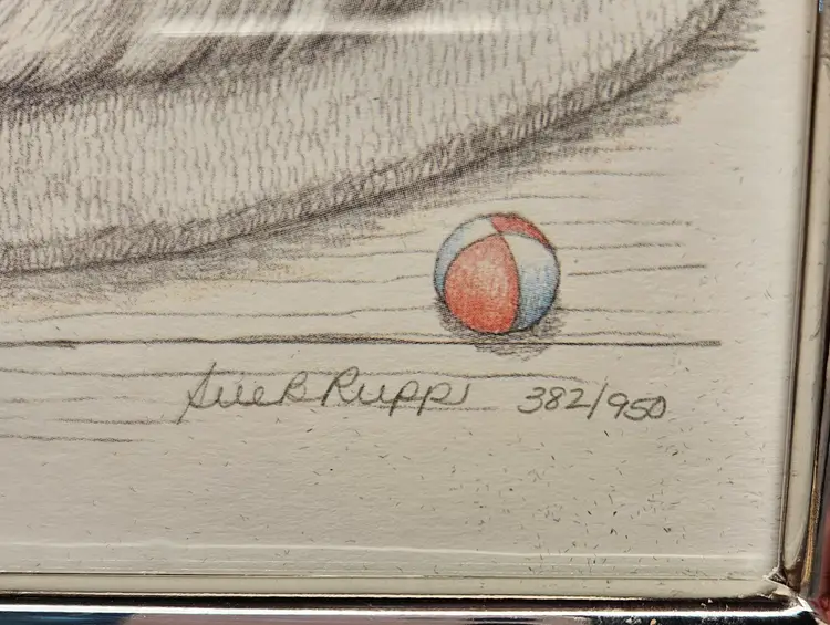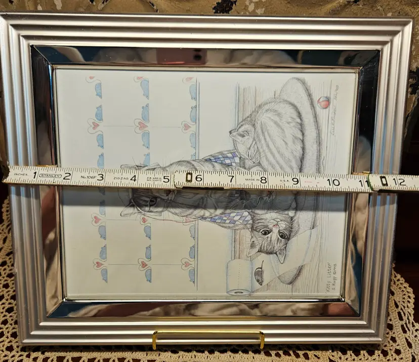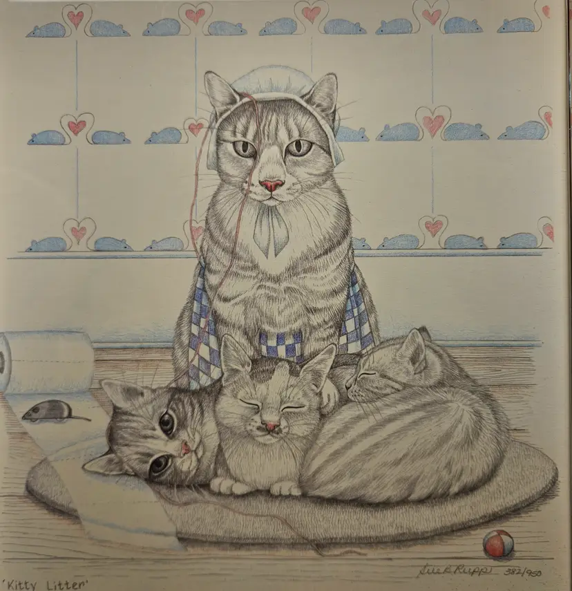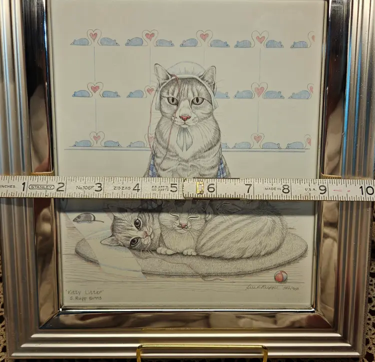 Signed Sue Rupp 1993 "Kitty Litter" Framed Matted Art Print 382/950 10" x 12" Portrait Orientation Wall mount Frame may need to be replaced, as the tabletop stand has been removed.