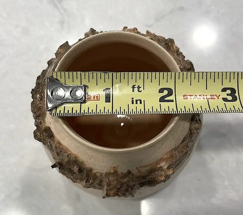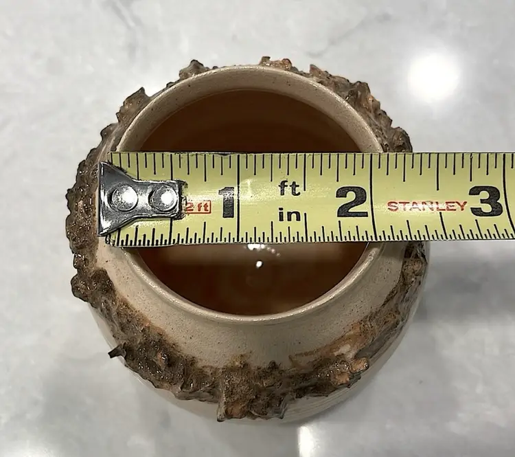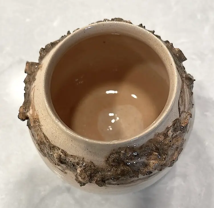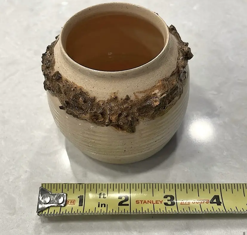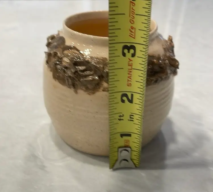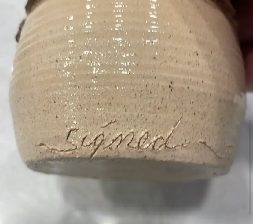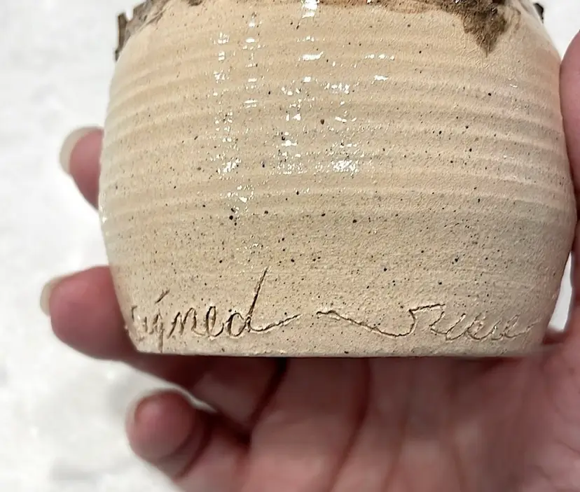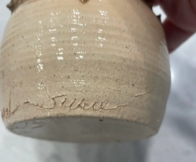 “Signed ~ Susie”, adorable handmade, glazed pottery vase in soft tan/brown with sand ruffle. Sweet room accent! Please see pictures for measurements.