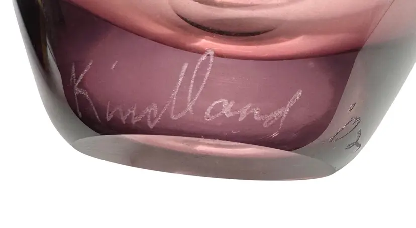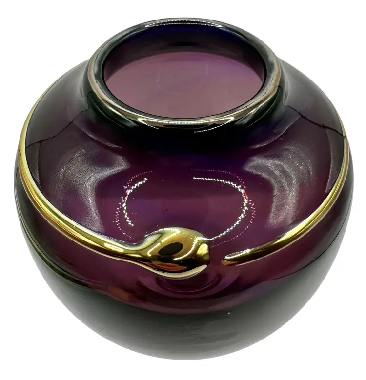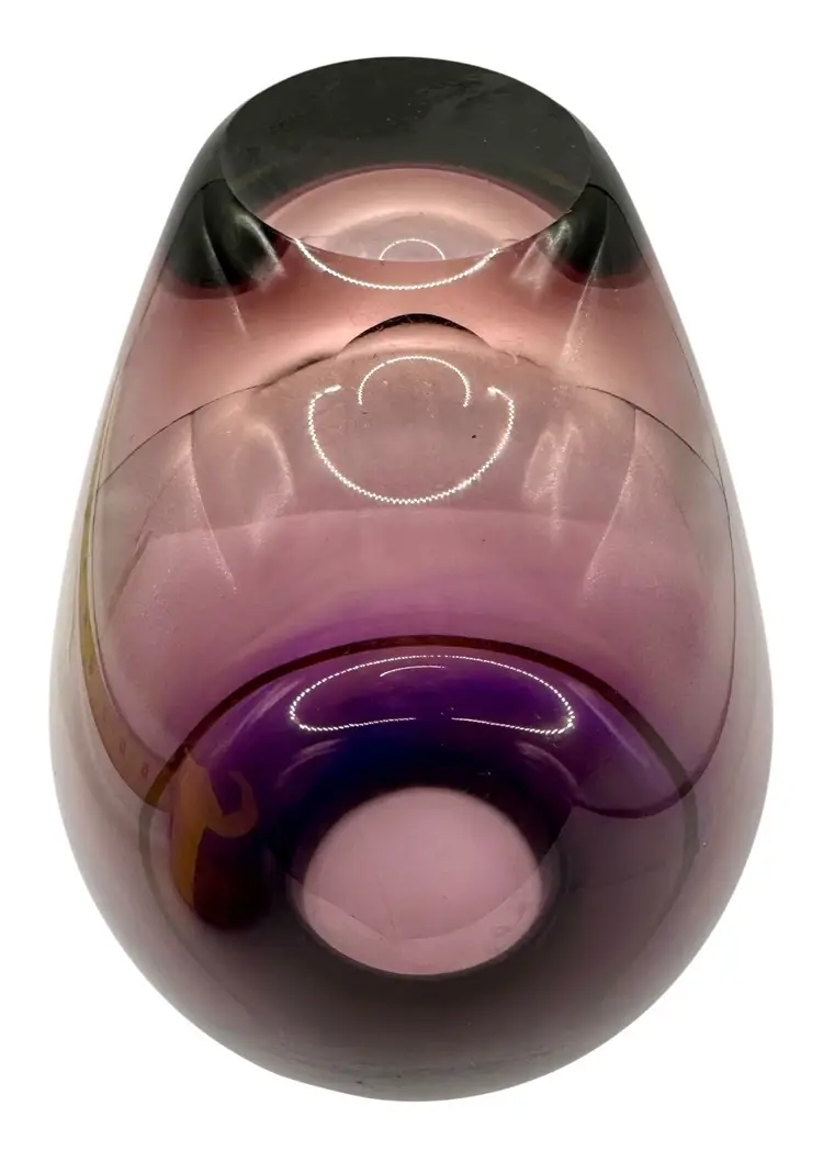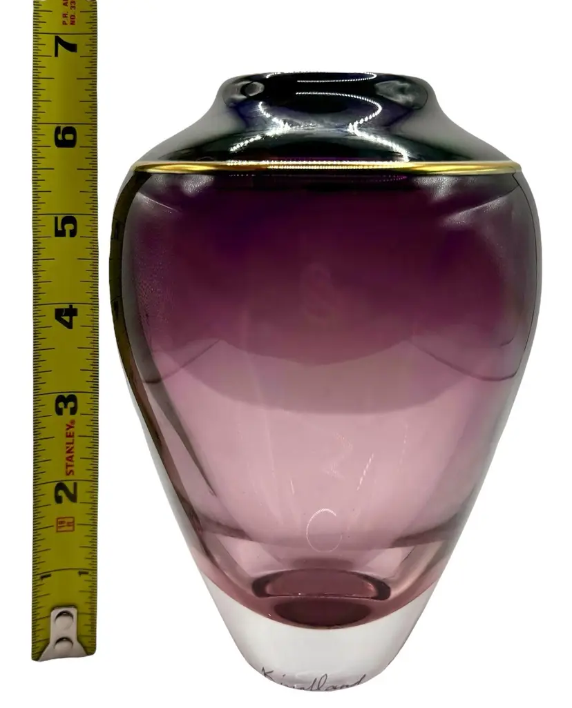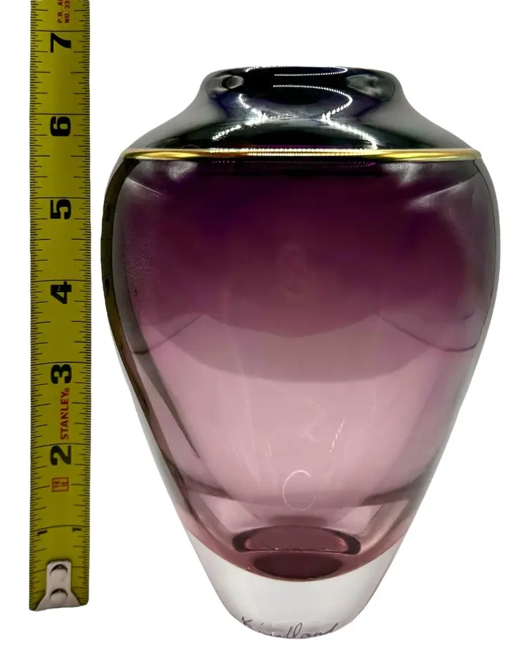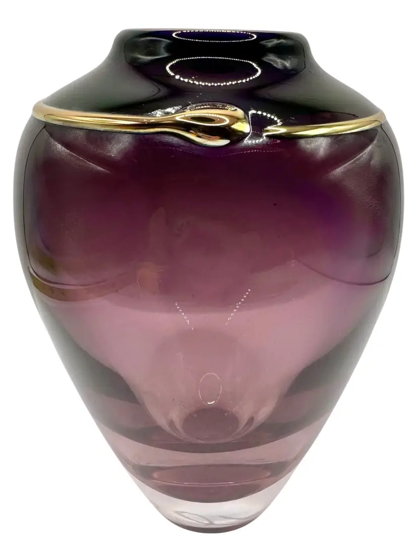 Beautiful hand blown glass piece signed by Suzanne Kindland of Icefire Glassworks in Oregon. It is an amethyst purple to lighter pink purple ombré, with a gold ring around the top.
