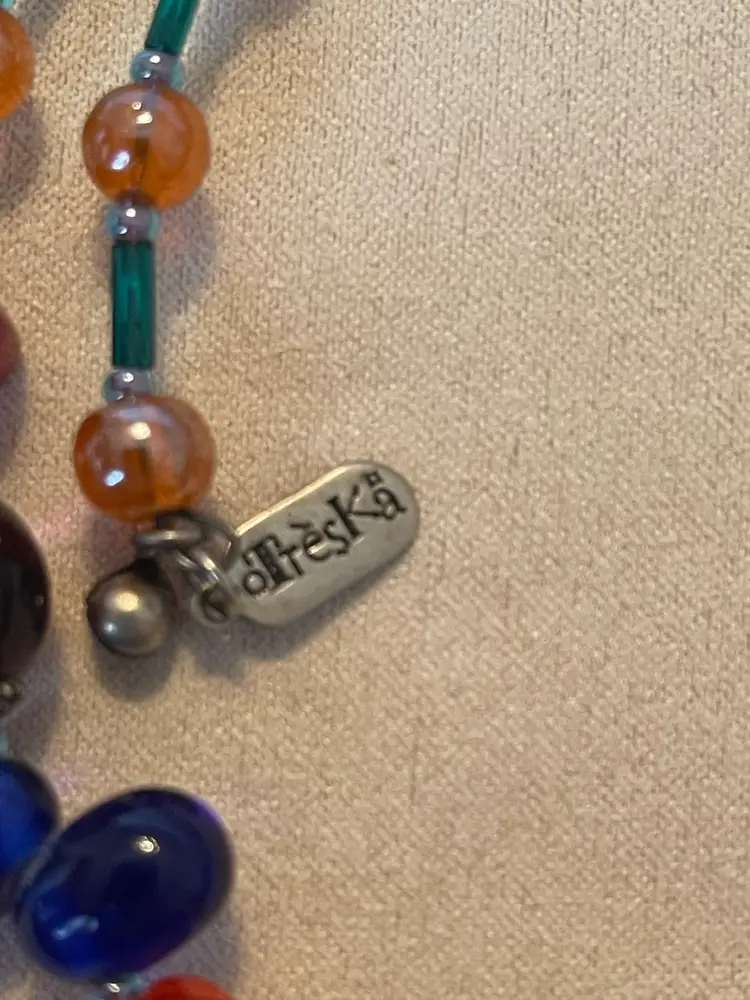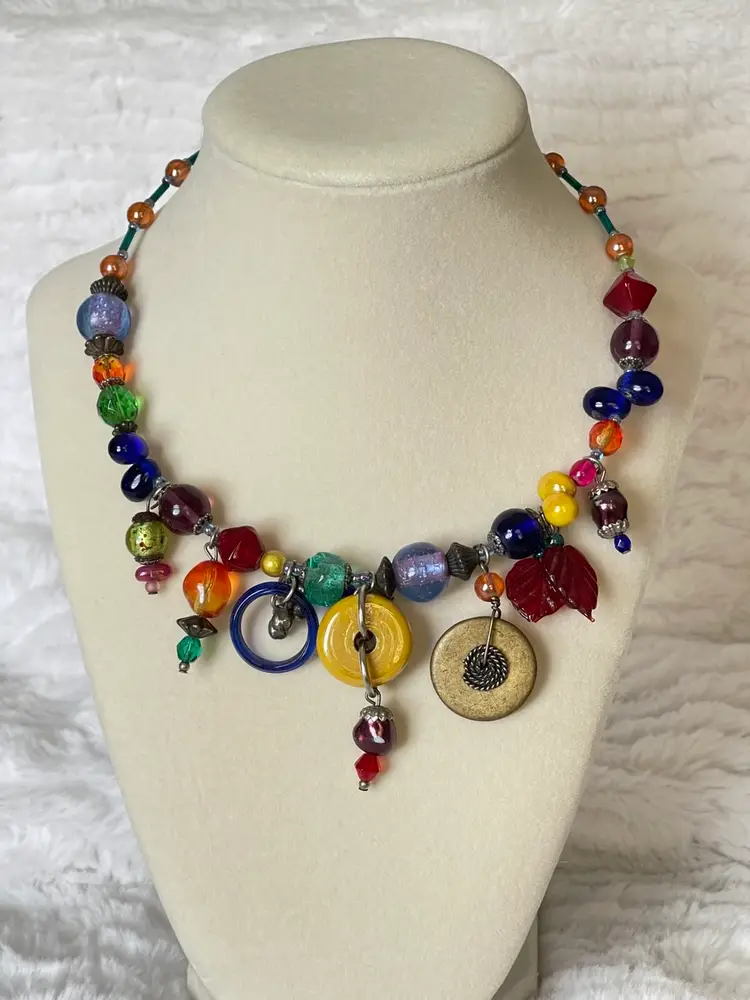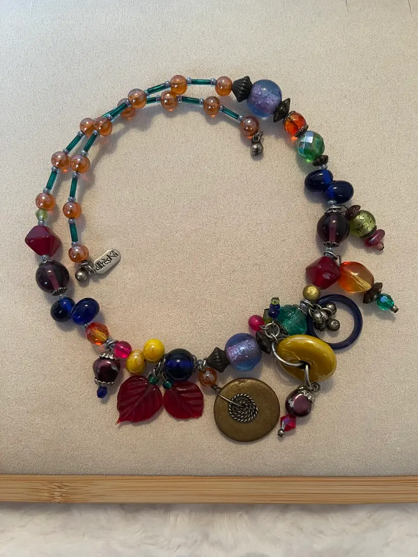 • Signed Treska tag • Vintage 1990s production • Lampwork and art glass beads • Mixed metal accents with dangling charms • Statement / boho / artisan aesthetic
