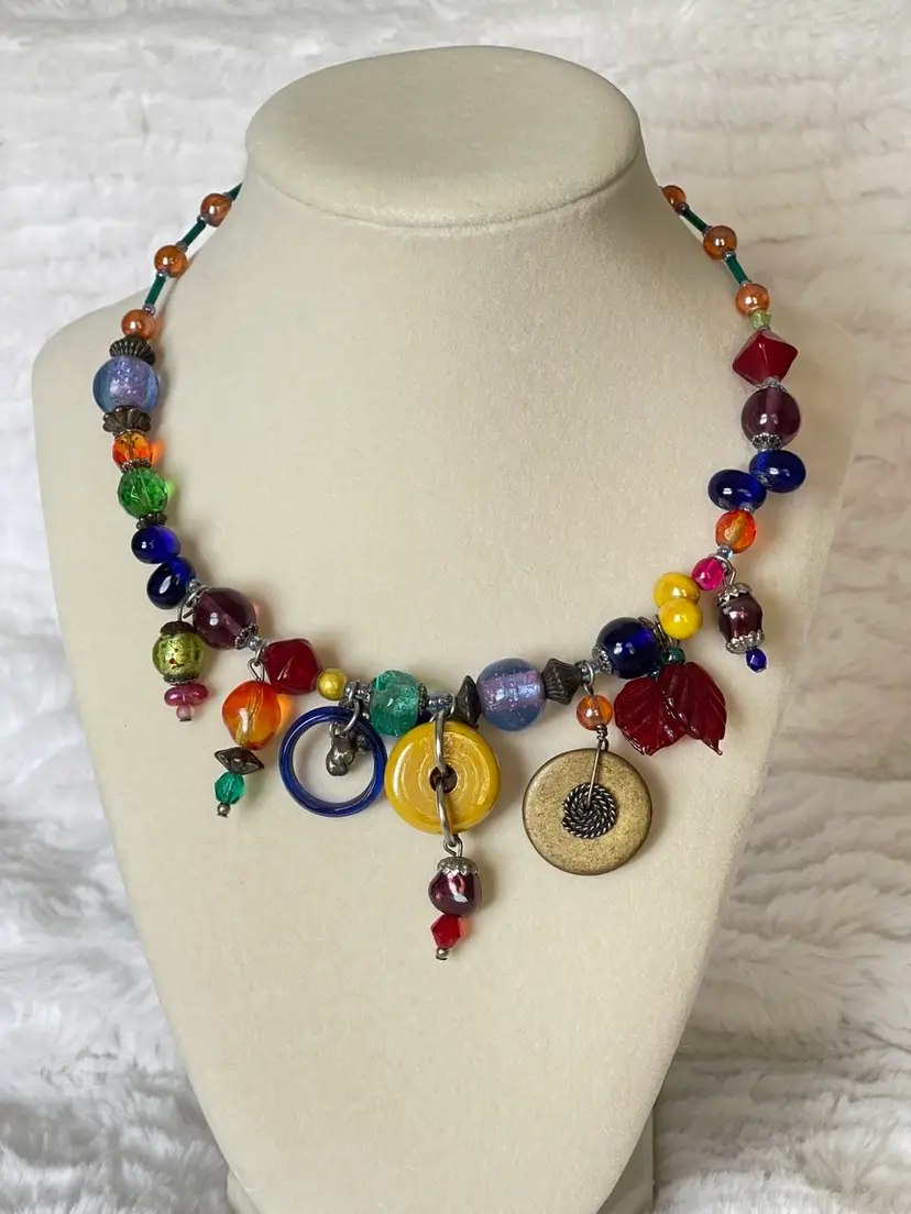 Authentic vintage signed Treska necklace from the mid-to-late 1990s (circa 1996–1999). This bold statement piece features handmade lampwork glass beads, foil-core glass, and an eclectic mix of colorful artisan beads with dangling charm accents.