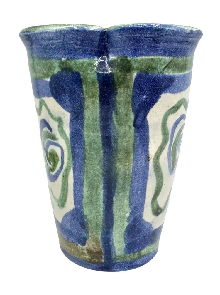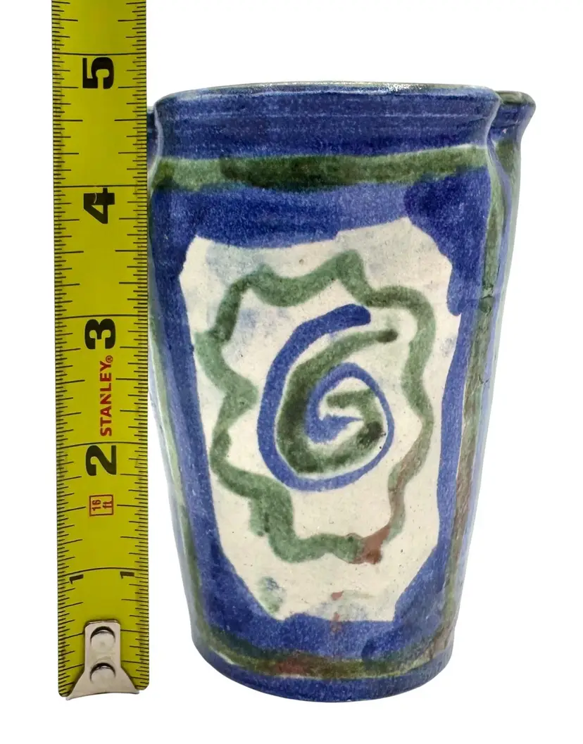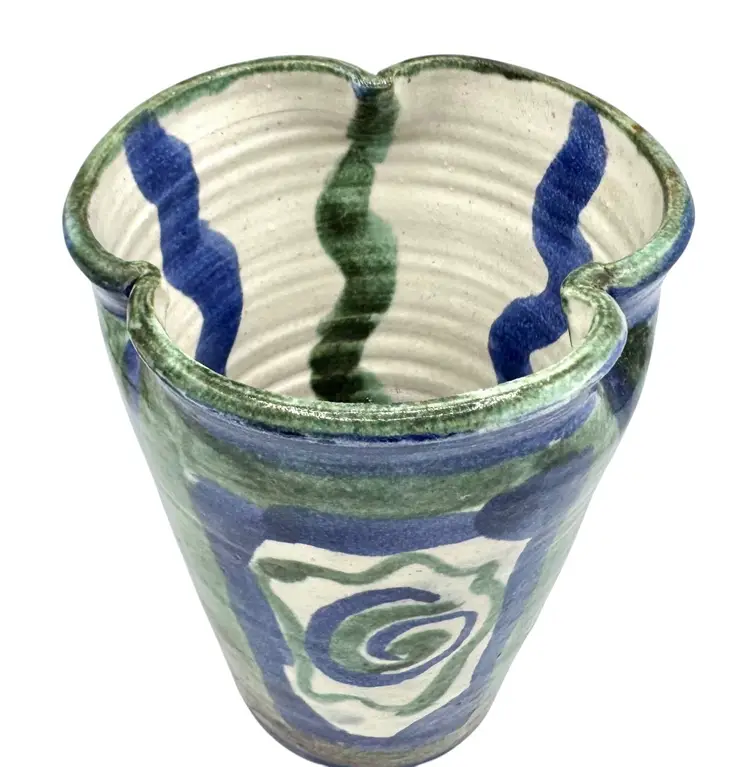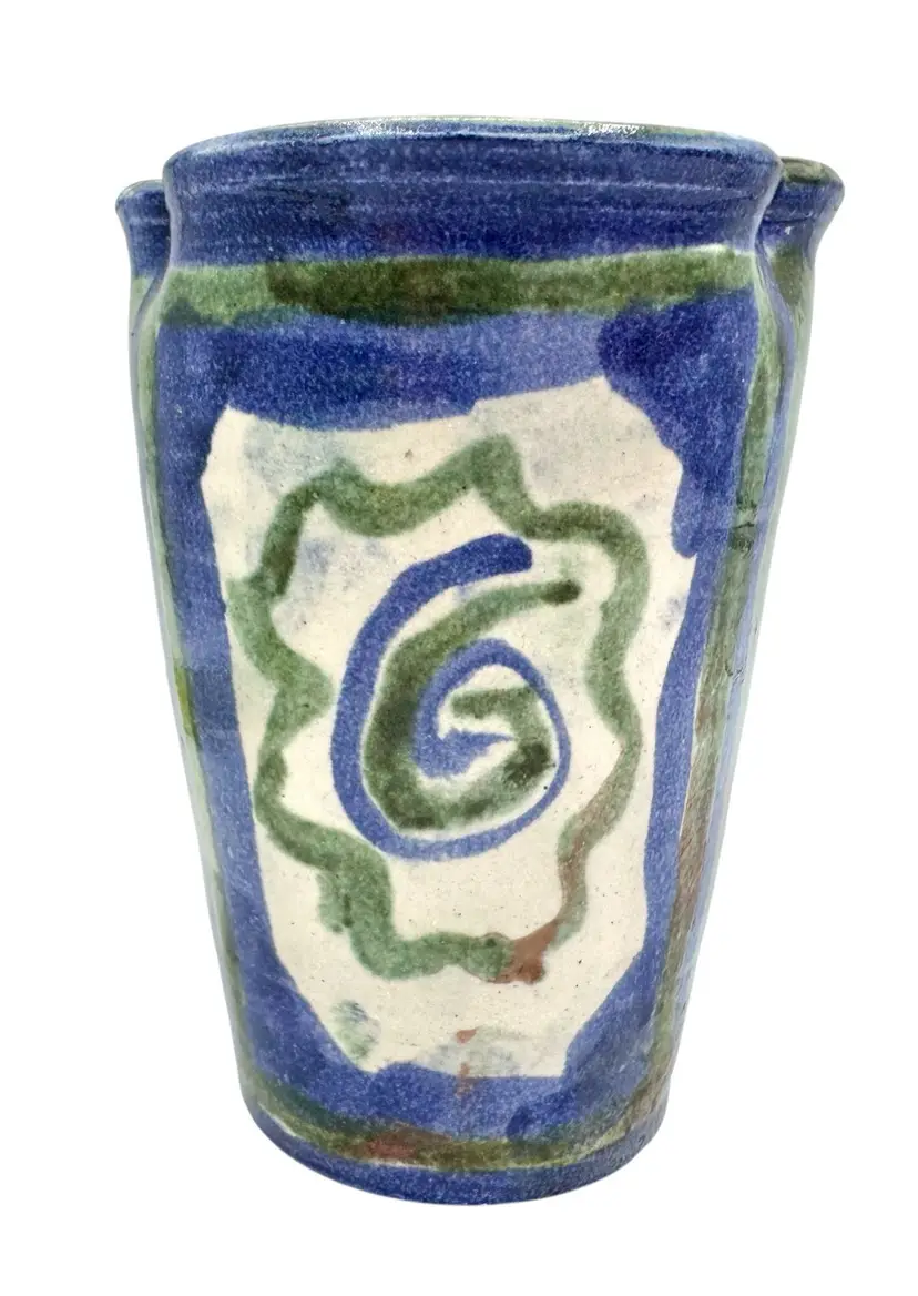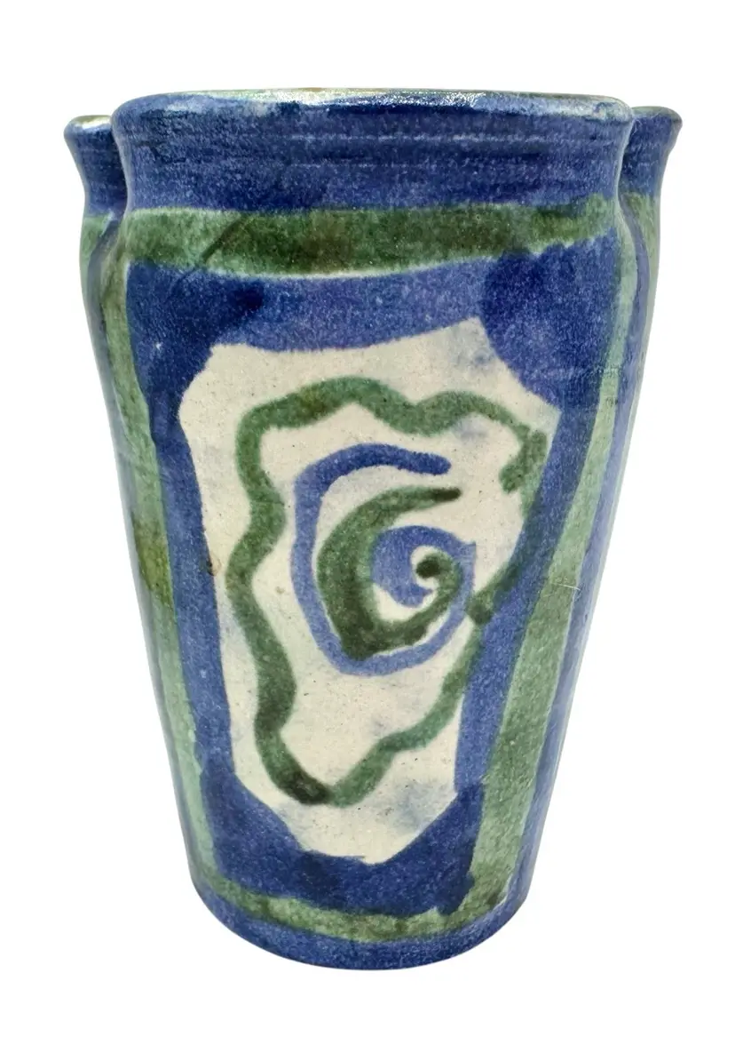 Pottery tumbler cup or vase with a swirly blue and green design. Appears to have been Raku fired based on the charring on the bottom.