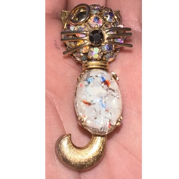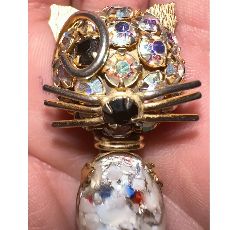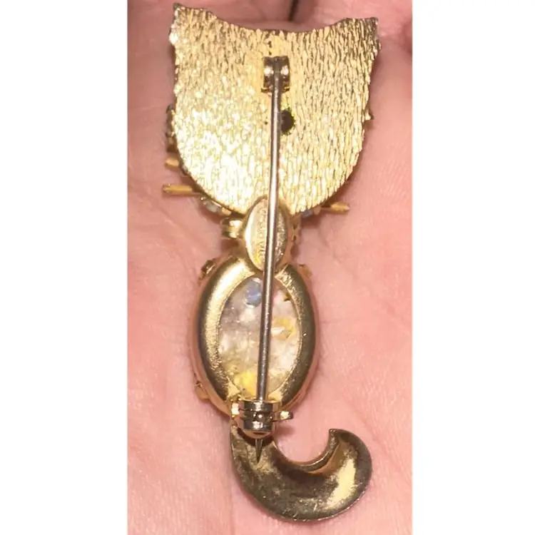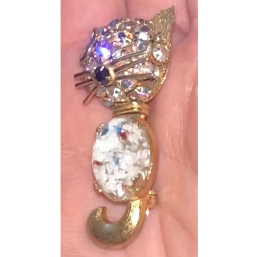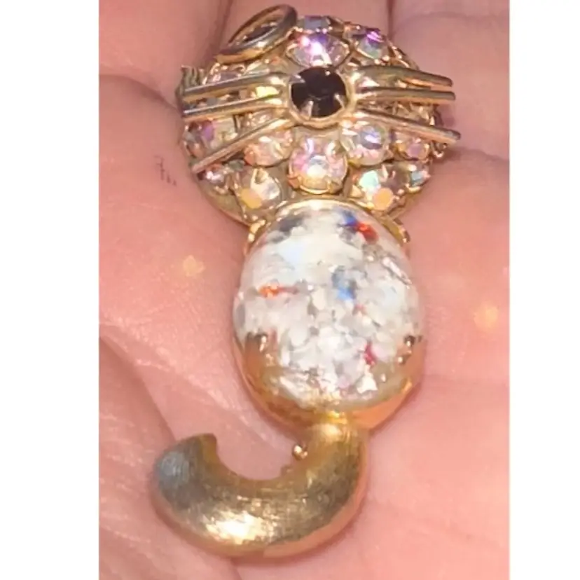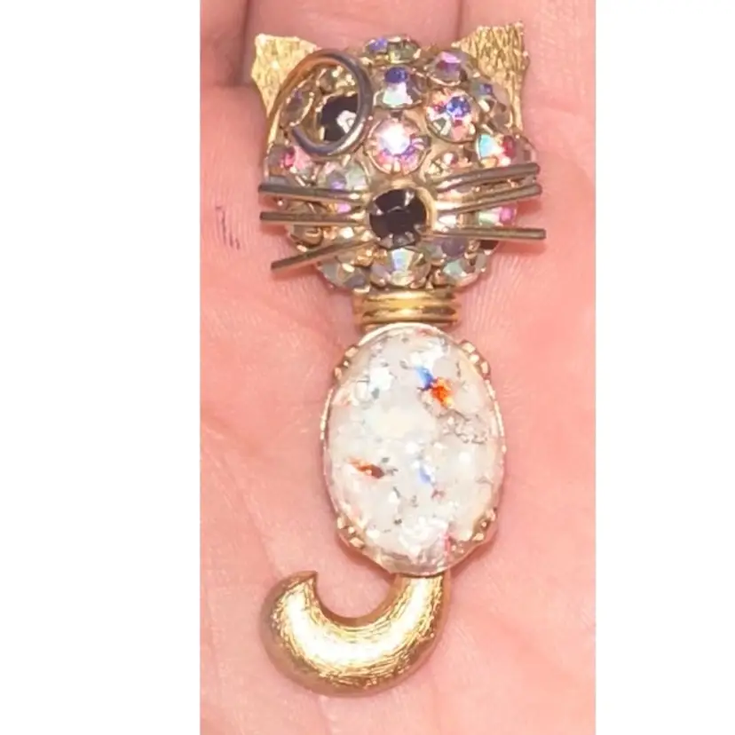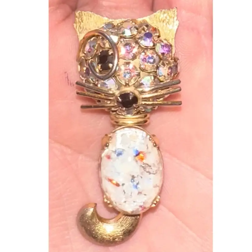 SIGNED WARNER Brooch Pin Kitty Cat Gold Tone Clear Rhinestone Jelly Belly Brooch