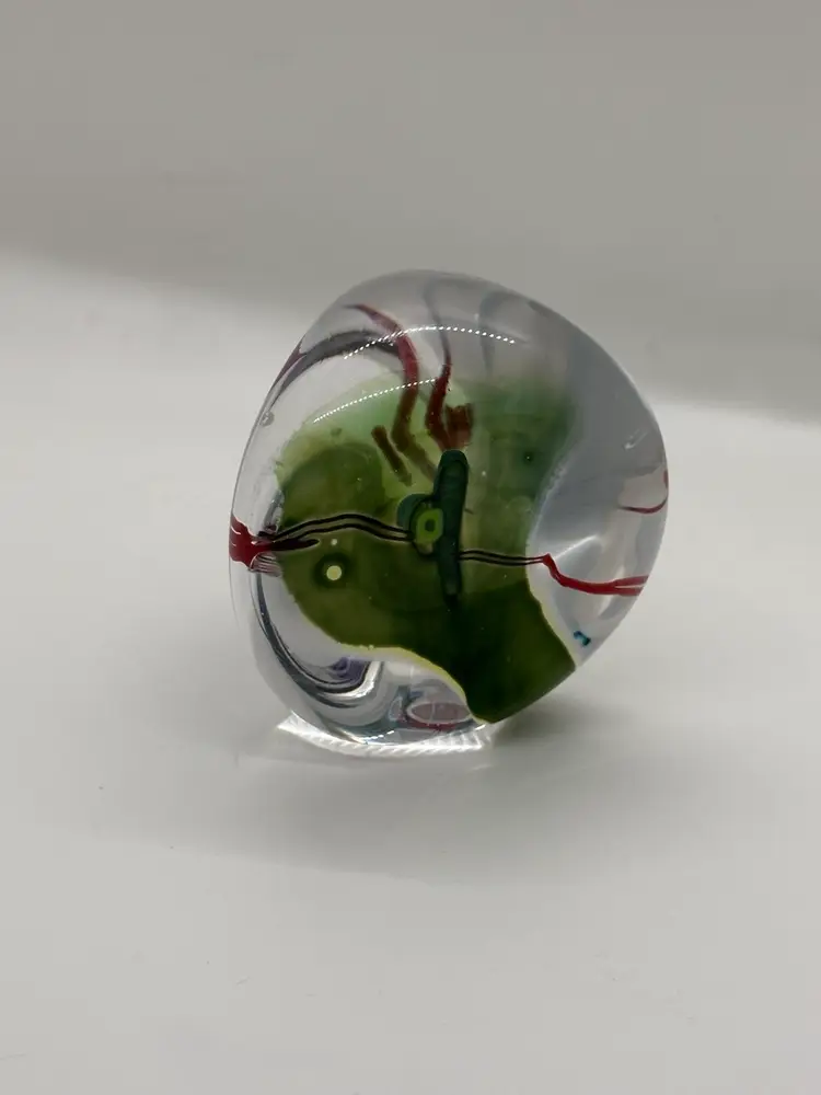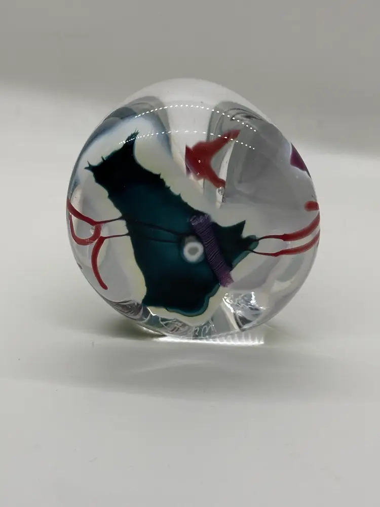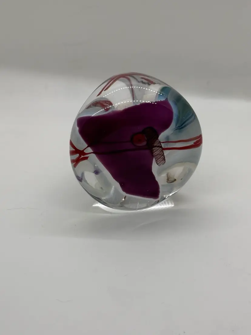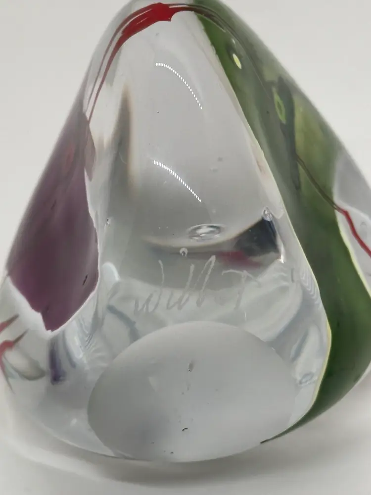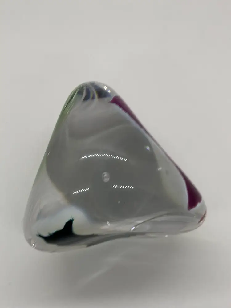 A signed art glass paperweight by Wilbat. Triangle shaped with abstract designs on each side. Smooth frosted bottom with a little bit of scratches. 3”x3”.