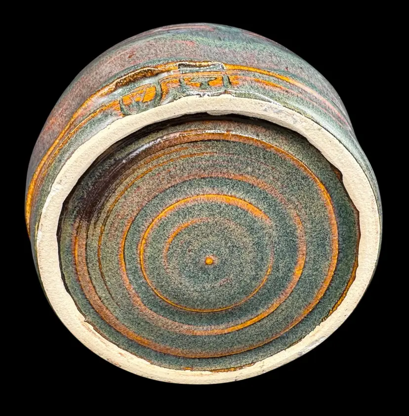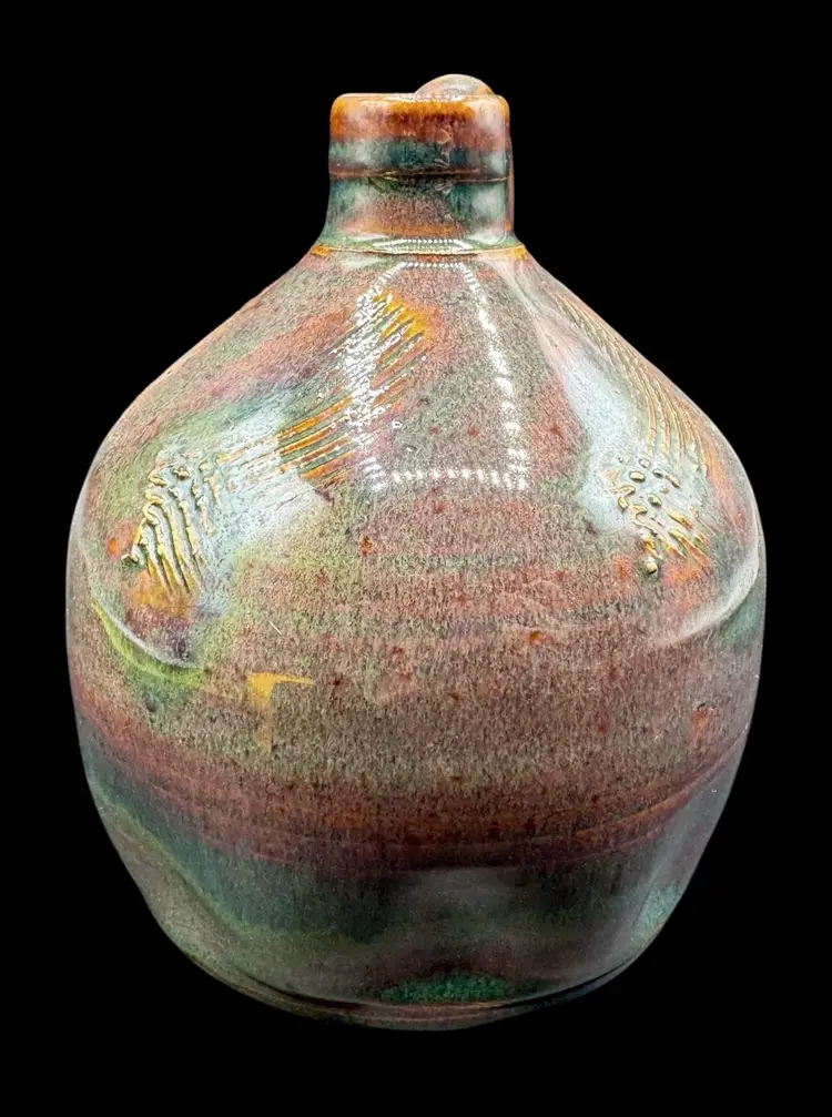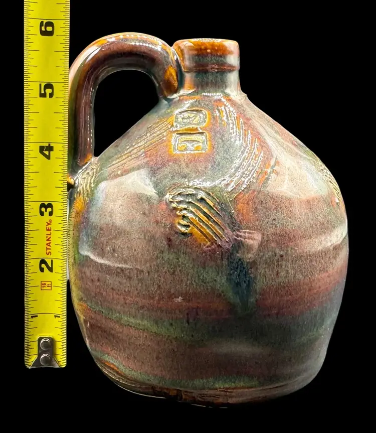 Pottery jug marked with a ‘WT.’ it has a unique drip glaze that reads brown and gray under darker light, then a rainbow of color under brighter light.