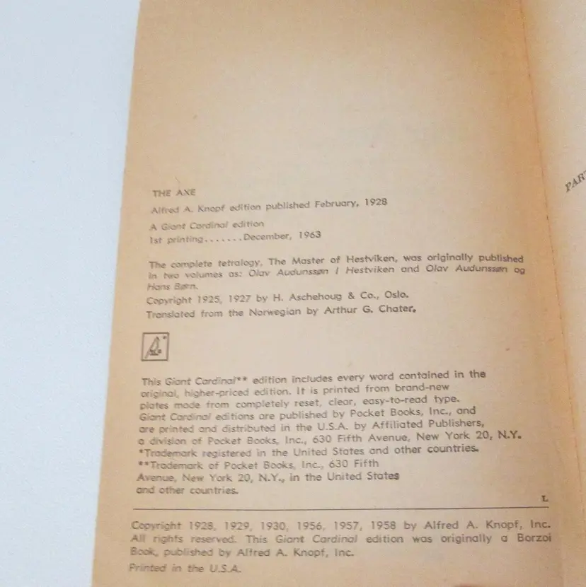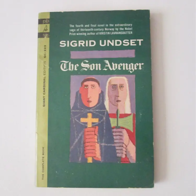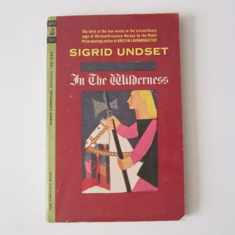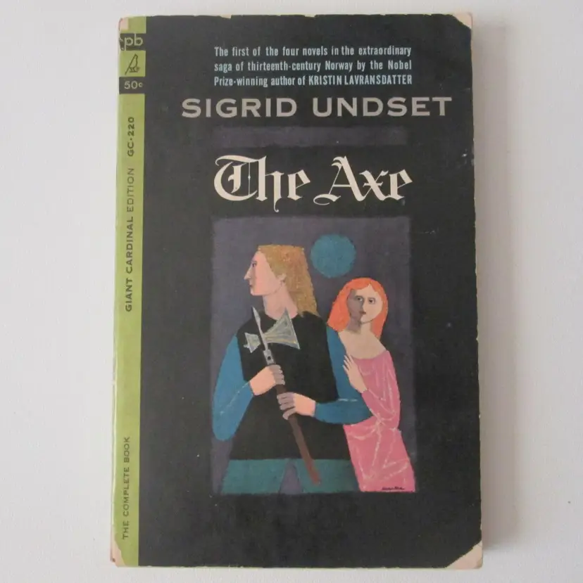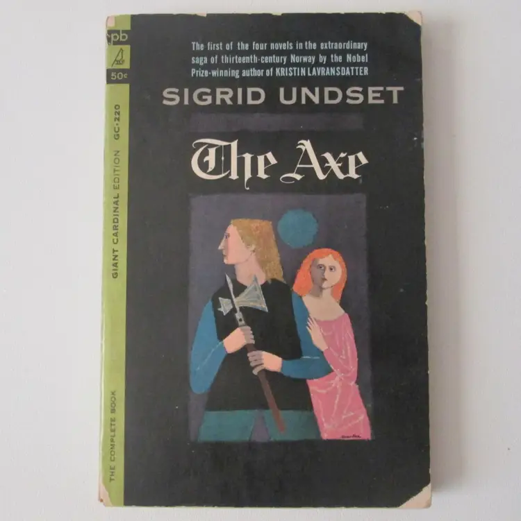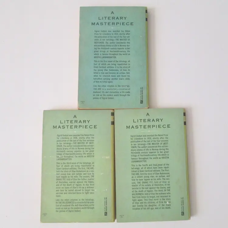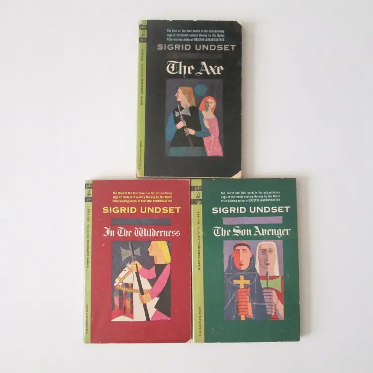 Lot of three Sigrid Undset rare paperback books from 1964. By a Nobel Prize winning author. Books 1, 3 and 4 in a four book series about 13th century Norway. All three books are first Giant Cardinal edition printings. Wear to covers, with clipped corners and minor damage at spine. Some pages splitting at spine, but all still attached.