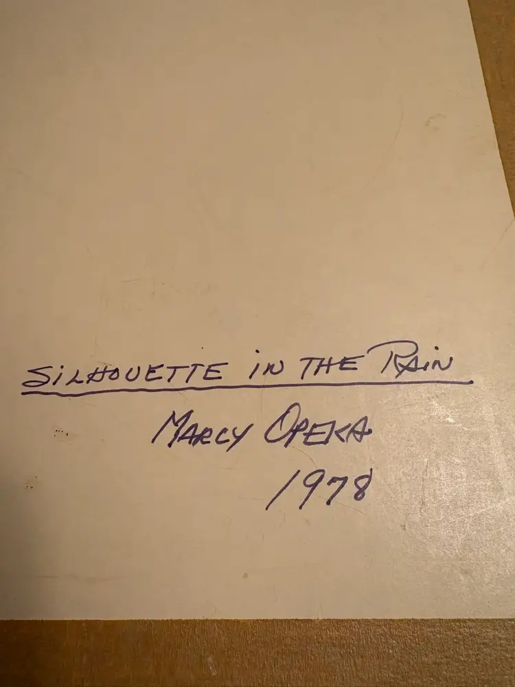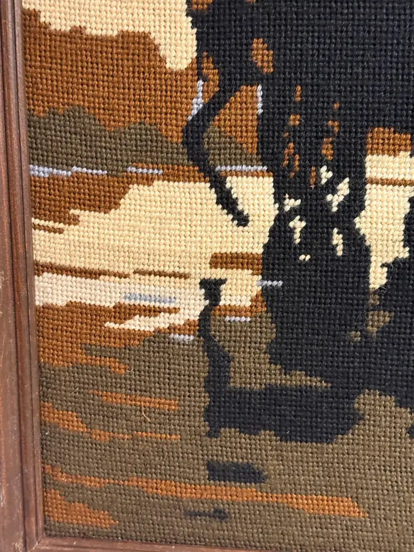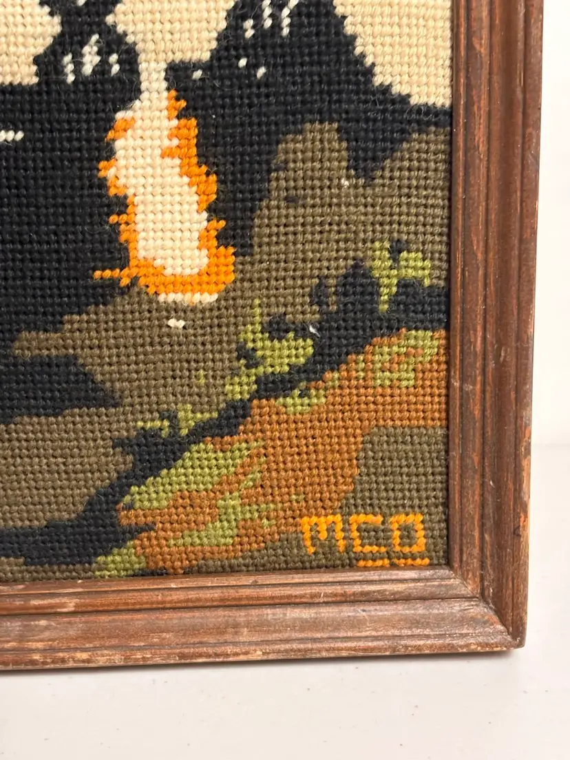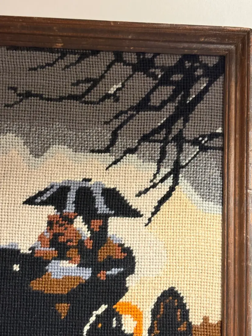 The product is a finished needlepoint piece titled "Silhouette In The Rain” done in 1978. This needlepoint artwork features a silhouette of a figure in the rain, likely created with intricate detail and precision. Needlepoint is a type of embroidery that involves stitching individual yarn through a pre-stretched fabric, such as canvas, to create a detailed and textured design. This piece would make a unique and eye-catching addition to any home decor or as a thoughtful gift for someone who enjoys handmade crafts and artwork.