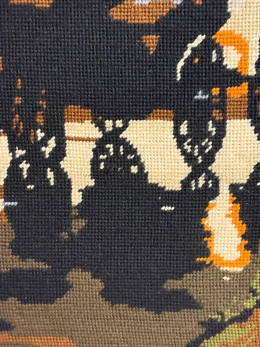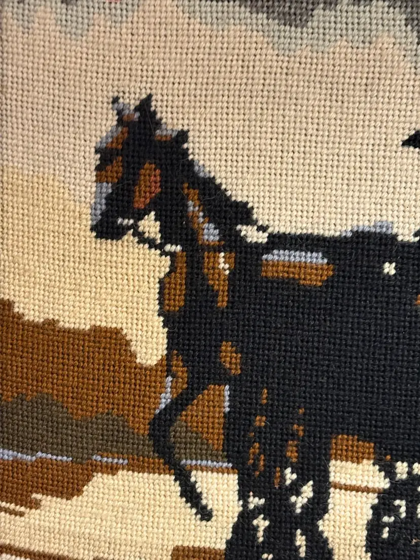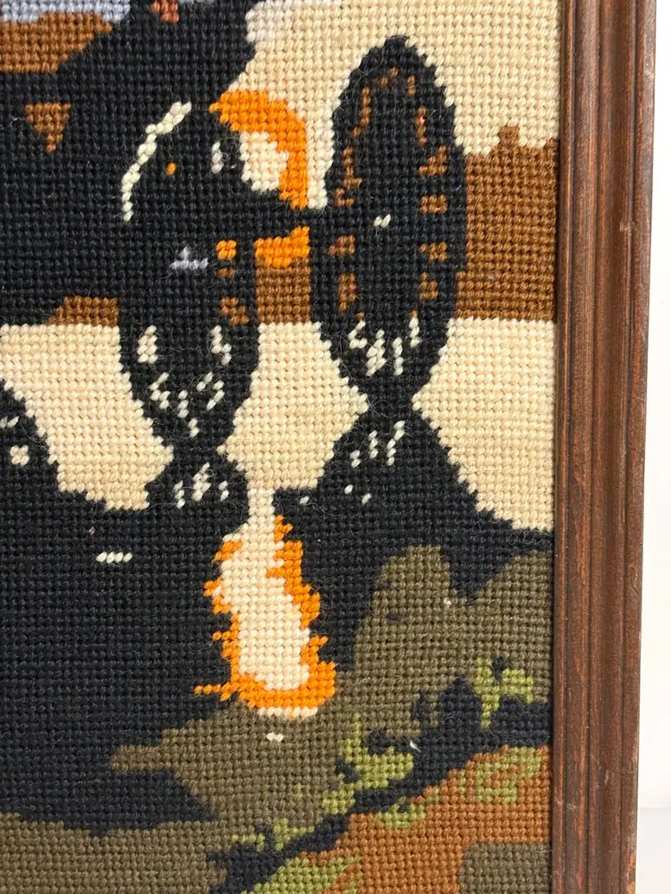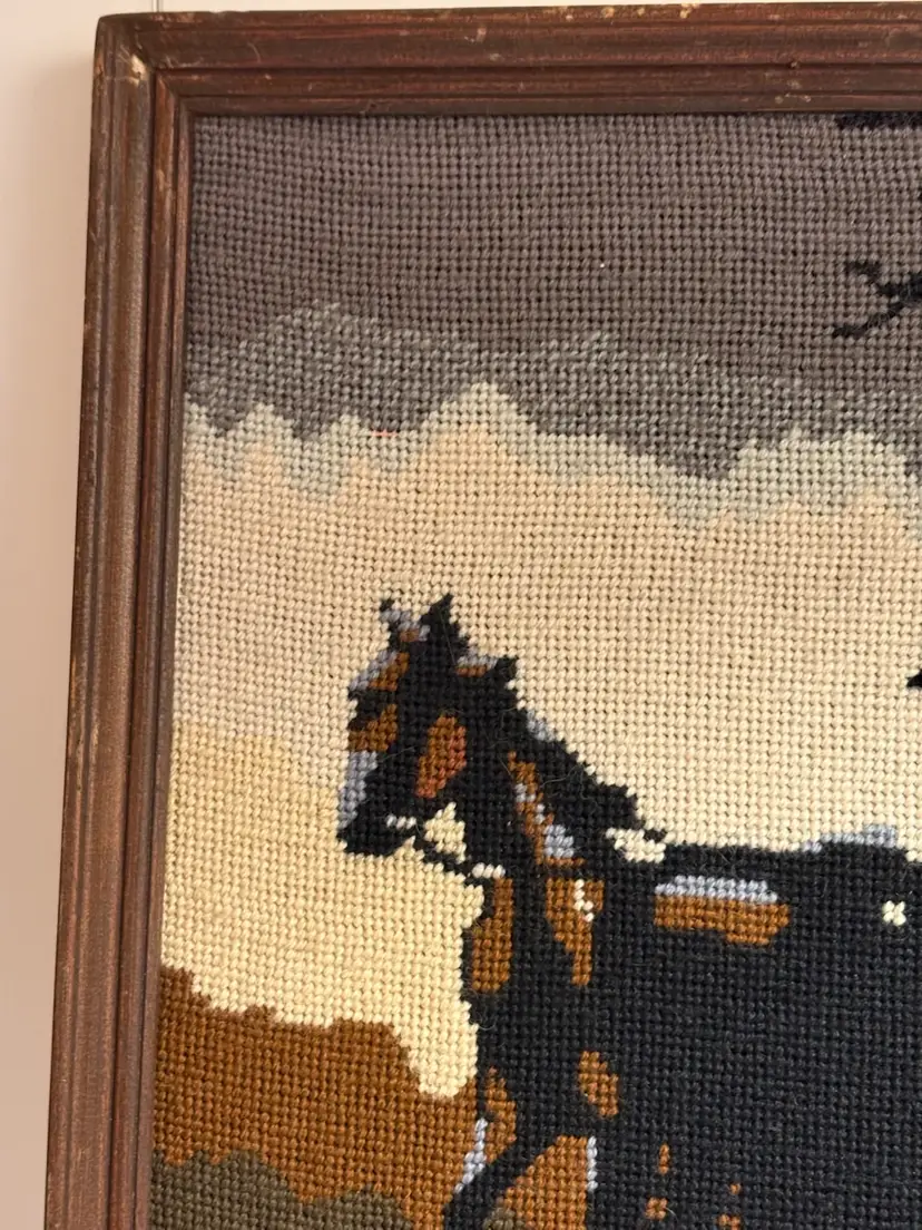 The product is a finished needlepoint piece titled "Silhouette In The Rain” done in 1978. This needlepoint artwork features a silhouette of a figure in the rain, likely created with intricate detail and precision. Needlepoint is a type of embroidery that involves stitching individual yarn through a pre-stretched fabric, such as canvas, to create a detailed and textured design. This piece would make a unique and eye-catching addition to any home decor or as a thoughtful gift for someone who enjoys handmade crafts and artwork.