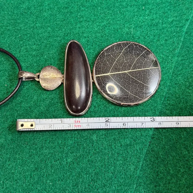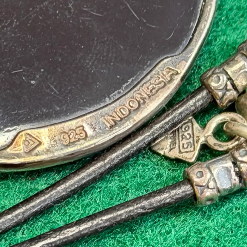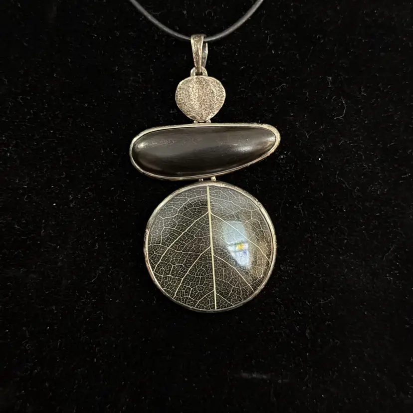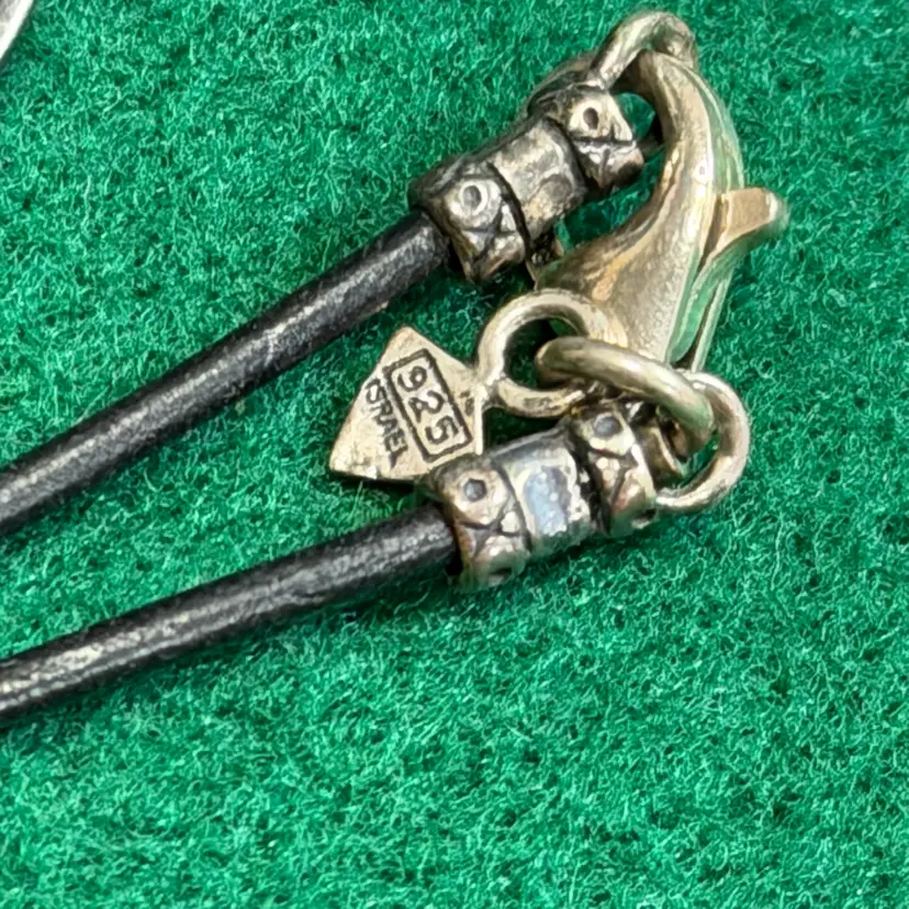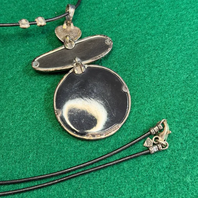 This beautiful necklace was created by Silpada and is marked and acid tested as sterling 925 silver from Indonesia for the pendant and from Isreal for the necklace beads & lobster claw clasp. The cord is about 28 inches and the pendant is about 3-1/4 inches long.