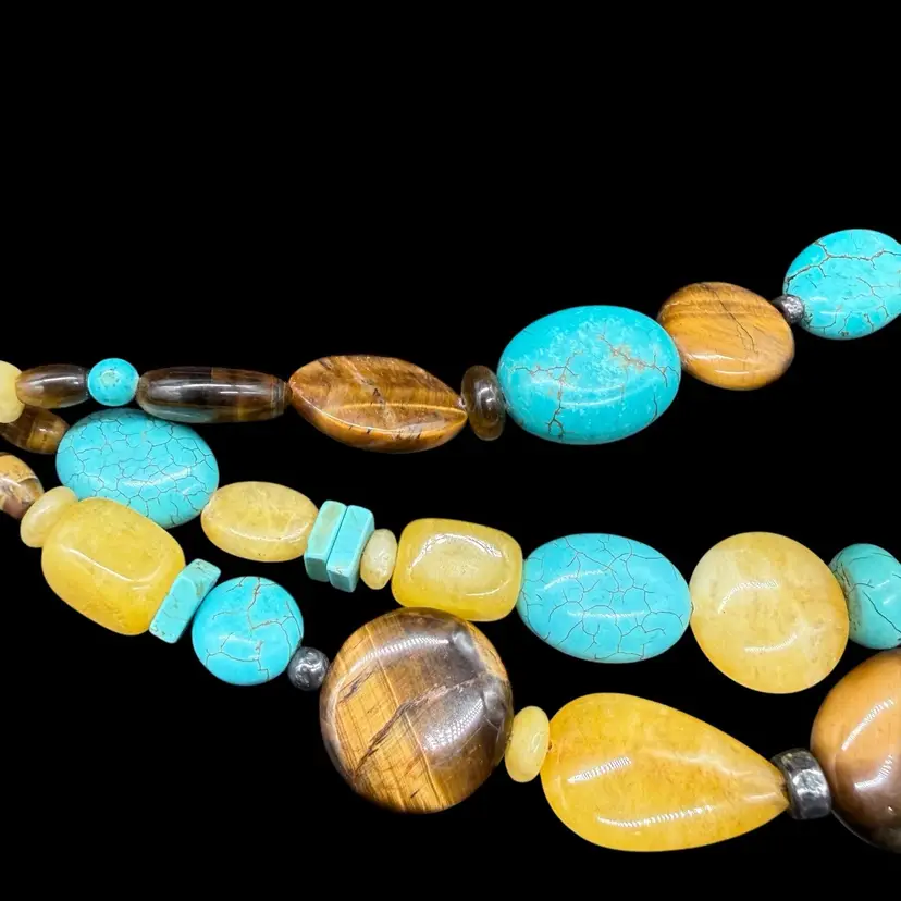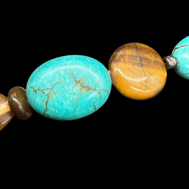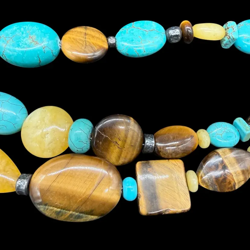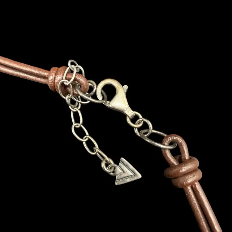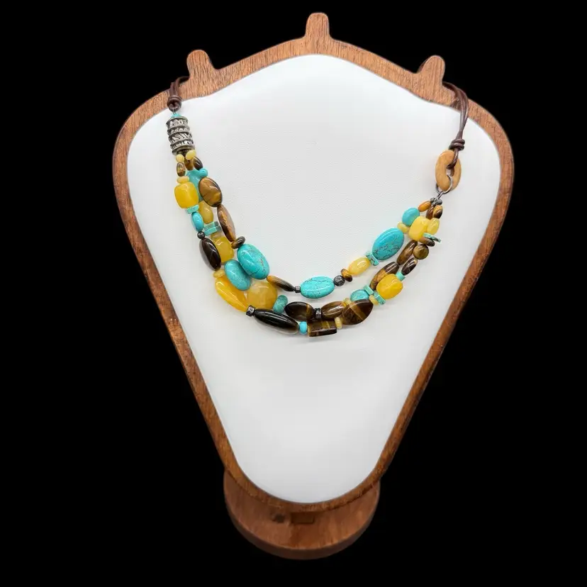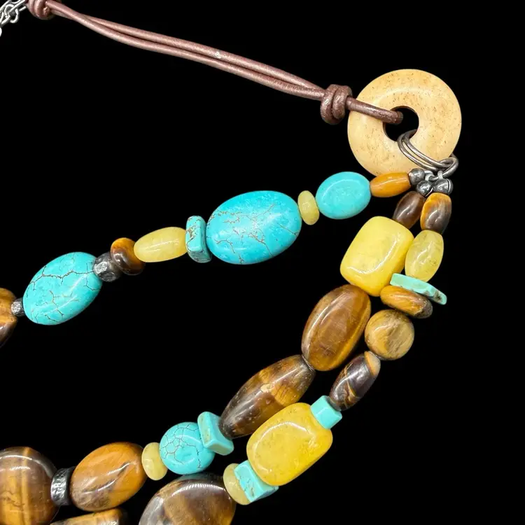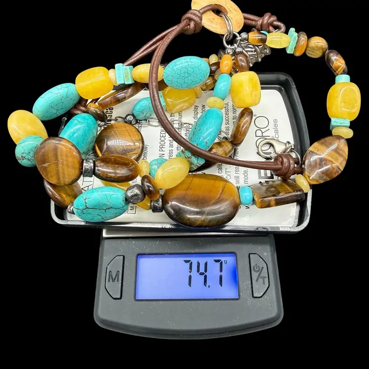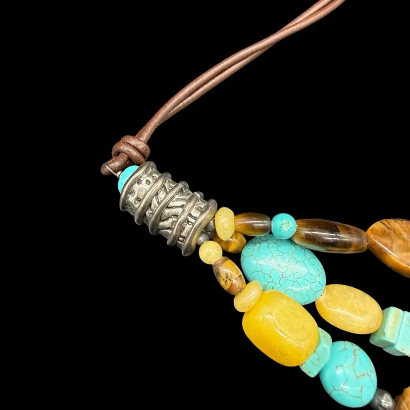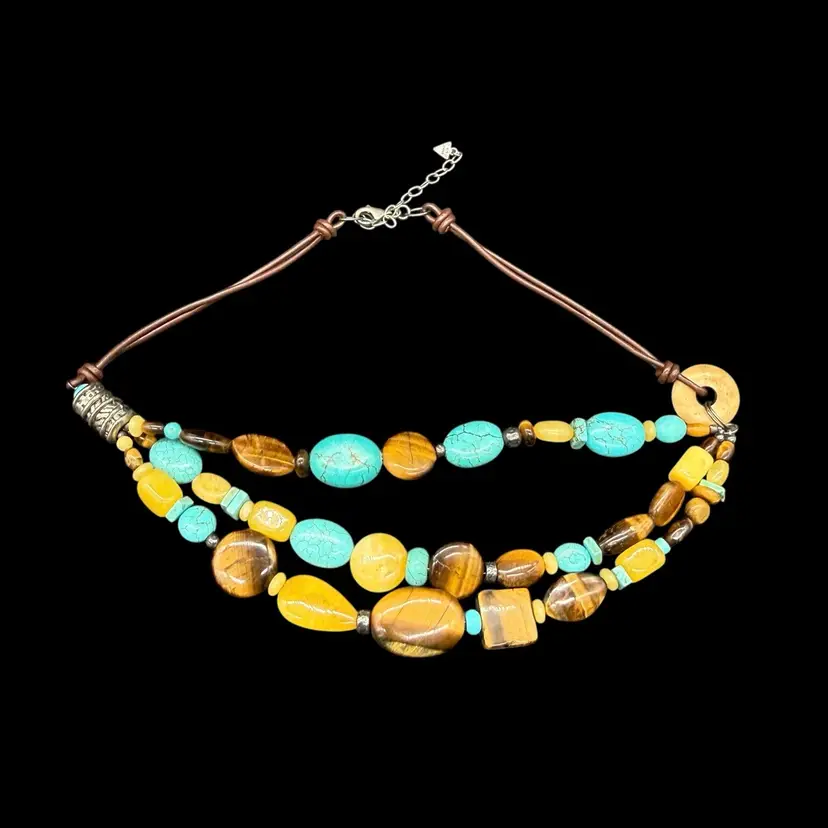 The Silpada Chunky Sterling Silver 3 Strand Genuine Stone Corded Necklace N1858 is a stunning piece of jewelry that features an asymmetrical design and a main stone of stabilized turquoise. The necklace is crafted from high-quality sterling silver with a lobster closure and a leather cord chain. The multicolor design with tiger's eye secondary stones gives it a unique and bohemian style, making it a perfect statement piece for layering or wearing on its own. Signed by Silpada, this necklace embodies beauty, nature, and a western art theme, adding a touch of sophistication to any outfit.